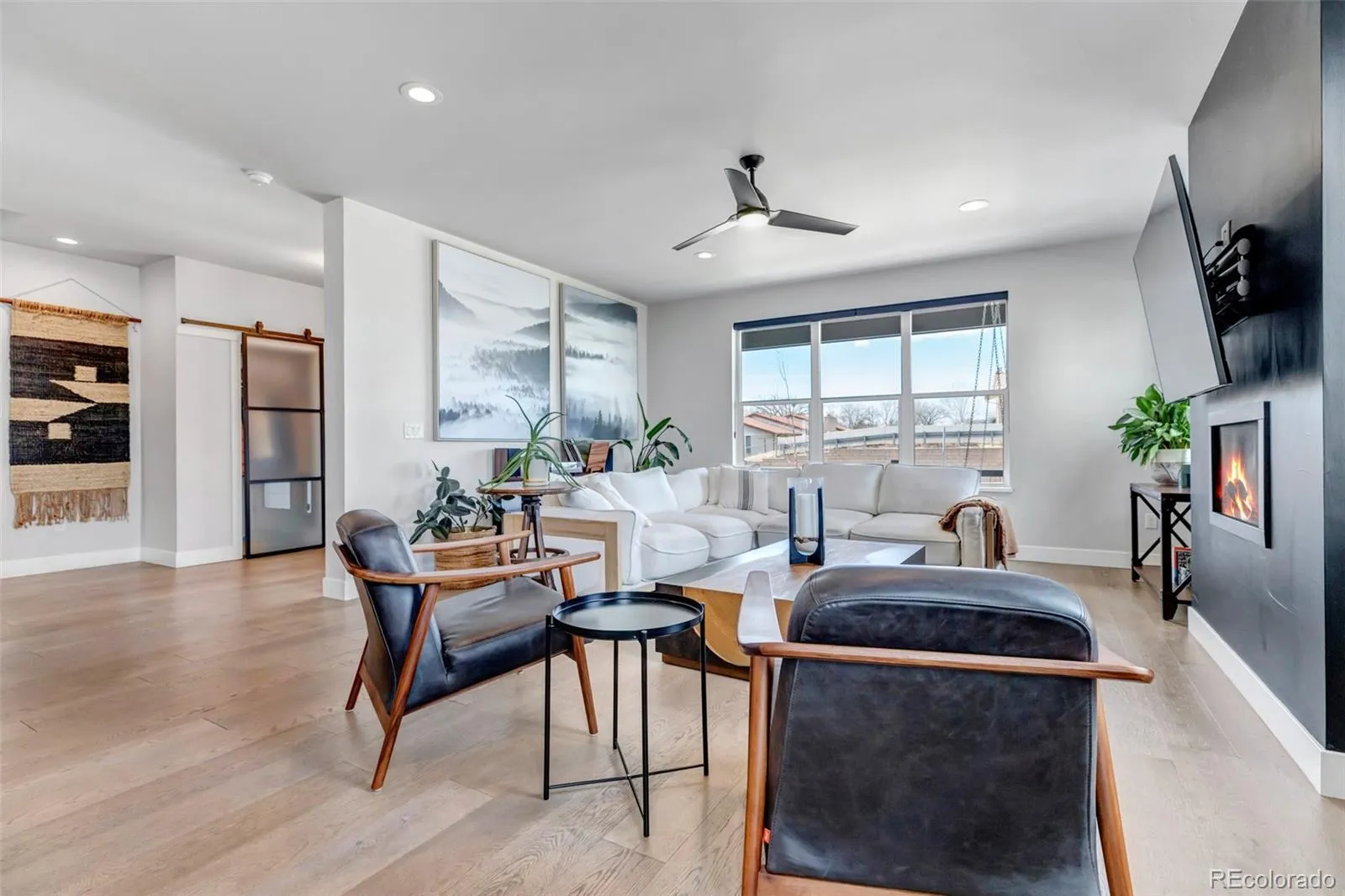 Built in 2021 and offering over 2,300 square feet, this two-story home features wide-plank engineered hardwood flooring throughout the main living areas and upper level, creating warmth and continuity. The light-filled living room is anchored by a dramatic floor-to-ceiling fireplace wall and framed by oversized windows and 10-foot ceilings.