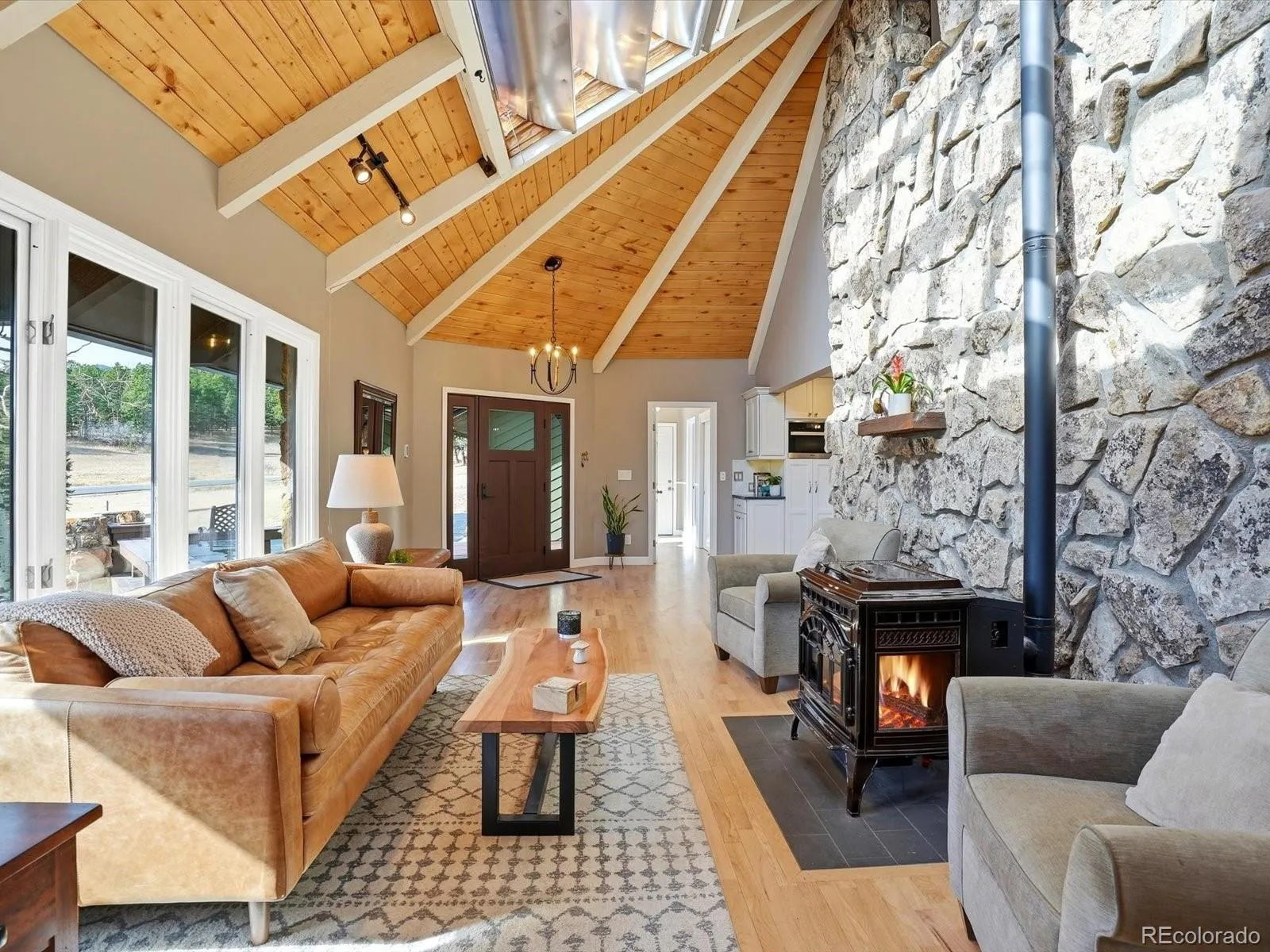 **Home will be active and available for showings starting on Thurs, 2/26. Check back for more photos on Thurs!** If you’ve been dreaming about mountain living that actually feels like mountain living, this is it. Set on nearly 3 acres just 35 minutes from Downtown Denver, this south facing contemporary retreat sits on one of the best lots in the neighborhood. Big trees. Peaceful setting. Wildlife wandering through. The kind of place where you exhale the second you arrive. Inside, vaulted tongue-and-groove ceilings, oversized skylights, and a dramatic stone wall create warmth and light throughout the main living space. The pellet stove adds cozy charm, making it perfect for everything from holiday dinners to après-ski nights. The fully renovated kitchen is built for serious cooking and gathering, featuring a Vent-A-Hood, Miele steam oven and warming drawer, Wolf gas cooktop, Bosch dishwasher, and Jenn-Air refrigerator and oven. The oversized island anchors the space and invites everyone to pull up a seat. The vaulted family room includes a wet bar, wood-burning stove, and cozy reading nook with views, ideal for movie nights or hosting the big game. Two new Fiberon composite decks extend the living space outdoors with multiple areas to grill, dine, and relax in total privacy. The back deck area feels park like, while the front deck is perfect for wine under star-filled skies. Upstairs, the entire level is dedicated to the primary suite with a newly renovated five-piece bath featuring heated floors and a jetted tub. A main-level bedroom works well as a guest room or office, and two lower-level bedrooms share a bath and walk out to a patio. This home is serene, updated, close to Denver, but a world away. Mountain living, done right.