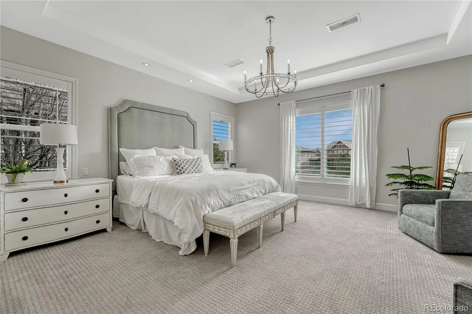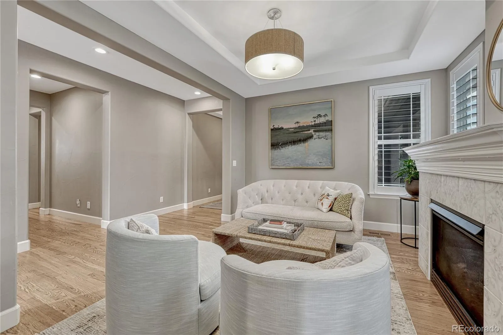 From the moment you enter, the home exudes sophistication, light, and thoughtful detail. A dramatic two-story great room serves as the architectural centerpiece, with expansive windows filling the space with natural light and a striking stone fireplace anchoring the room. The adjacent kitchen flows seamlessly into a generous breakfast nook, perfect for daily living or entertaining. The former formal dining room has been transformed into an intimate sitting salon with a white wood fireplace and artisan tilework. Main-level finishes include hard-surface flooring, smooth troweled walls, updated lighting, and refreshed kitchen, laundry, and bath surfaces. A private guest suite with full bath which can also serve as an office, an elegant powder room, and a functional laundry space complete the main level.