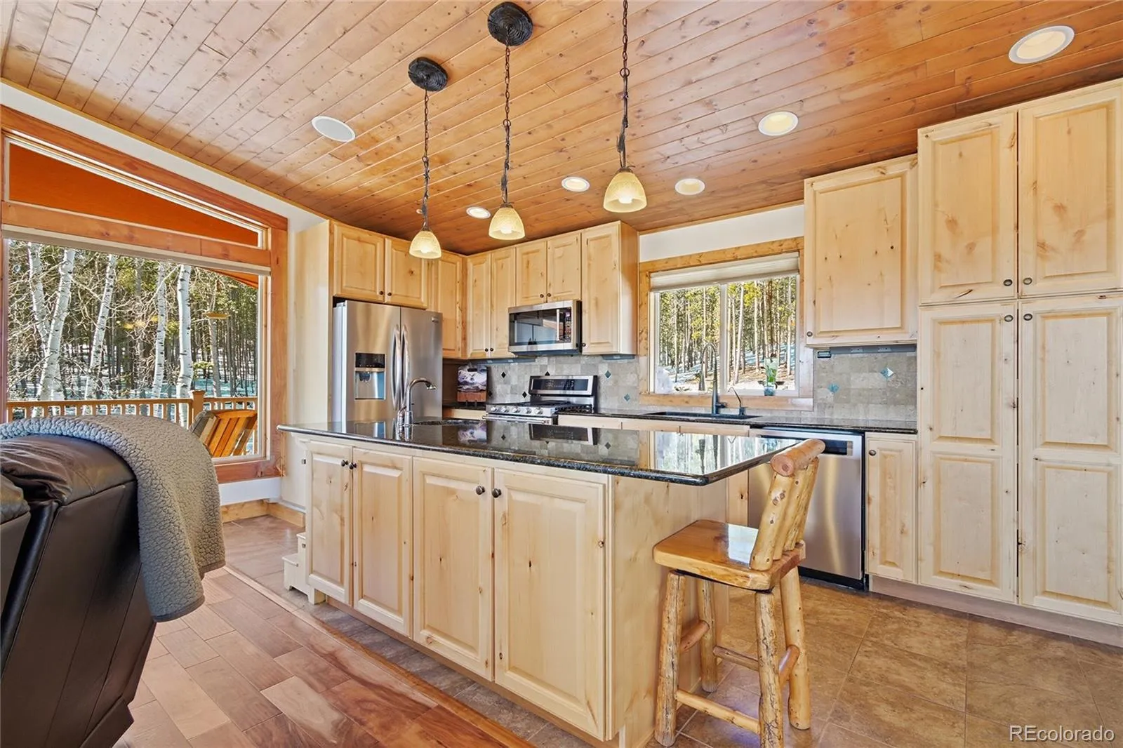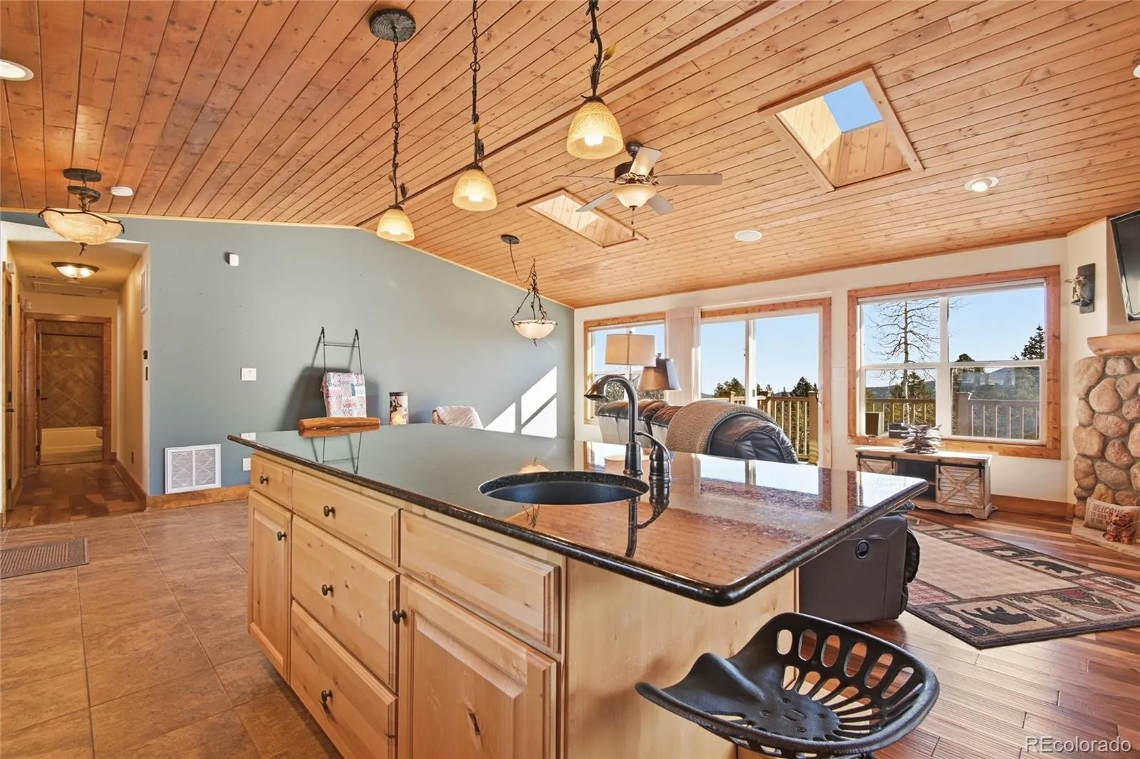 Tucked into 5.45 private acres in Shadow Mountain, this mountain contemporary retreat offers true one level living with beautiful mountain views and the kind of peace you feel the moment you arrive. Inside, the open floorplan is wrapped in warmth with tongue and groove ceilings, vaulted spaces, alder cabinetry, granite counters, and a spacious kitchen island designed for gathering. Large windows flood the great room with natural light and frame forested views in every direction. A gas fireplace anchors the living area, creating the perfect setting for snowy evenings or cool mountain mornings. New flooring runs throughout the home, and central air conditioning, a rare luxury in this area, keeps summers comfortable. The whole home Generac system adds confidence year round. With three bedrooms and two baths all on one level, daily living is effortless and accessible. Step outside onto the composite wraparound decking and enjoy the privacy that only acreage can provide. You cannot see neighboring homes, just trees, sky, and abundant wildlife that regularly wander through. A small spring fed pond adds to the natural charm, while thoughtful fire mitigation provides peace of mind. The oversized detached garage offers two spaces plus additional work area in the third bay, with ample off street parking and dedicated RV space for all your mountain toys. If you have been searching for privacy, functionality, and modern comfort in the foothills, this property delivers all three in one beautifully maintained package.