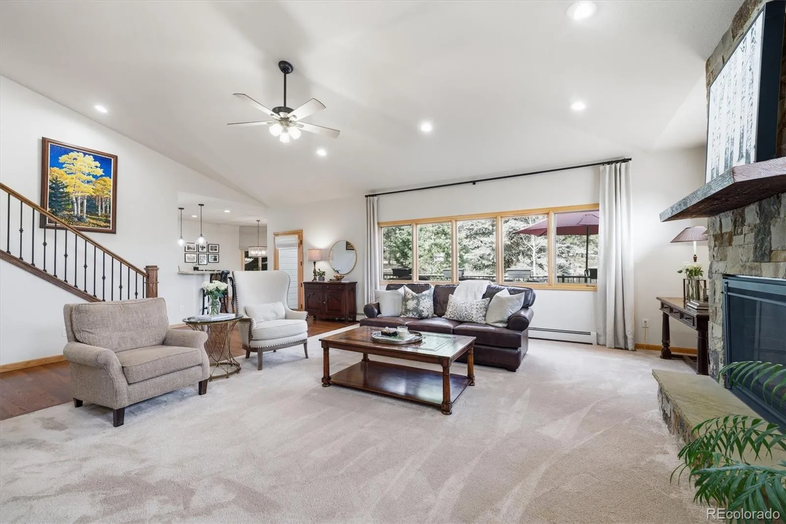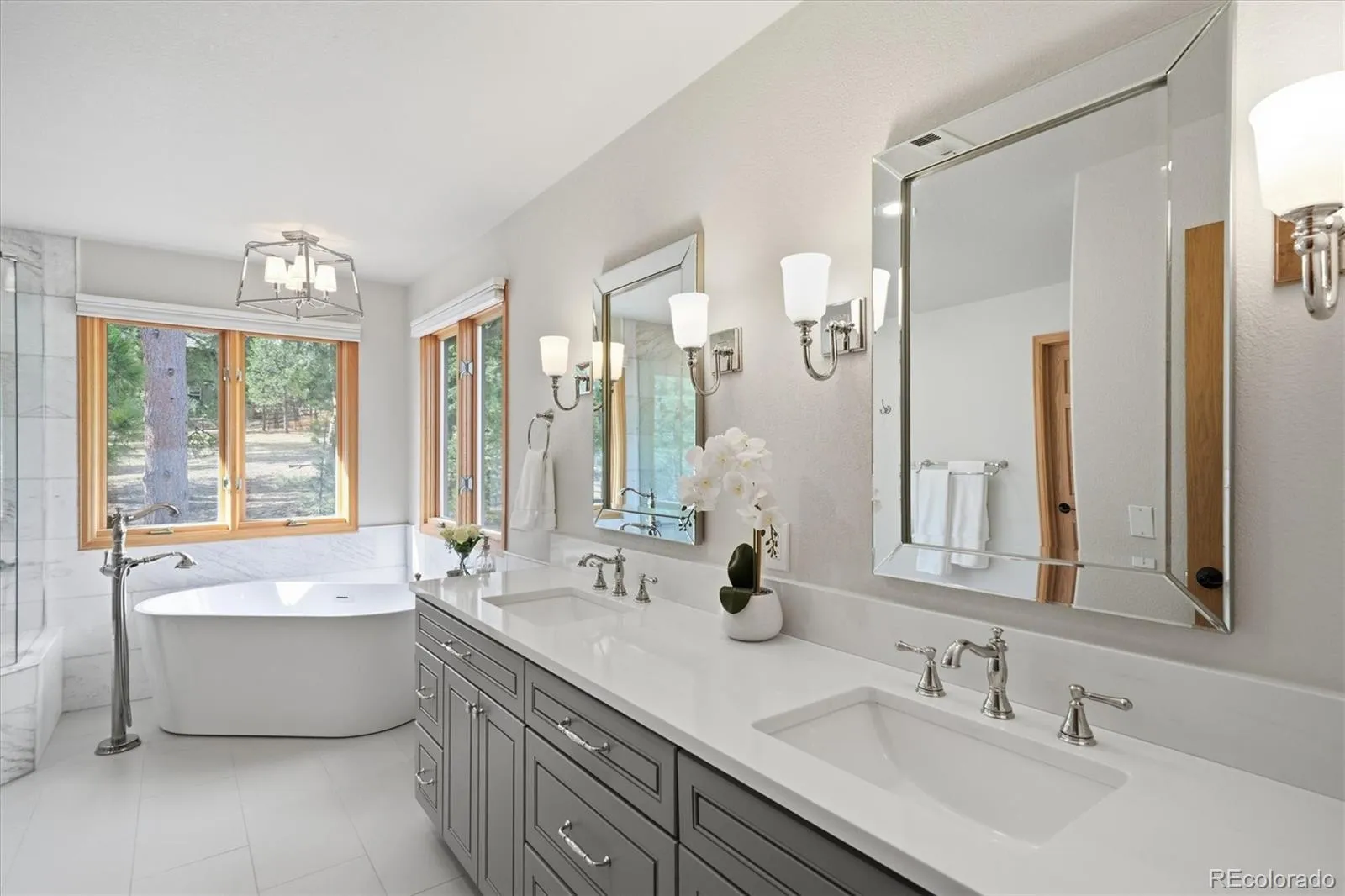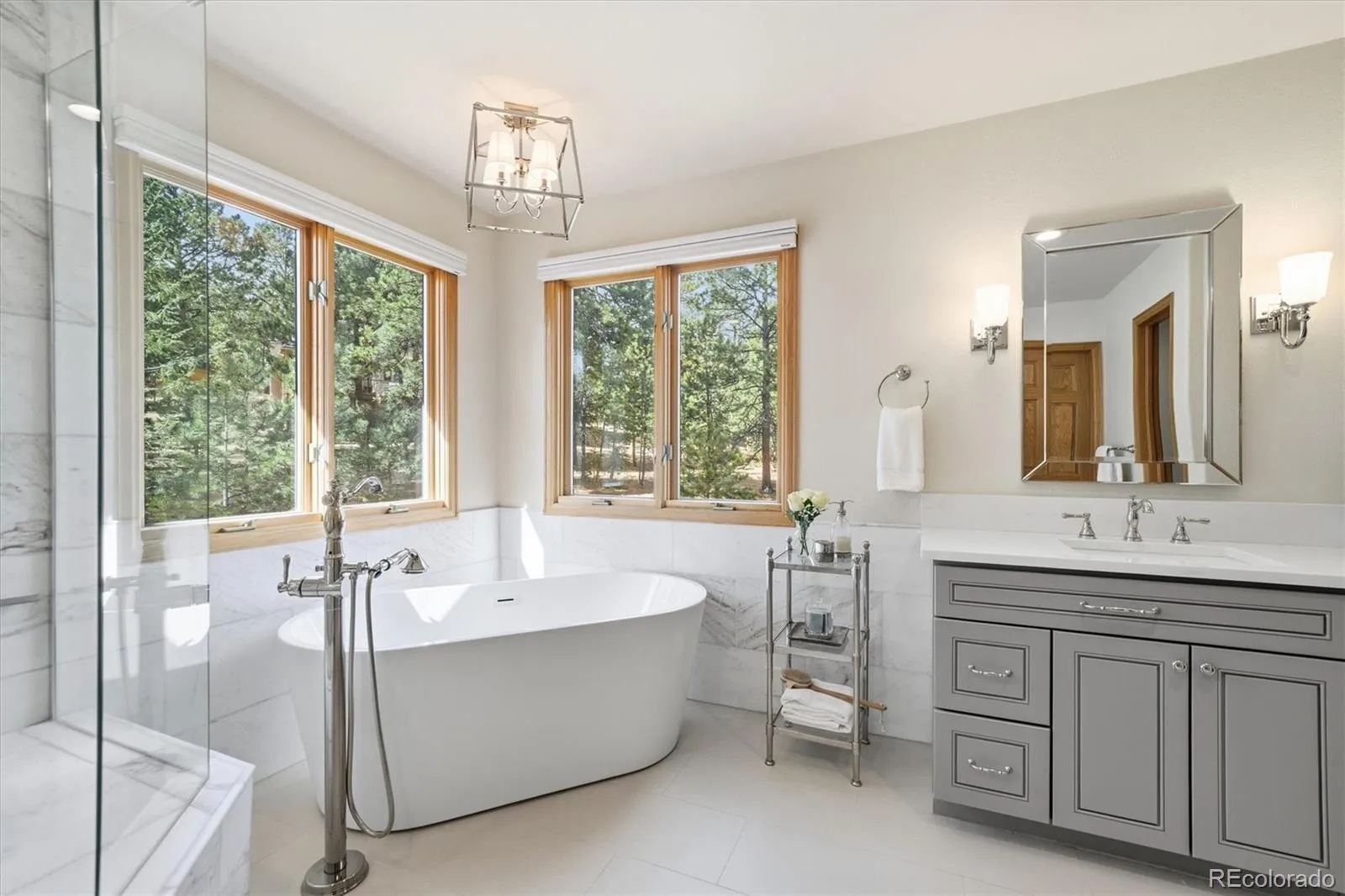 Experience mountain-inspired living in the sought-after Promontory at Soda Creek! This meticulously renovated home combines elegance, functionality & comfort for everyday living & entertaining. Upon entry, a formal dining room & separate office will wow you, while a main floor secondary primary bedroom with ensuite bath provides a private main-floor retreat for multigenerational living or guests. Welcome into the heart of the home, the great room with vaulted ceilings, stone fireplace & picturesque windows flowing seamlessly into the updated chef’s kitchen with generous bar seating & a huge breakfast nook with scenic views. The main area has newly finished oak hardwood floors, fresh paint, carpet & custom window treatments. Upstairs, the primary is a serene retreat with vaulted ceiling, a 3 sided gas fireplace & a cozy sitting area with views of the pines. Step onto the radiant heated floor of your spa-inspired, 5-piece bath where sunshine abounds via retractable window coverings, a soaking tub & a chic glass-enclosed shower. 2 additional bedrooms share an updated hall bath & a 4th upstairs bedroom features a 3/4 ensuite. Head out the back door to an oasis in the pines to enjoy the sunrise or sunset. The tranquil water fall will soothe your senses as make your way to a private hot tub nestled on its own deck. No doubt, you will soon forget how close you are to all of the nearby conveniences as you bask in serenity. But it is there, easy access to the shops of Bergen Park, the quintessential shops & eateries in downtown Evergreen, the Buchanan rec center & the trails of Elk Meadow. Echo Mountain is nearby for alpine sports! Add’l highlights include a main-floor laundry/mudroom off the 3-car garage, a huge pantry & a walk-out basement featuring a family room, full bath & storage galore! This beautiful home blends refined living with Colorado’s outdoor lifestyle. Too many amenities to list! Come see it today as this home won’t last long!