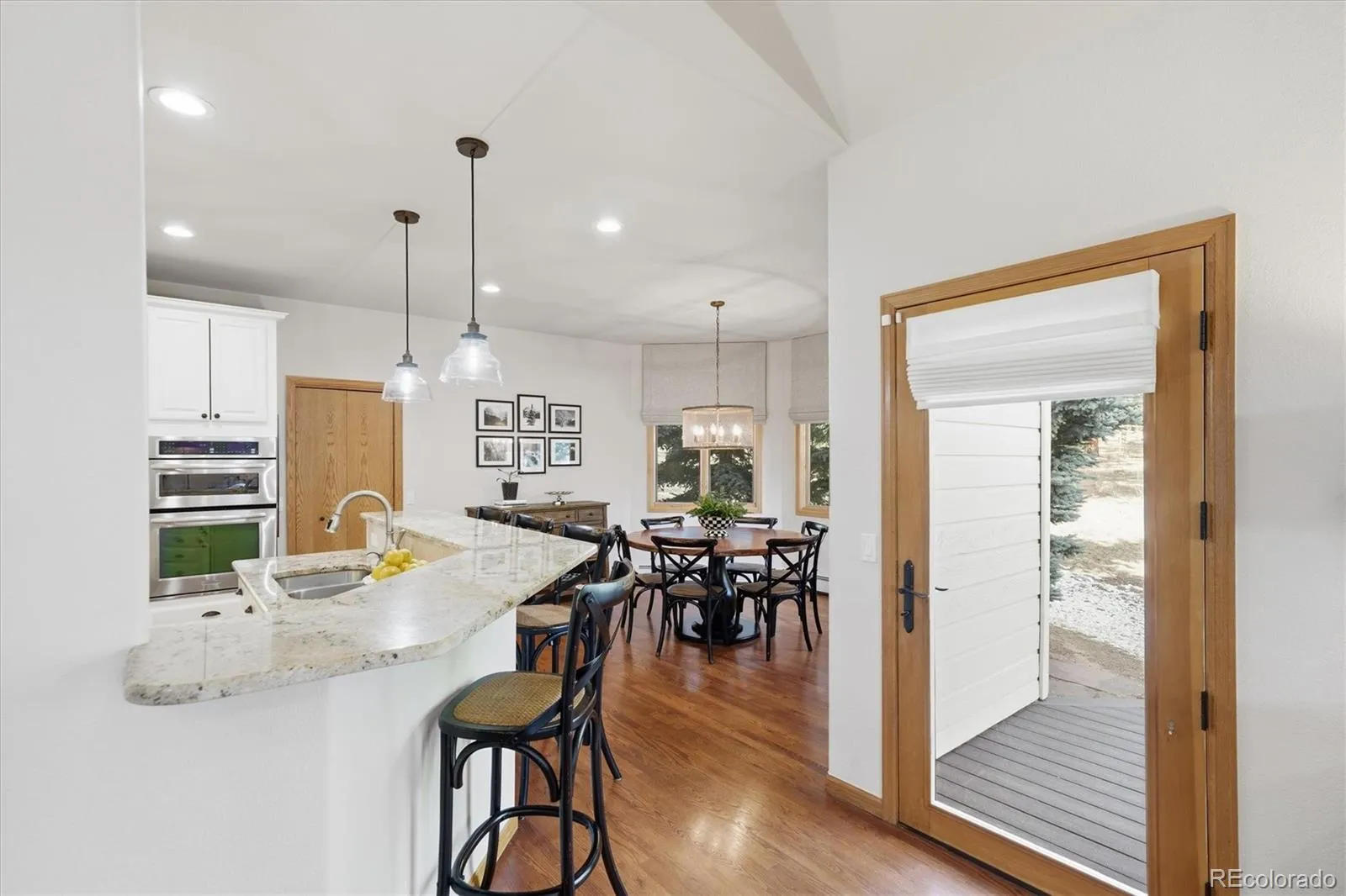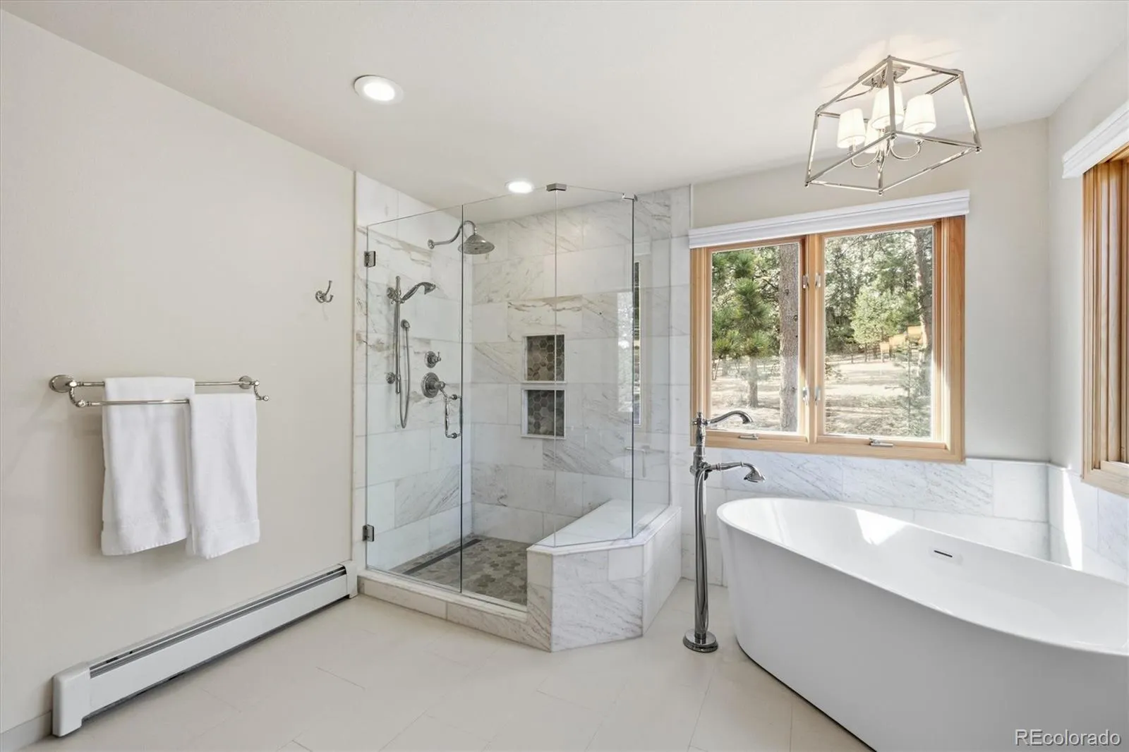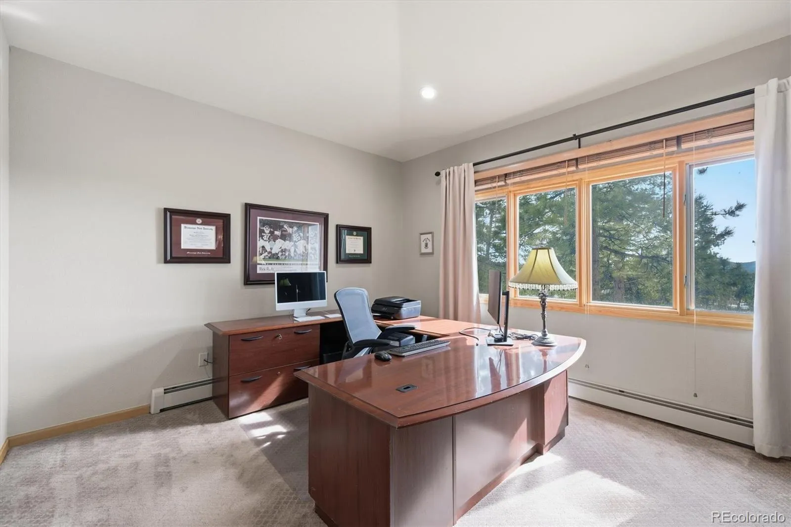 Experience mountain-inspired living in the sought-after Promontory at Soda Creek! This meticulously renovated home combines elegance, functionality & comfort for everyday living & entertaining. Upon entry, a formal dining room & separate office will wow you, while a main floor secondary primary bedroom with ensuite bath provides a private main-floor retreat for multigenerational living or guests. Welcome into the heart of the home, the great room with vaulted ceilings, stone fireplace & picturesque windows flowing seamlessly into the updated chef’s kitchen with generous bar seating & a huge breakfast nook with scenic views. The main area has newly finished oak hardwood floors, fresh paint, carpet & custom window treatments. Upstairs, the primary is a serene retreat with vaulted ceiling, a 3 sided gas fireplace & a cozy sitting area with views of the pines. Step onto the radiant heated floor of your spa-inspired, 5-piece bath where sunshine abounds via retractable window coverings, a soaking tub & a chic glass-enclosed shower. 2 additional bedrooms share an updated hall bath & a 4th upstairs bedroom features a 3/4 ensuite. Head out the back door to an oasis in the pines to enjoy the sunrise or sunset. The tranquil water fall will soothe your senses as make your way to a private hot tub nestled on its own deck. No doubt, you will soon forget how close you are to all of the nearby conveniences as you bask in serenity. But it is there, easy access to the shops of Bergen Park, the quintessential shops & eateries in downtown Evergreen, the Buchanan rec center & the trails of Elk Meadow. Echo Mountain is nearby for alpine sports! Add’l highlights include a main-floor laundry/mudroom off the 3-car garage, a huge pantry & a walk-out basement featuring a family room, full bath & storage galore! This beautiful home blends refined living with Colorado’s outdoor lifestyle. Too many amenities to list! Come see it today as this home won’t last long!