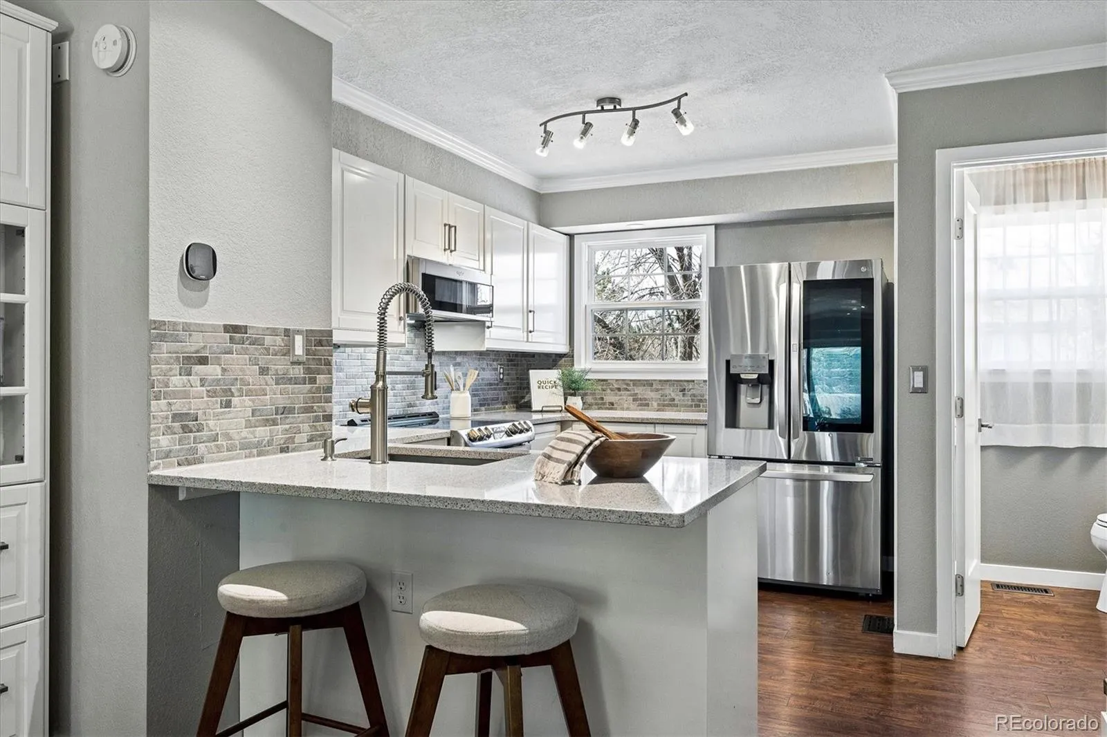 Simply the Best! Refined & Smart Updates in this 2 Bed, 2 Bath townhome with Attached Garage in desirable Peachwood community. Feeds to Cherry Creek Schools! Great location within neighborhood near the end of only no-outlet street for minimal traffic flow. Enter to find extensive low maintenance engineered hardwood flooring & upgraded baseboards throughout most of the home. Take a peek at the mountains from the front windows! Flowing floorplan with Great Room living & sizeable rooms has tasteful crown molding throughout the main level. Fall in love with the semi-custom, remodeled kitchen with expanded footprint & peninsula – rare in this price range! Kitchen boasts upgraded soft-close cabinets w/lower drawers, extensive Silestone counters & stylish tile backsplash, high-end stainless steel appliances. Also added: built-in wall shelves, large built-in cabinet/hutch & over/under cabinet lighting. Expanded peninsula has upgraded sink w/pro faucet & bar seating; opens to Dining area with newer light fixture. Family Room features new recessed can lighting, corner wood-burning fireplace & access to recently upgraded, private deck- custom extended size with added stairs & gate – unique to this property! Main floor 1/2 Bath is tastefully updated. Upstairs find the Primary Bedroom w/peaked ceiling & fan, large wall closet & door to updated 4-pc Bath. Bed #2 has Brand New Carpet & large wall closet, fan. Head to the lower level to access the oversized/deep 1-car garage with included workbench & space for parking. Home sits across from guest lot for additional car. Laundry/Utility Room includes washer/dryer & utility sink plus more storage. Newer Features: Interior Paint, Double Hung Windows (Upper Fl), HVAC, Door Hardware, Water Purifier/Whole House Back Flush system. Excellent locality within walking minutes to grocery, shopping, services. Central to I225, DIA, Buckley SFB, DTC & Downtown. Easy 2 min walk to neighborhood pool without crossing larger roads. Buyer’s Warranty!