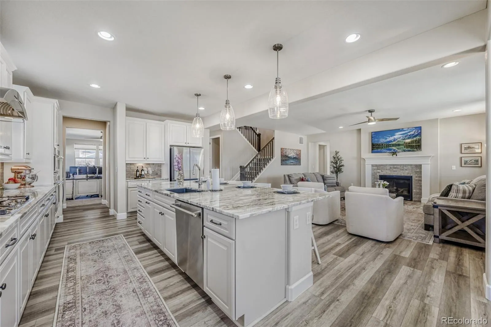 The main level features 9 foot ceilings, wide plank LVP flooring, gas fireplace with brick surround, and an open concept great room. A main floor office and formal dining or flex space add versatility.