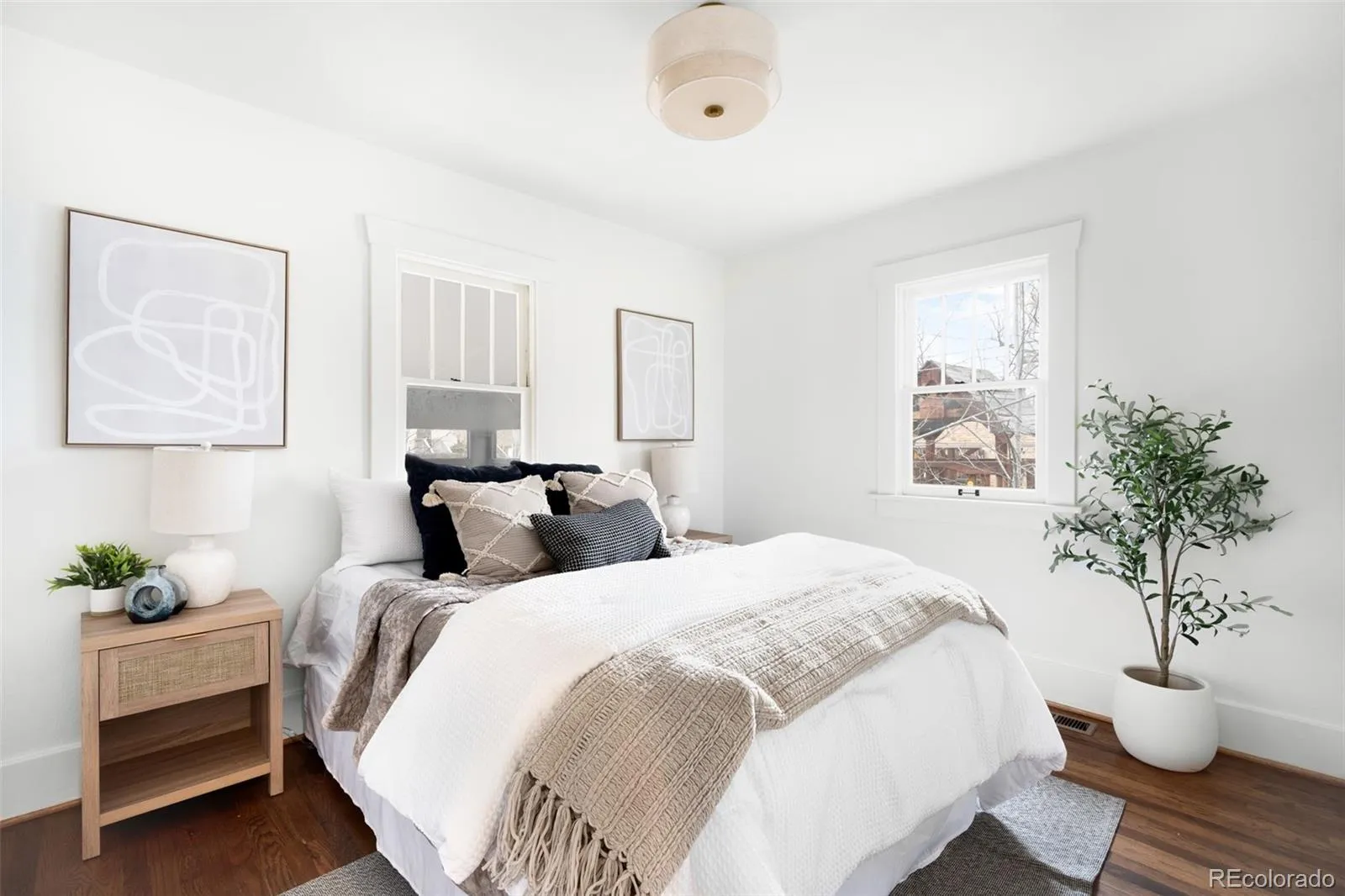 Two main-floor bedrooms are located near a beautifully remodeled Porcelanosa-tiled full bathroom.
