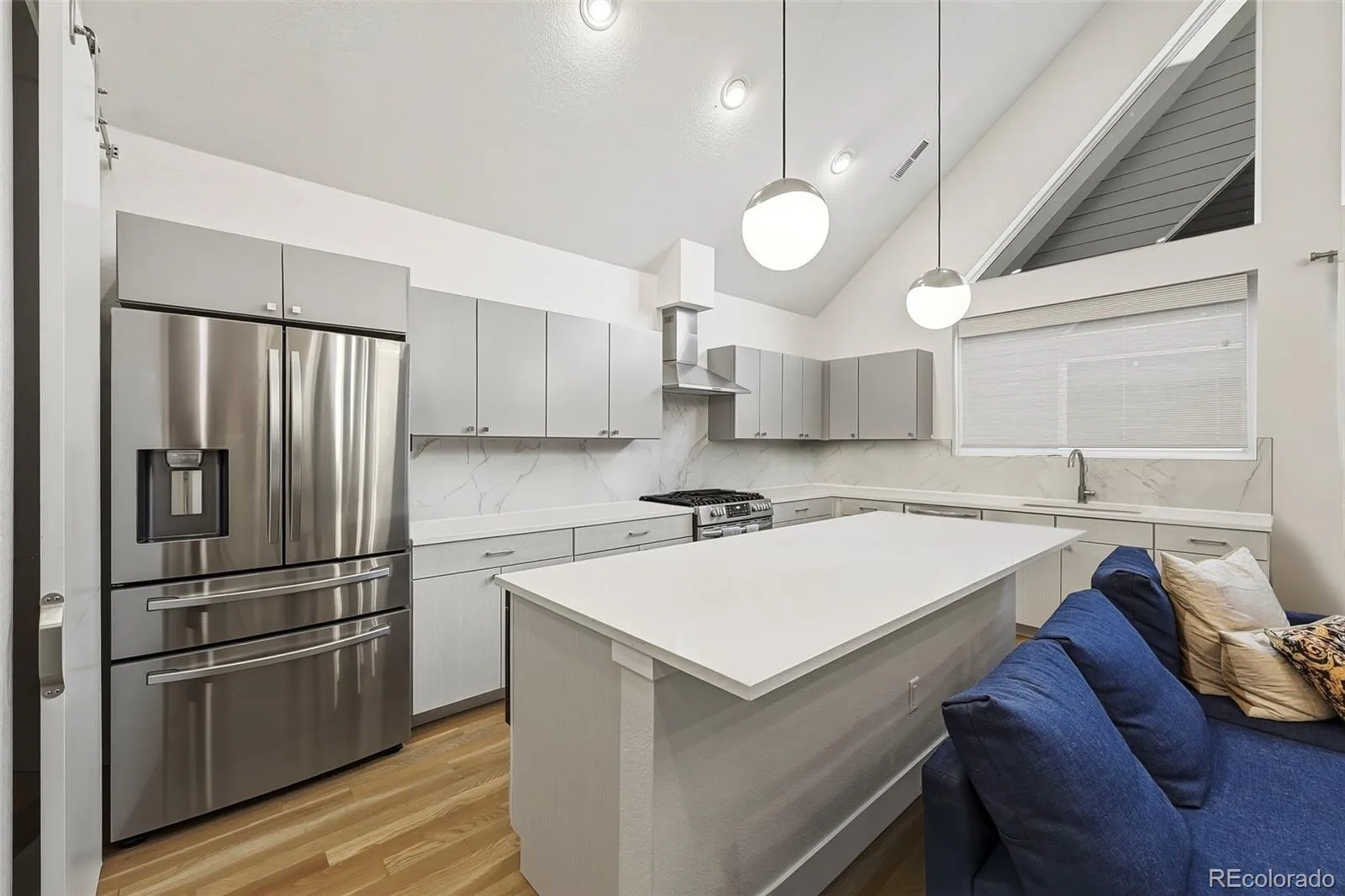 The upper level opens up with vaulted ceilings, hardwood floors, and a kitchen that earns its place as the centerpiece with quartz countertops, gas cooktop, French-door refrigerator, pendant lighting, and an island with seating. Open to the living room, it’s the kind of layout that makes entertaining effortless. A dining area and powder bath round out the open-concept living.
