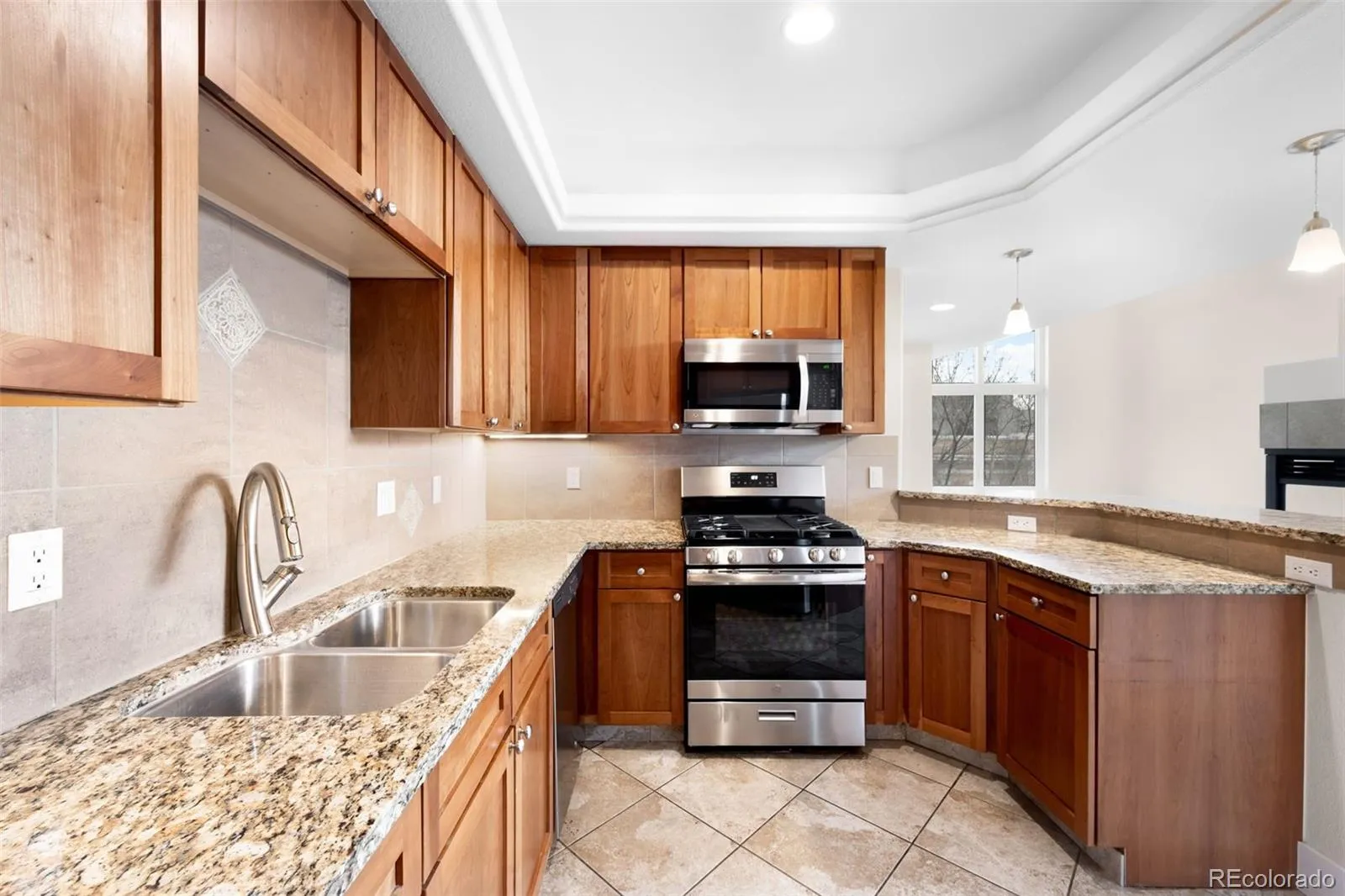 Soaring ceilings and large windows flood the main level with natural light, framing city and mountain views — including a striking view of the Capitol dome. The open-concept living and dining area flows seamlessly into the kitchen, complete with granite countertops, stainless steel appliances, and rich cherry cabinetry. Brand-new carpet runs throughout, and major systems including the furnace and A/C were replaced in 2022 for added peace of mind. Two main windows were also replaced in 2025.