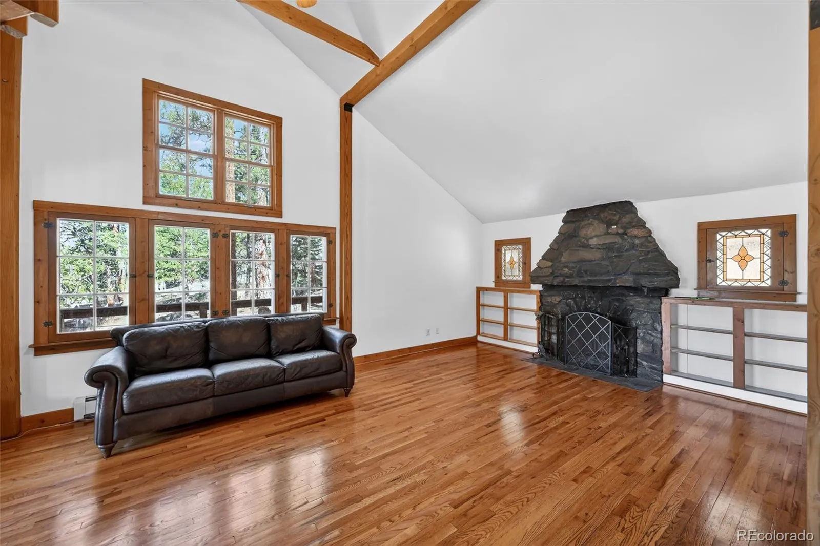 Expansive windows and soaring vaulted ceilings flood the home with natural light, highlighting rich wood finishes and framing serene forest views. At the center of the living space, a dramatic floor-to-ceiling stone fireplace creates a warm and inviting focal point. The thoughtfully designed open-concept layout flows effortlessly into a beautifully appointed kitchen featuring stainless steel appliances, and generous prep space, ideal for both everyday living and entertaining.
