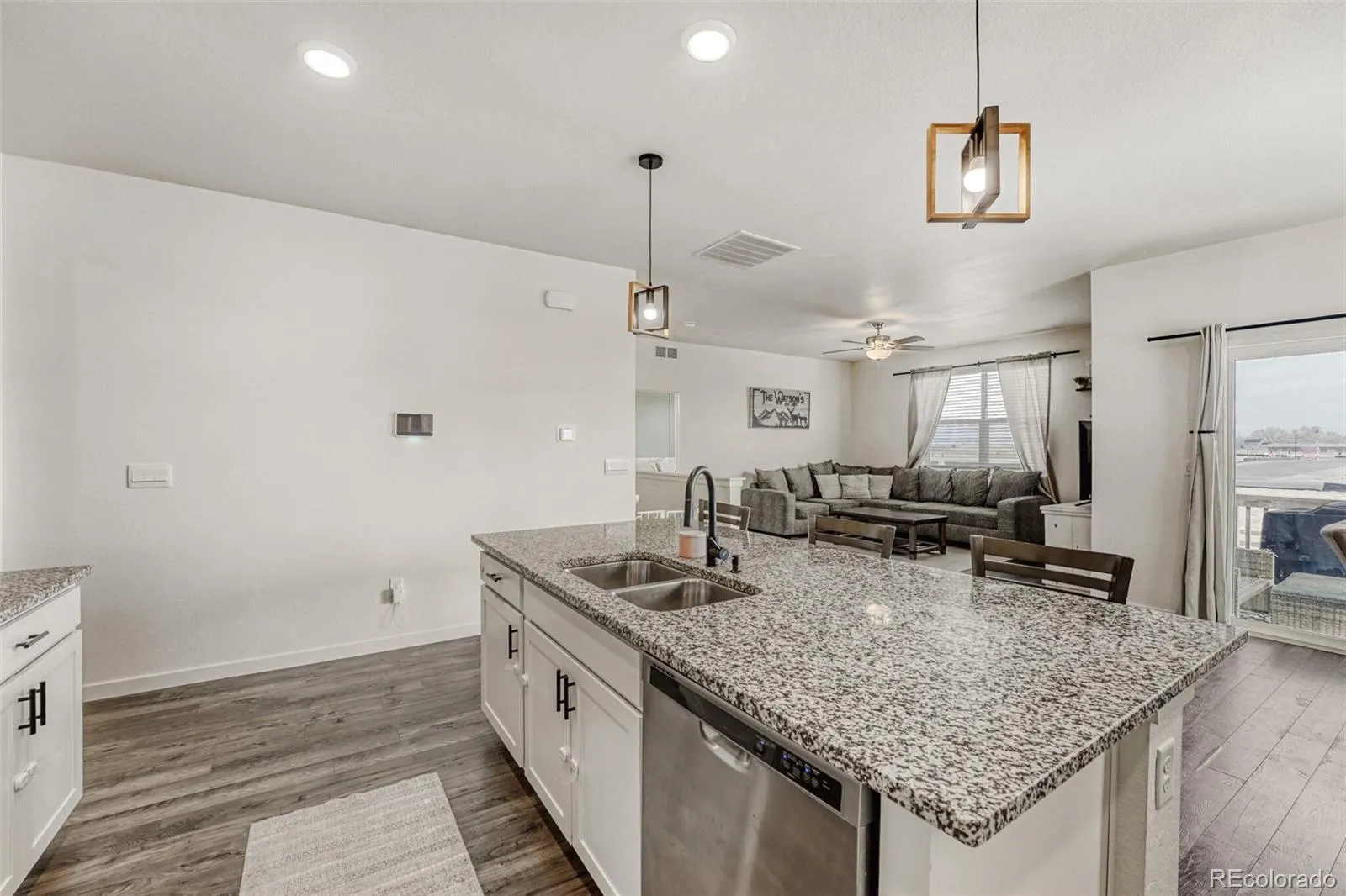 The bright open-concept main level is filled with natural light and features a spacious living area and a stunning kitchen complete with granite countertops, stainless steel appliances, ample cabinetry, a walk-in pantry, and a double oven — with the lower oven offering a convection option, perfect for holiday meals or everyday cooking.