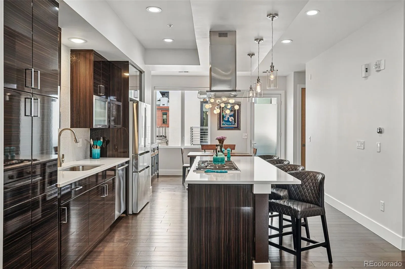 Welcome to contemporary luxury living in the heart of Denver’s vibrant LoHi neighborhood. This stunning modern townhome offers exceptional design, thoughtful upgrades, and breathtaking cityscape and mountain views—all with no HOA. Spread across four spacious levels, this home features a bright, open layout perfect for everyday living and unforgettable entertaining. The gourmet kitchen is a chef’s dream, featuring Thermadore cooktop, Bosch stainless steel appliances, quartz countertops, modern cabinetry, a walk-in pantry, and a large island ideal for gatherings. A private balcony with a gas line just off the kitchen makes outdoor cooking easy. The spacious dining room is perfect for friends to enjoy a meal together. The eye-catching living area features a sleek gas fireplace with a custom surround by local artist Steve Fast. Head upstairs to the luxurious primary suite, which includes a double shower with a translucent wall for natural light, and a walk-in closet fitted with a Closet Factory system to keep your wardrobe organized. Secondary bedrooms each offer ensuite baths—perfect for guests, roommates, or a home office setup (one on the same level as the primary bedroom and the other on the lowest level near the garage). The spacious top-floor flex space includes a wet bar, dishwasher, beverage fridge, half bath, and opens to a spacious rooftop deck with panoramic city and mountain views. The rooftop deck is fully equipped with gas and water lines and wired for sound—ideal for outdoor entertaining and that hydroponic garden you dream of. Other features include retractable screens (on 3rd floor sliding doors and in primary bedroom), motion-sensor lighting in bathrooms and closets, ceiling fans, smart thermostat, and a heated two-car garage with epoxy floors, drywall, shelving, and 220V power. Located just steps from Denver’s top dining, bars, parks, and boutiques galore, this home offers luxury, location, and long-term value—without compromise.