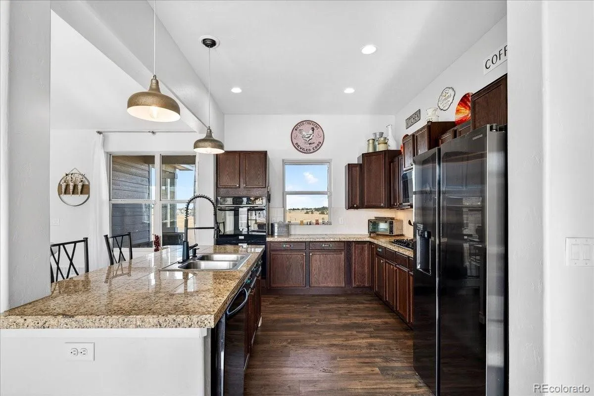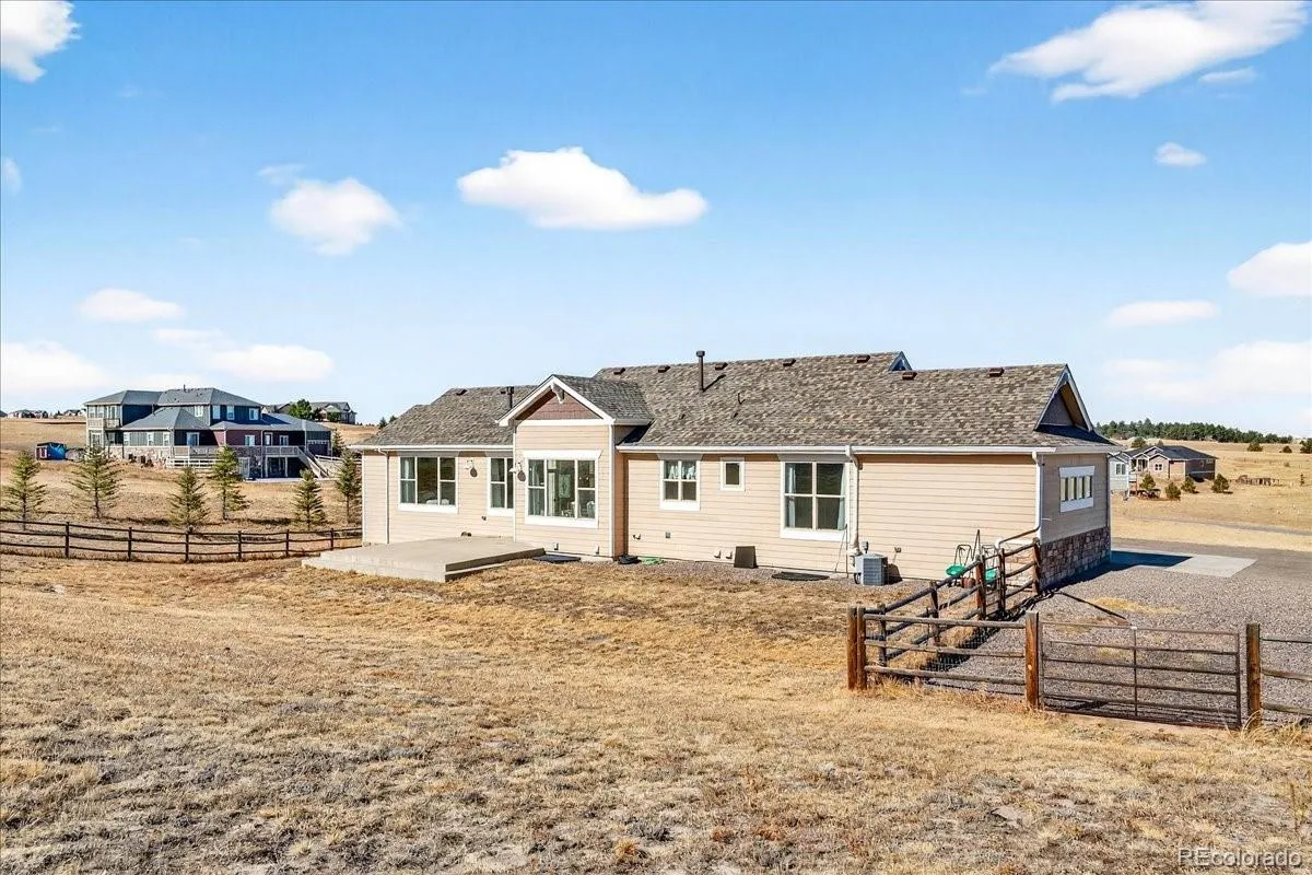 Experience the perfect blend of space, privacy, and modern Colorado living in this beautifully maintained ranch home on 5.02 private acres. Built in 2015, this 4-bedroom, 3-bath residence offers 3,323 total square feet with a full basement and a highly desirable open-concept floorplan. The main level is filled with natural light and features rich LVP flooring, a cozy fireplace, and seamless flow between the living, dining, and kitchen areas which are ideal for both everyday living and entertaining. The kitchen showcases granite countertops, stainless steel appliances, double ovens, generous cabinetry, and a large island with seating. The spacious primary suite includes a large walk-in closet and private bath. Downstairs, the finished basement offers incredible additional living space, highlighted by a custom rustic bar with brick accents and wood detailing, perfect for hosting gatherings or game nights. Enjoy wide-open views and room to roam on the expansive lot, offering privacy and flexibility for outdoor living. A large 3-car garage provides ample storage for vehicles, tools, and toys. Outside? This is where the possibilities really begin. Bring your horses. Build a shop for your toys. Create the outdoor lifestyle you’ve always wanted. With 5.02 acres of privacy, this property is ready to make your own. Ideally located with convenient access to Elizabeth, Franktown, Castle Rock, and Parker, this property offers the serenity of acreage living with easy access to nearby amenities.