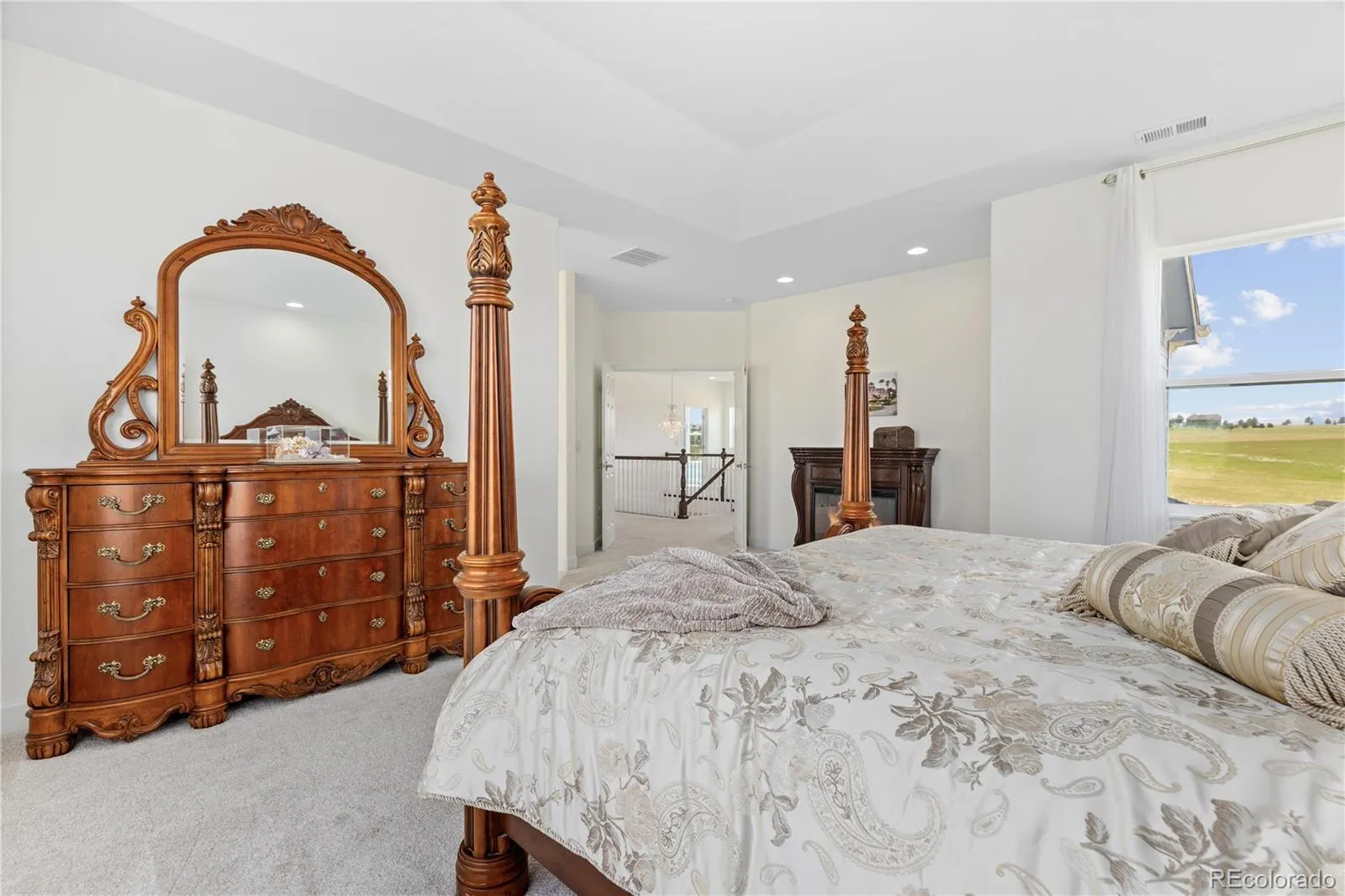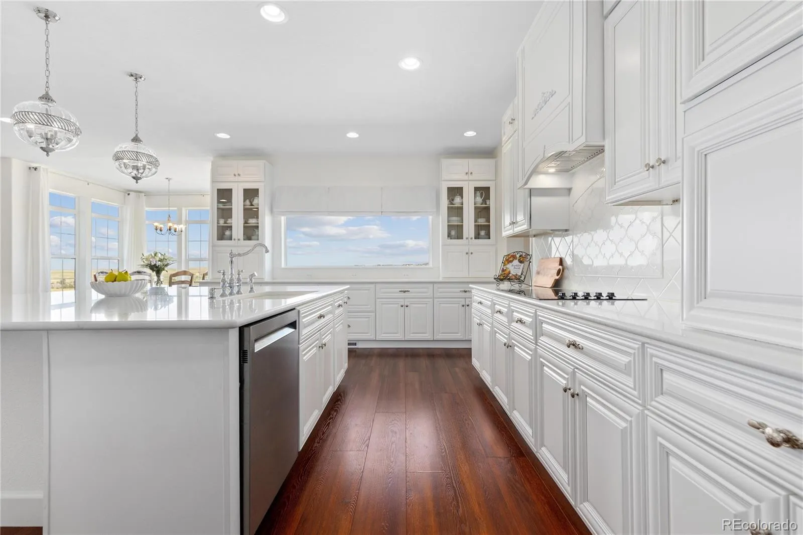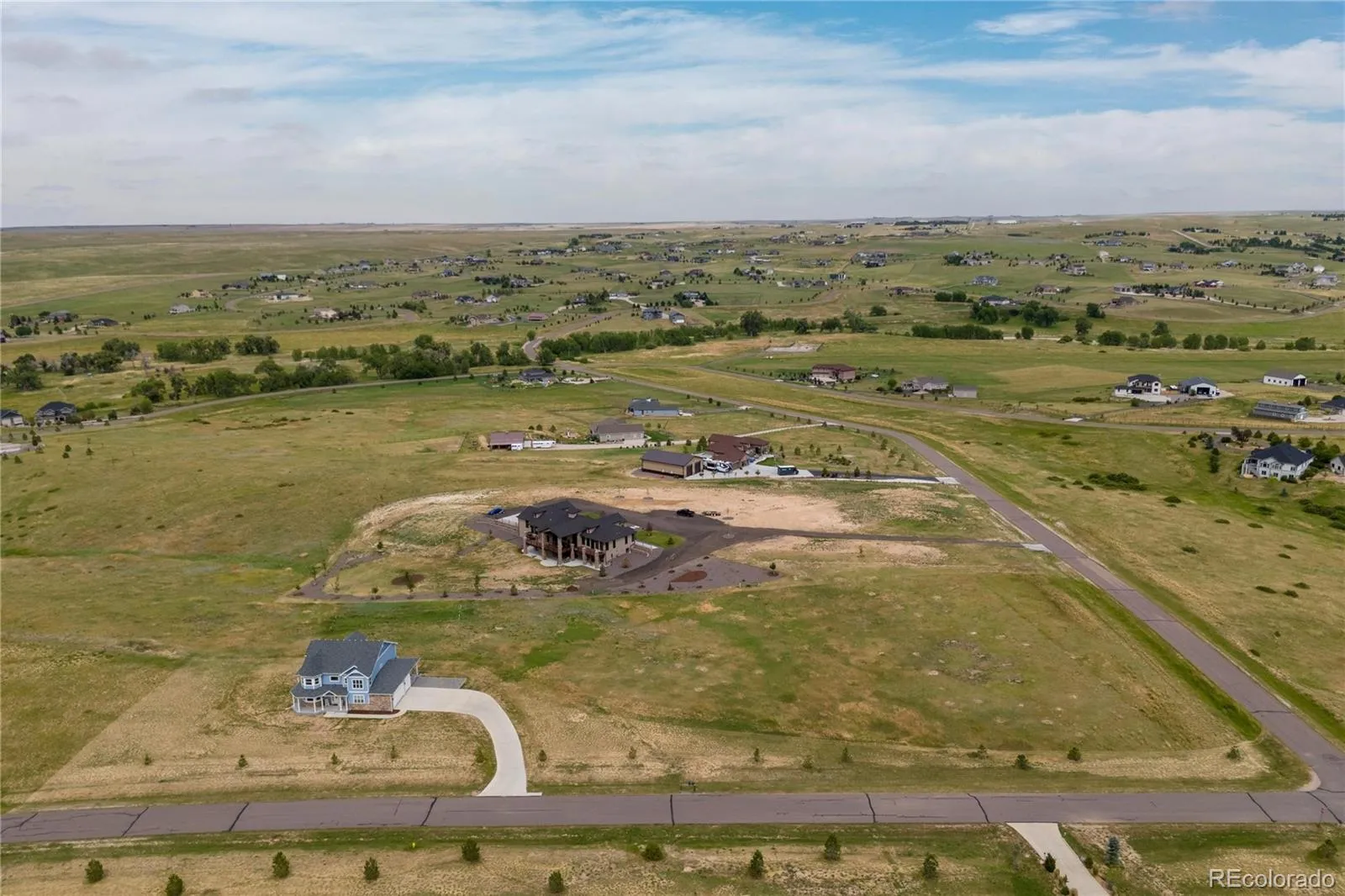 Welcome to this immaculate custom two-story estate set on five peaceful acres in the highly sought-after Elkhorn Ranch community. Offering six bedrooms, five bathrooms, and a dedicated study, this exceptional home delivers refined design, generous scale, and effortless livability. The sun-filled main level features wide hallways and an open-concept layout that flows beautifully from one space to the next. At the heart of the home, the chef’s kitchen combines style and function with quartz countertops, double ovens, stainless steel appliances, an oversized island, abundant cabinetry, a walk-in pantry, and a discreet appliance garage, all framed by sweeping sunset views. Luxury vinyl plank flooring and plush carpet add warmth throughout the main level, while luxury vinyl tile in every bathroom creates a cohesive, low-maintenance finish. The primary suite is a true retreat, complete with marble countertops, a full marble shower, and a soaking tub designed for relaxation. Secondary bathrooms feature granite counters, and every bedroom includes a walk-in closet. The second floor is already plumbed for a washer and dryer, offering additional convenience. The finished basement is built for entertaining, with plumbing in place for a wet bar, wiring for a pool table, a state-of-the-art theater room, and ample storage space. Additional upgrades include a whole-house water filtration system, a spacious wrap-around porch ideal for quiet mornings and evening gatherings, and newly planted trees installed in Spring 2025. Enjoy rolling hills, expansive prairie views, and star-filled skies in a friendly, tight-knit community, all while being just minutes from downtown Parker and Southlands Mall. This is elevated Colorado living that offers privacy, beauty, and modern comfort without sacrificing convenience.
