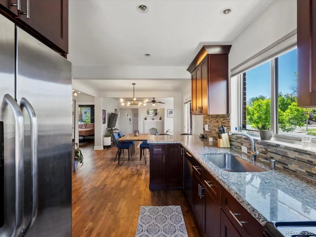 Original details—including coved ceilings, arched openings, and large windows—create warmth and natural light throughout. The main level features refinished hardwood floors and an open layout with clear sightlines from front to back. The updated kitchen includes granite counters, stainless appliances, and an eat-in nook.