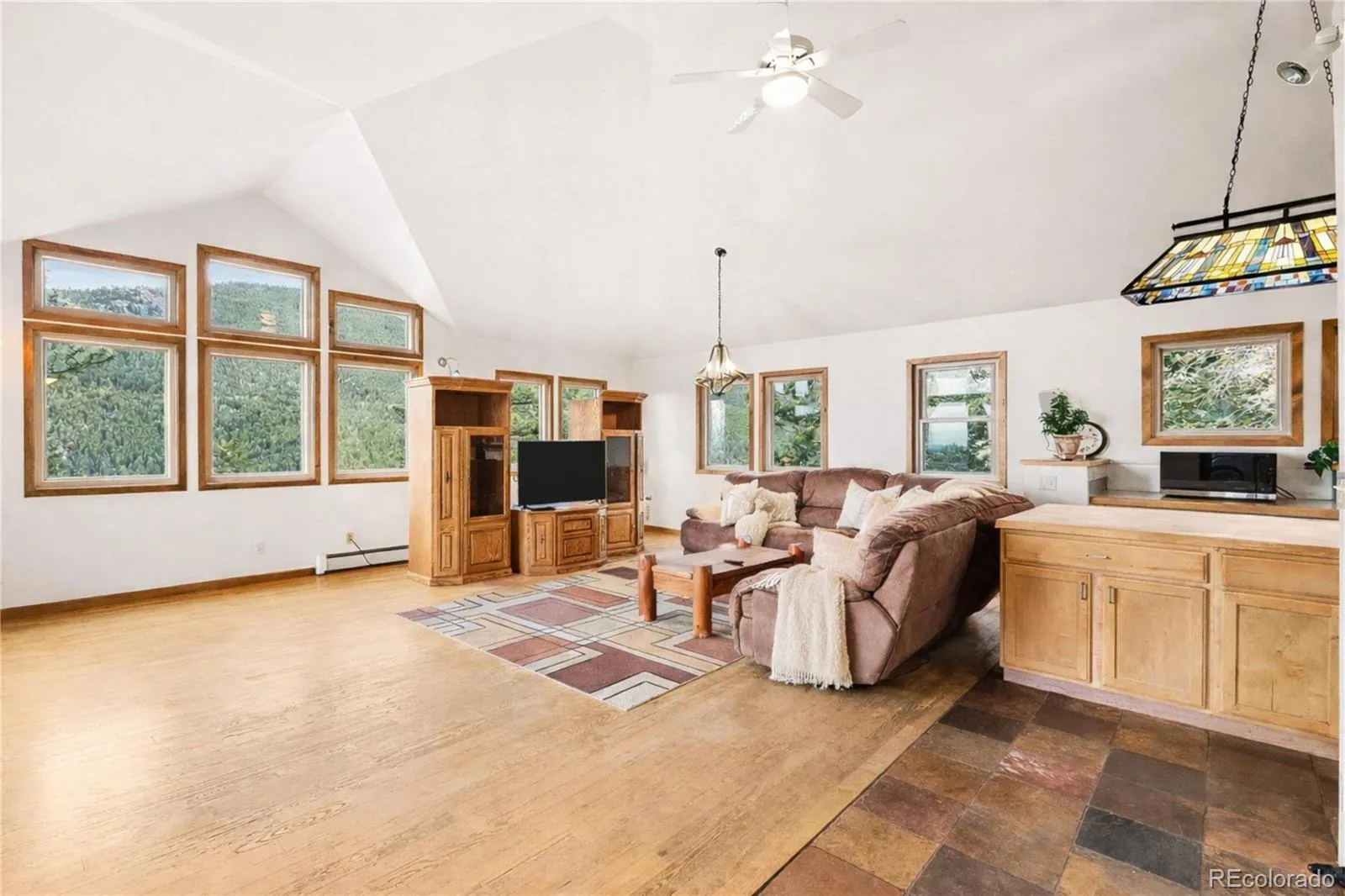 Sunlight, space, and real Colorado mountain living come together on this rare 10-acre property tucked against Golden Gate Canyon State Park. With protected land at your back door, the setting feels private, quiet, and endless, yet you are still within reach of Golden and the Front Range. The home is thoughtfully positioned with a south-facing driveway, making winter access easier and snow melt quicker. Inside, the heart of the house is a dramatic great room with vaulted ceilings and expansive windows that pull in views from multiple directions and flood the space with natural light throughout the day. The layout lives large and open, with a generous kitchen that connects seamlessly to everyday living and entertaining. Two bedrooms plus a dedicated office provide flexibility for guests, remote work, or an easy conversion to a third bedroom. A cozy family room with a wood stove adds warmth and character, perfect for Colorado evenings after a day outdoors. Outside, the land truly sets this property apart. Rock outcroppings, mature trees, and open meadow space offer a mix of beauty and usability. Multiple outbuildings support a wide range of lifestyles, from hobby farming to serious storage. The large barn structure is already powered and could be converted back into an oversized garage, workshop, or equipment space, depending on your needs. Additional structures include a workshop and a well-built chicken coop, making this property ideal for anyone seeking a more self-sufficient lifestyle. With no HOA, no covenants, and direct access to thousands of acres of nearby public land, this is a place where you can truly make the property your own. Whether you are looking for a peaceful mountain retreat, a full-time residence with room to grow, or a basecamp for outdoor adventure, this home offers the space, privacy, and setting that are becoming increasingly hard to find.