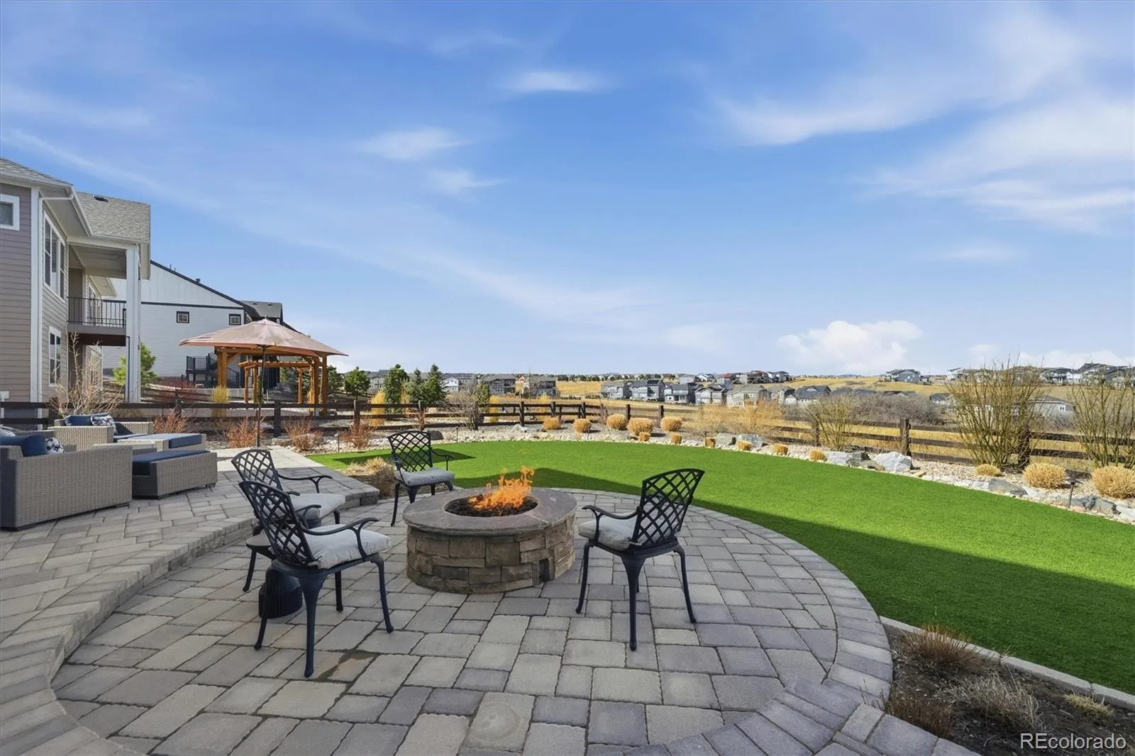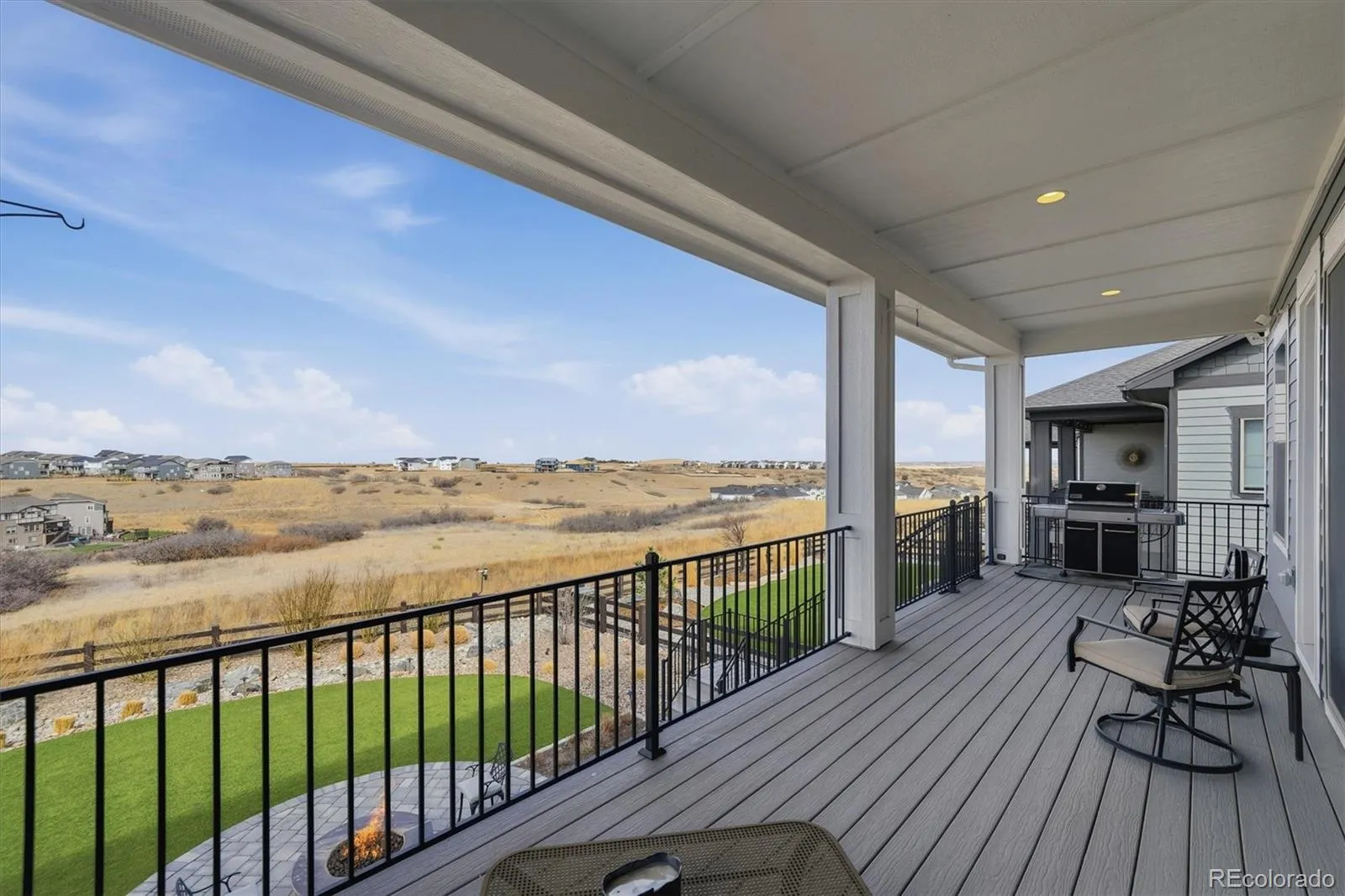 Thoughtfully designed & beautifully finished, this exceptional home blends refined interiors with extraordinary outdoor living—perfectly perched above the neighborhood backing to expansive open space with beautiful mountain views, sweeping vistas & unforgettable Colorado sunsets. A charming covered front porch creates a warm welcome, while inside, the main level showcases durable LVP flooring, elegant 8-foot doors, & a flowing open-concept layout. At the heart of the home, the chef-inspired kitchen features quartz countertops, a generous island with seating, abundant cabinetry, gas cooktop, & expansive pantry storage. The kitchen opens seamlessly to the great room, where a cozy fireplace & wall of windows frame open space & mountain views. Expansive sliding doors lead to a composite deck with iron railings & steps down to the backyard oasis, creating effortless indoor-outdoor living. The main floor offers versatility with a private study, a stylish powder bath, & a built-in drop zone for organization. The south-facing driveway makes snow removal easy. Upstairs, 4 spacious bedrooms & 3 baths provide comfort & flexibility. The luxurious primary retreat captures sweeping views & glowing sunset light, complemented by a spa-inspired 5-piece bath. Secondary bedrooms include a Jack-&-Jill bath with dual sinks & a private en-suite bedroom. An upper-level laundry room with cabinetry & sink completes the space. The finished walk-out basement expands the home’s livability with a large recreation room, two additional bedrooms, & a full bath. Outside, over $100,000 in professional landscaping transforms the backyard into a true retreat. A spacious paver patio with integrated lighting, covered patio, fire pit, low-maintenance turf, & drip-irrigated garden beds create beautifully curated outdoor living. With a three-car garage, elevated finishes & flexible living spaces, this home offers a lifestyle defined by mountain views, privacy, & exceptional design—inside and out.