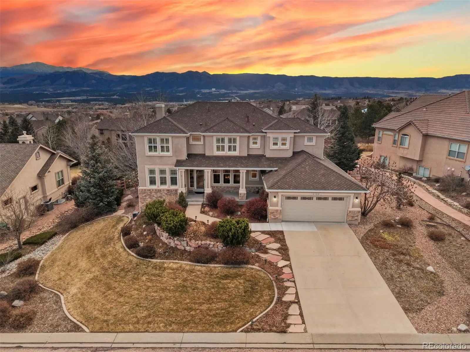 Welcome to an extraordinary home in the highly sought-after Flying Horse community, where luxury living meets breathtaking natural beauty. This one-of-a-kind two-story home offers unparalleled views of Pikes Peak that truly set it apart. Step inside to soaring ceilings and a dramatic wall of windows in the family room, flooding the home with natural light and perfectly framing the stunning mountain views. The thoughtfully designed main level features a formal living room, formal dining room, private office, spacious family room, and an exceptional kitchen. The kitchen boasts 42-inch upper cabinetry, beautiful granite countertops, and yet another picture-perfect view of Pikes Peak. Upstairs, you’ll find four generously sized bedrooms and two bathrooms, including a luxurious Primary Suite. The expansive Primary Suite showcases spectacular mountain views and offers a spa-inspired en-suite bath complete with a jetted tub, dual single-sink vanities for added privacy, a gorgeous tiled walk-in shower, and a spacious walk-in closet. The finished basement expands your living space with an additional bedroom and bathroom, a second living area, and a large flex room ideal for a home theater, gym, or game room. A wet bar adds the perfect touch for entertaining. Step outside to a fully fenced backyard designed for relaxation and enjoyment. The covered deck flows seamlessly to a large concrete patio—an ideal setting to unwind while taking in those iconic Pikes Peak views. Beyond the home itself, the community offers miles of scenic walking and biking trails, creating the perfect balance of luxury and outdoor living. Located within the highly acclaimed Academy School District 20 and just minutes from the prestigious United States Air Force Academy, the location is truly exceptional. Residents also enjoy close proximity to everyday conveniences and the renowned Flying Horse Country Club, this home offers an unbeatable combination of luxury, comfort, and location.