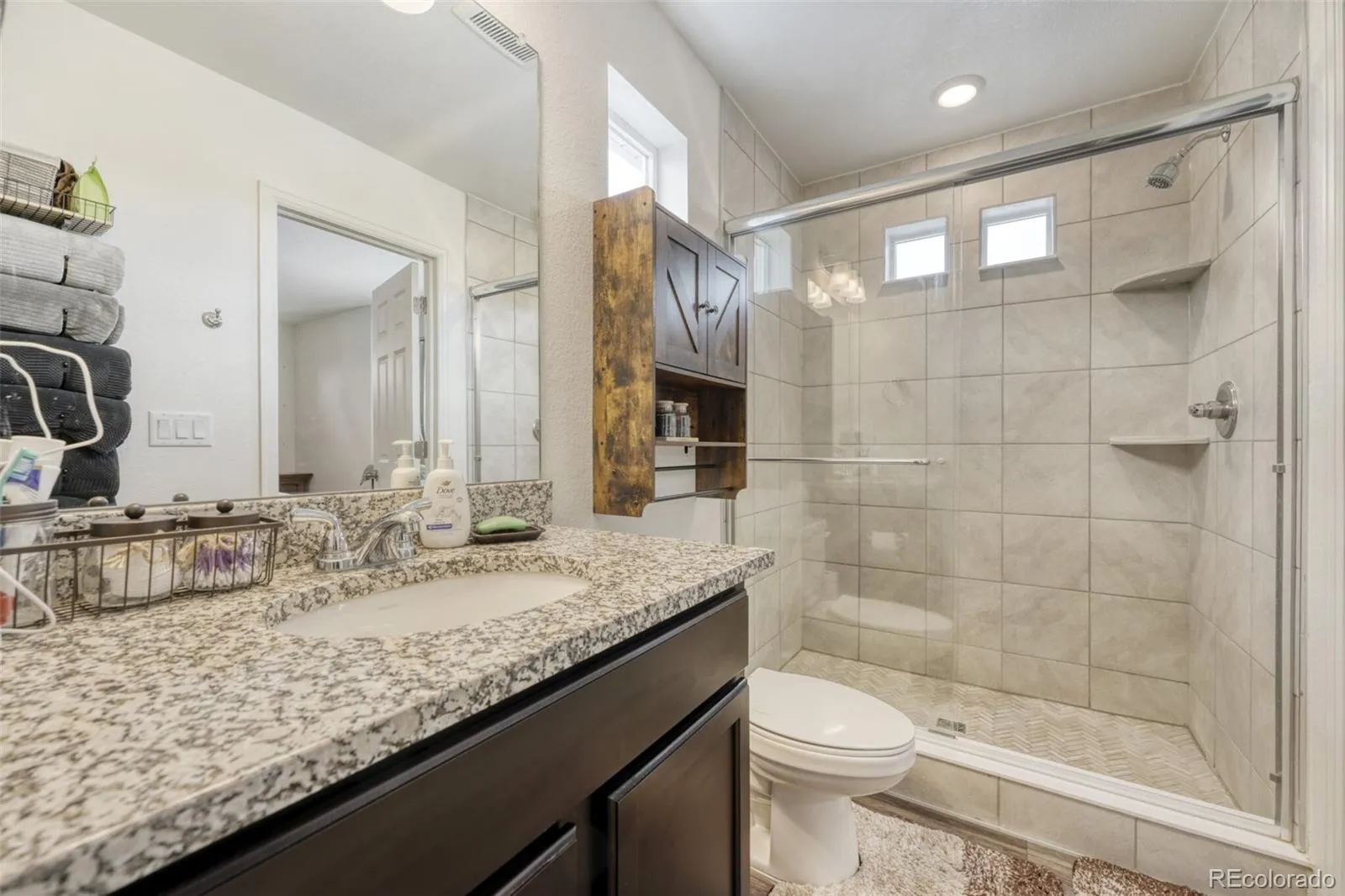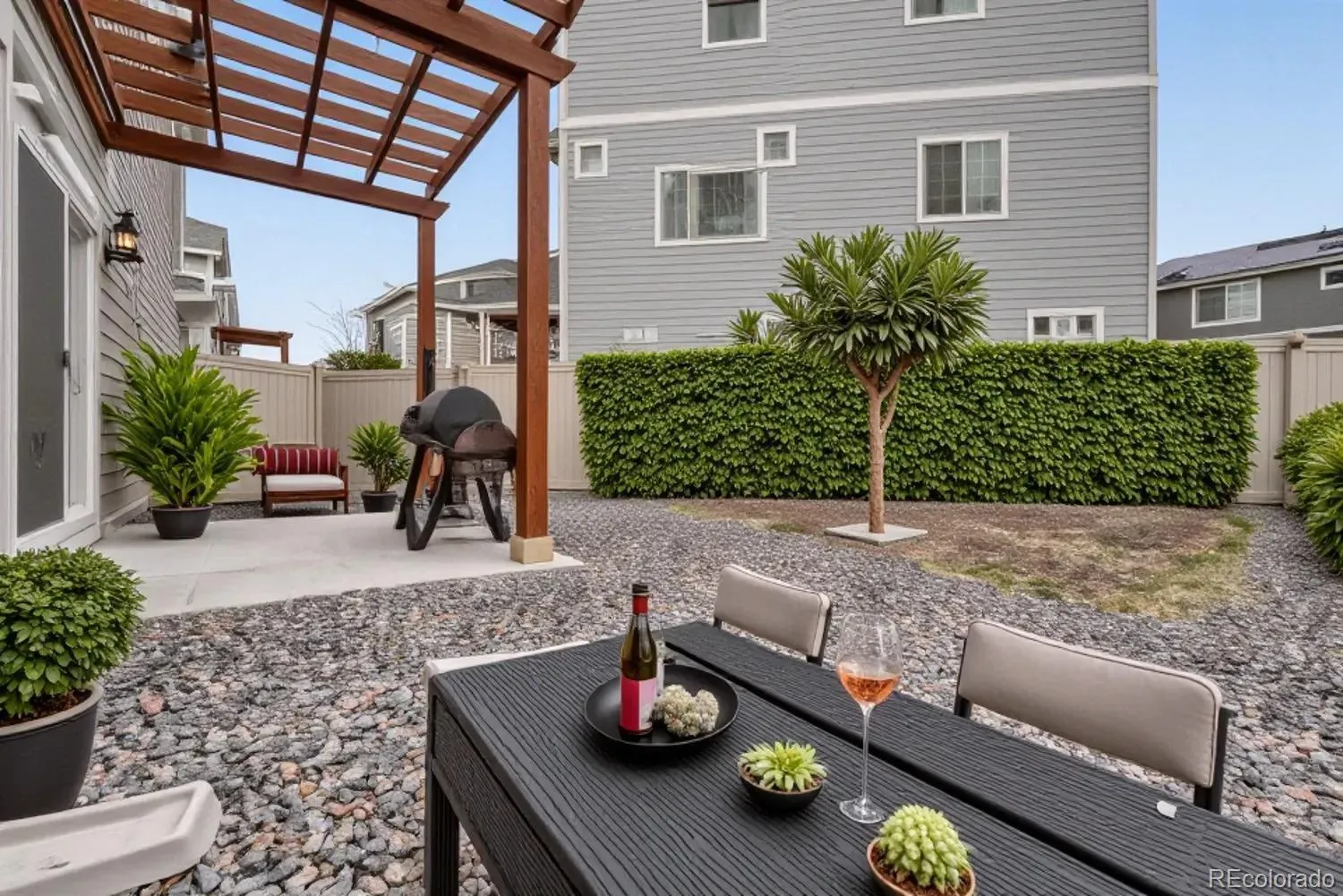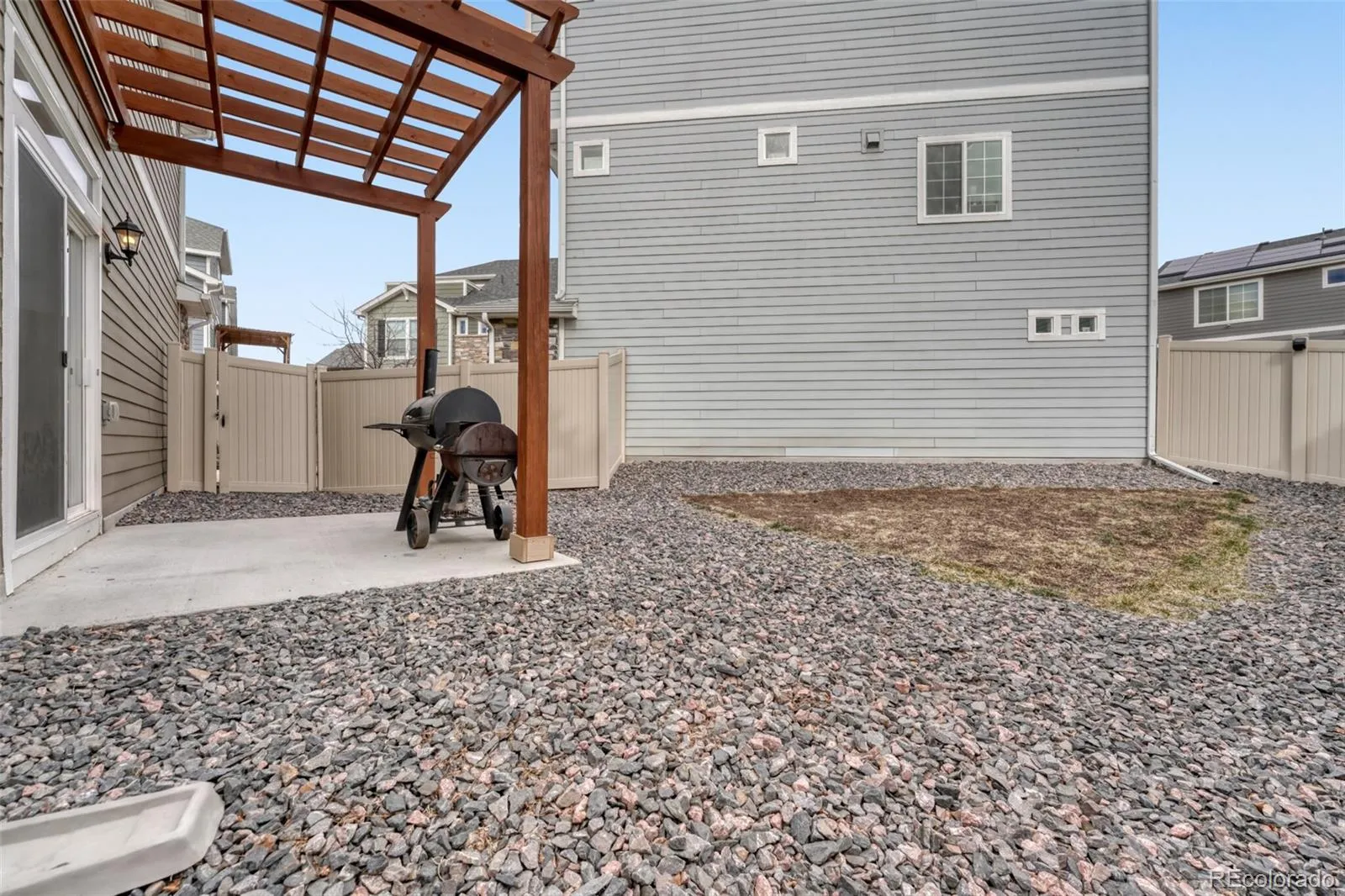 Out back, discover your own private escape. The fully fenced yard features a charming patio and pergola — an ideal setting for summer evenings, weekend barbecues, or simply unwinding under Colorado’s open skies. Low-maintenance gravel landscaping ensures you can spend more time enjoying the space and less time maintaining it.