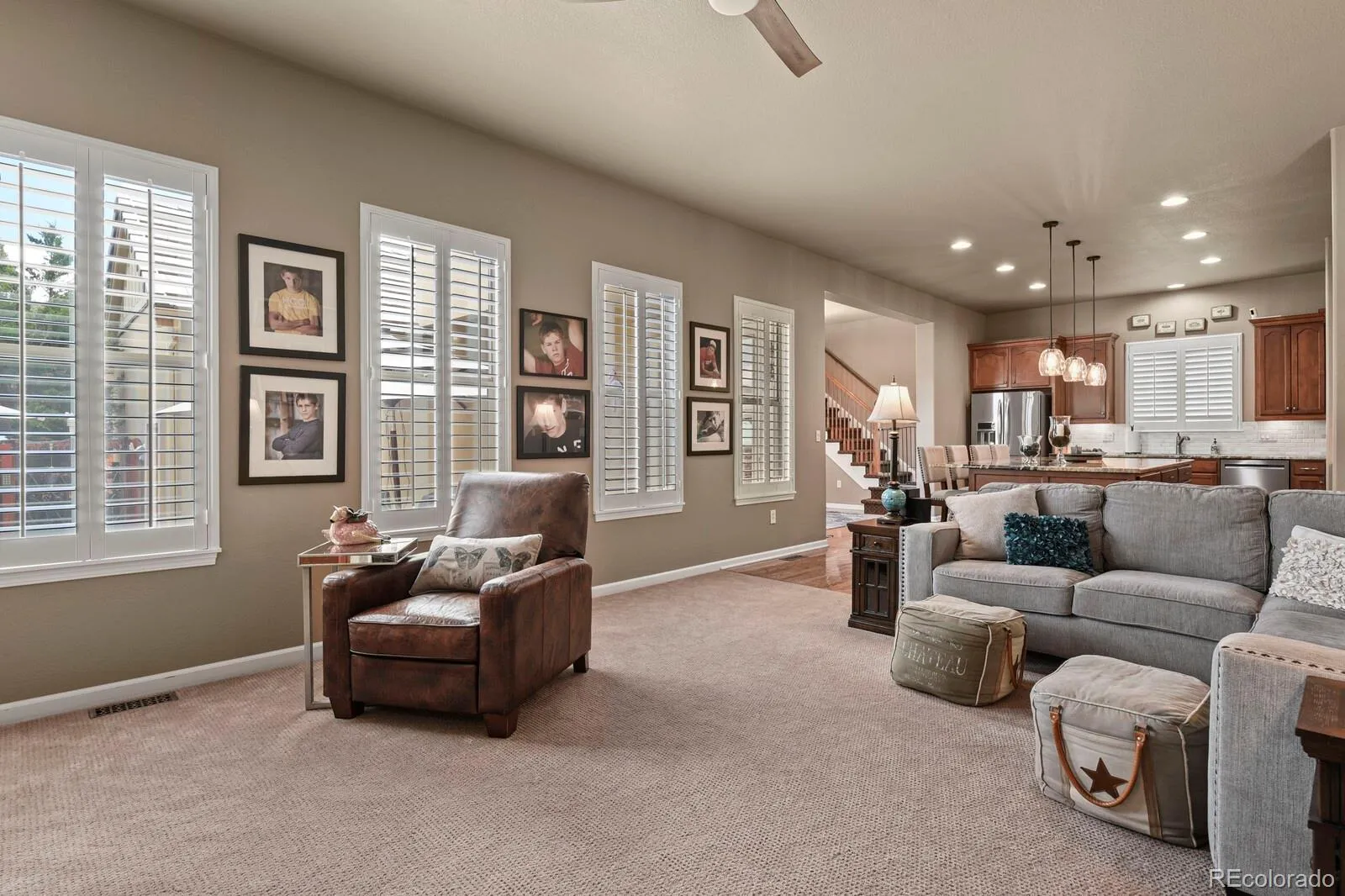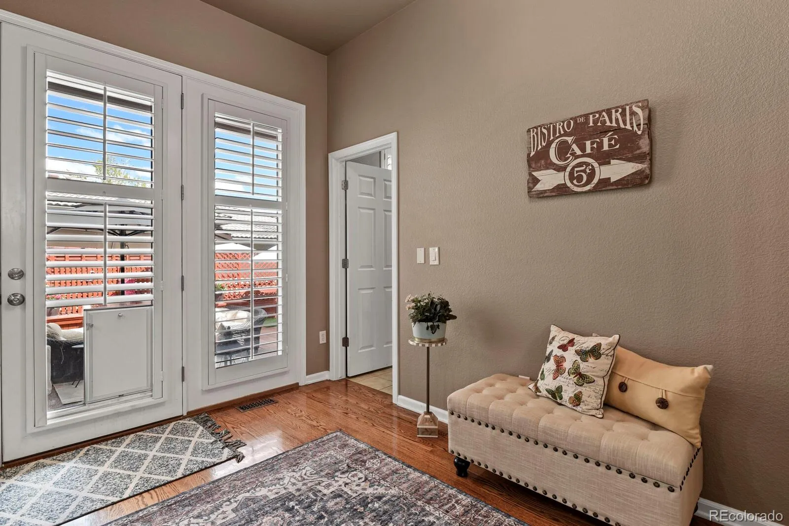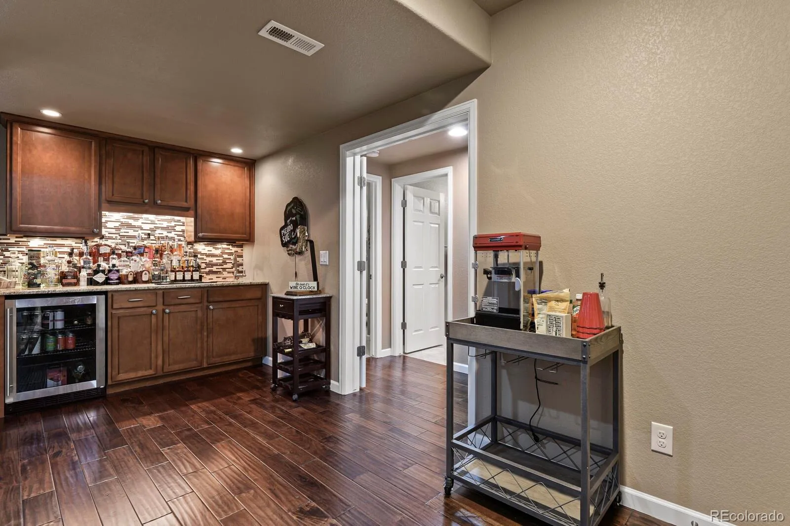 Sit on the covered front porch of this beautiful home and enjoy your morning coffee looking over the peaceful courtyard. Walking in the front door, you will immediately notice the beautiful detail in the ceiling with crown molding. There is a formal dining room and a formal living room. A powder room is centrally located on the main floor. Enter a beautiful kitchen with an expansive island and abundant cabinetry with a brand new wine fridge! There is a large pantry, coffee bar and an additional dining area. The separate stairway leads to a private office with custom built in shelves and cabinets. The large desk is included. The office has its own bathroom and Cassette heat/ac unit. The upstairs level includes a large primary bedroom, with its own LG wireless cassette indoor heat/ac, with dual custom closets. Additionally the primary bath has a large soaking tub and huge walk in shower with dual shower heads. There are two large additional bedrooms with a shared bath that includes dual sinks and a tub/shower combo. The finished basement is an entertainer’s dream with a large great room with a wet bar and beverage fridge. The 4th bedroom is in the basement. Additionally there is a 3/4 bath with a walk in shower. Tons of storage that includes the storage shelves, as well as a wine rack. The three car garage includes tall cabinetry for storage. There is a brand new (2025) gorgeous, private outdoor patio with a gas grill for outdoor entertaining. Additionally, A brand new privacy fence was completed in October 2025. Enjoy the beautiful Bluffs Regional Park just steps from your front door! Close to I25, the light rail, Park Meadows Mall, and an array of dining options!