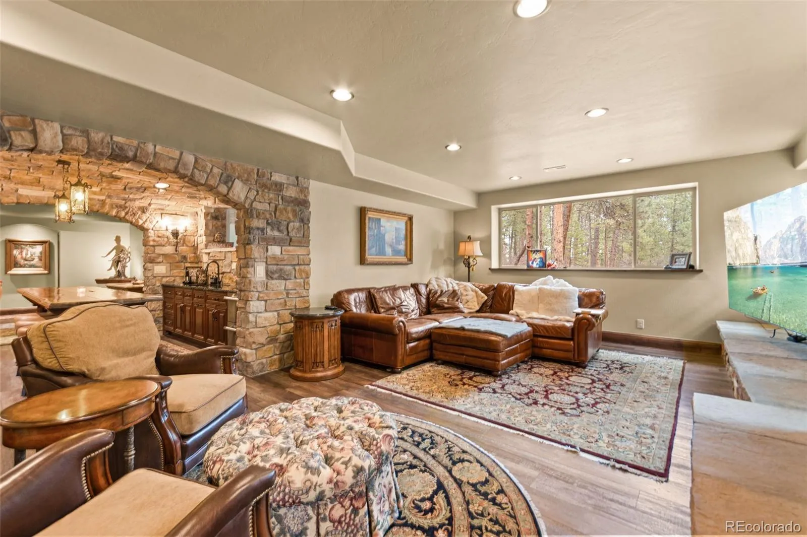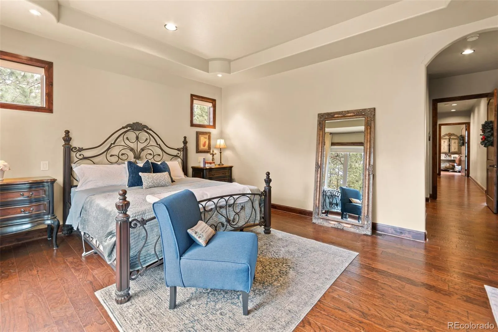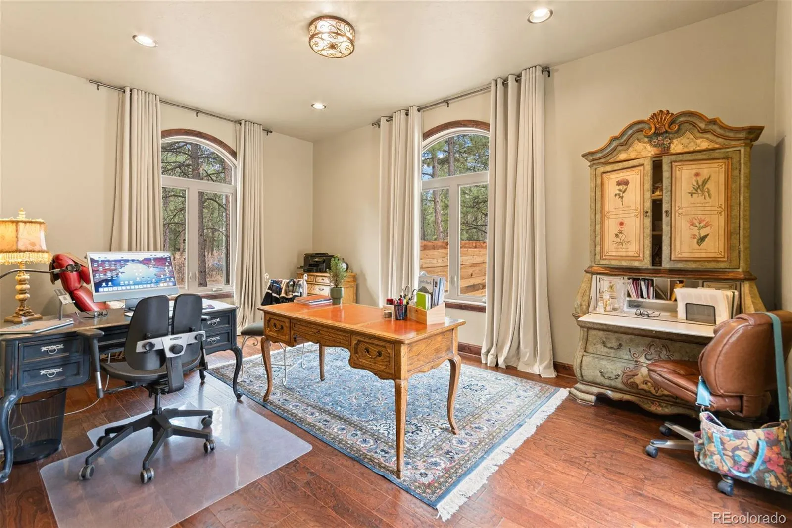This custom estate, framed by towering Ponderosa Pines is set behind handmade wrought-iron gates on a private, one-acre wooded site. This custom home blends a Tuscan and Mediterranean architectural style with the quiet serenity of Colorado mountain living. The stucco and stone facade, arched windows, and enclosed courtyard establish a sense of arrival rarely found in the Sage Port neighborhood. Inside, superior craftsmanship defines every space. A circular stone rotunda foyer opens to a refined main level where arched transitions, rich hardwood flooring, hand troweled walls, iron detailing and extensive stonework create architectural continuity. The expansive great room is anchored by a statement fireplace, while the chef’s gourmet kitchen features an oversized custom stone island, quality knotty alder cabinetry, professional-grade Wolf & Sub Zero appliances and seamless flow for entertaining. The main-level primary suite offers deck access and a spa-inspired copper soaking tub, stone shower, dual vanities, and an oversized walk-through closet connecting to the spacious laundry room. The finished lower level introduces a dramatic stone-arched ceiling, custom wet bar, recreation lounge, family room with a warming gas fireplace and relaxing guest accommodations. The covered deck offers outdoor living to enjoy the beauty of mother nature and delivering a private retreat just 30 minutes from Denver Tech Center and Colorado Springs.