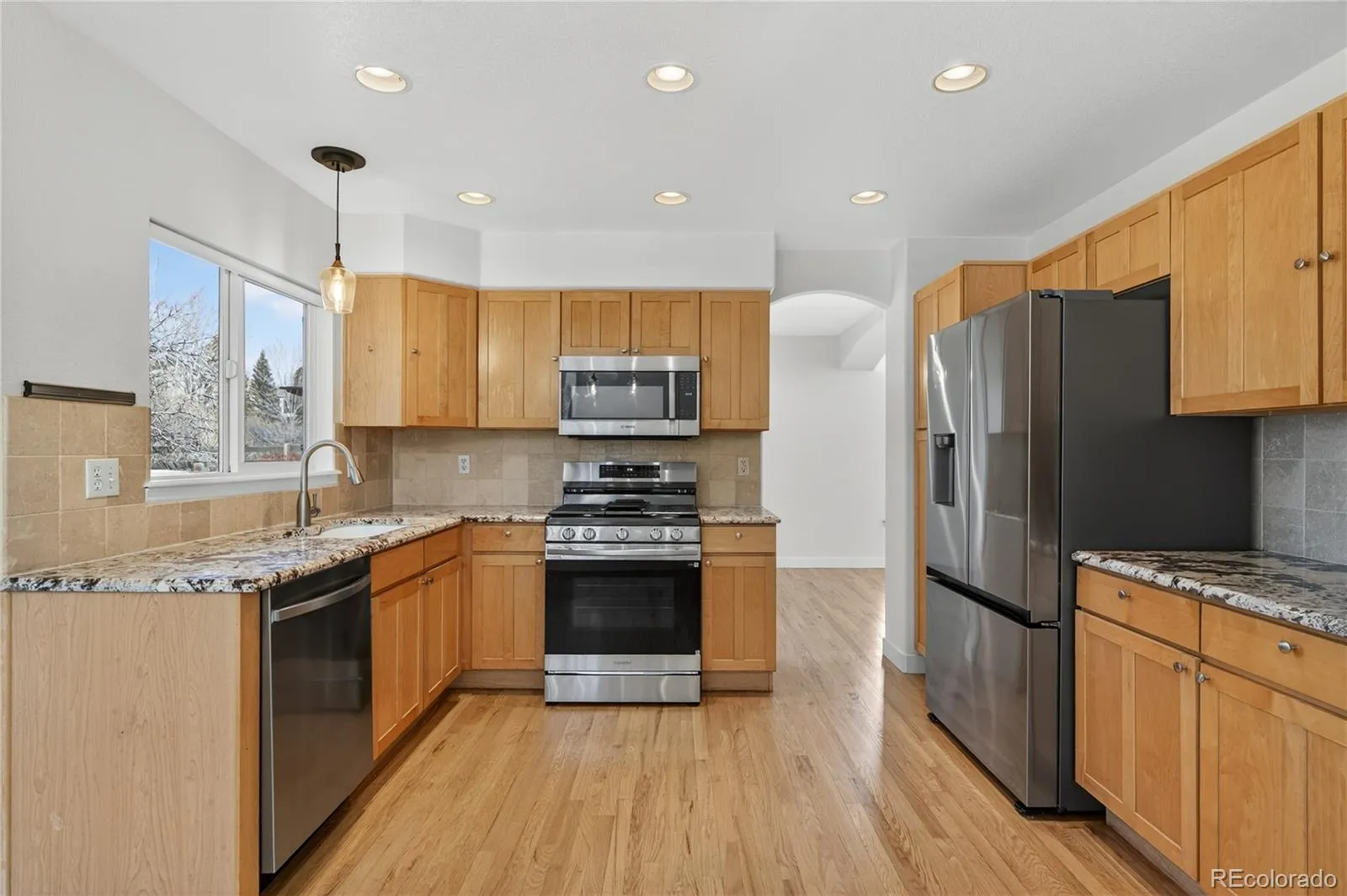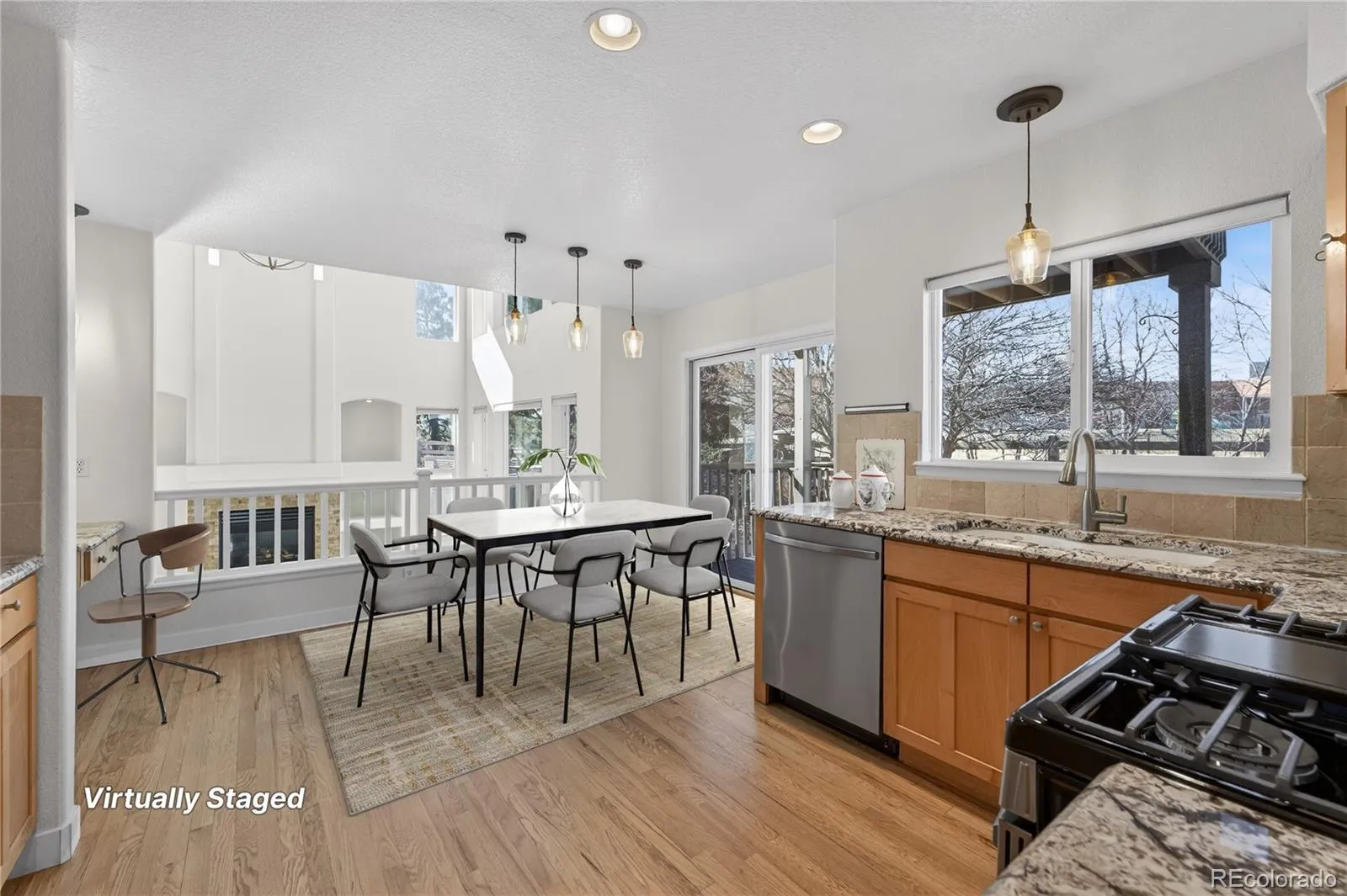 Opportunity awaits in one of Littleton’s most sought-after communities—Grant Ranch! This beautifully refreshed home features brand new wood flooring, new carpet, fresh interior paint, and all new kitchen appliances, offering true move-in-ready comfort and style Step inside to a light-filled open layout with soaring two-story ceilings and an abundance of windows that flood the home with natural light. A crisp, neutral color palette pairs perfectly with the updated finishes, creating a warm yet modern feel. Both formal and informal living spaces provide flexibility for entertaining guests or enjoying everyday living. The chef-inspired eat-in kitchen shines with warm Shaker-style wood cabinetry, granite countertops, a gas range, a charming built-in desk, and brand new appliances. The dining area opens to a deck with a patio below, seamlessly extending your indoor/outdoor living space—perfect for summer barbecues or quiet evenings outdoors. Upstairs, you’ll find three generously sized bedrooms connected by a versatile open loft—ideal for a home office, study space, or cozy retreat. The private primary suite is set a few steps above the loft for added seclusion and features a luxurious six-piece en-suite bath designed for relaxation. The backyard offers mature trees, established landscaping, and a retaining wall for added character. Best of all, it backs to a neighborhood greenbelt and open space—meaning no neighbors behind. Enjoy the convenience of walking to nearby K–8 schools just beyond the greenbelt. Living in Grant Ranch means access to exceptional amenities including a private marina, pool, tennis courts, clubhouse events, movie nights, parks, and scenic trails. You’re also just minutes from golf courses, shopping, dining, and the popular Clement Park. With stylish updates throughout and an unbeatable location, this Littleton gem is ready to welcome you home.