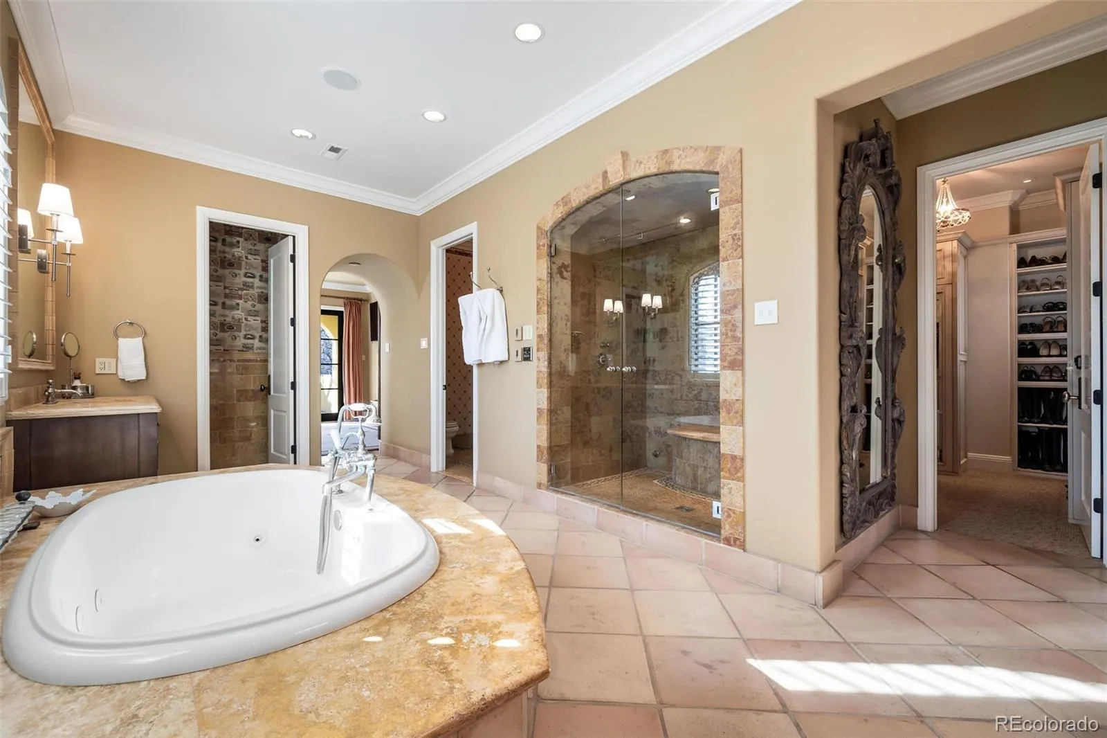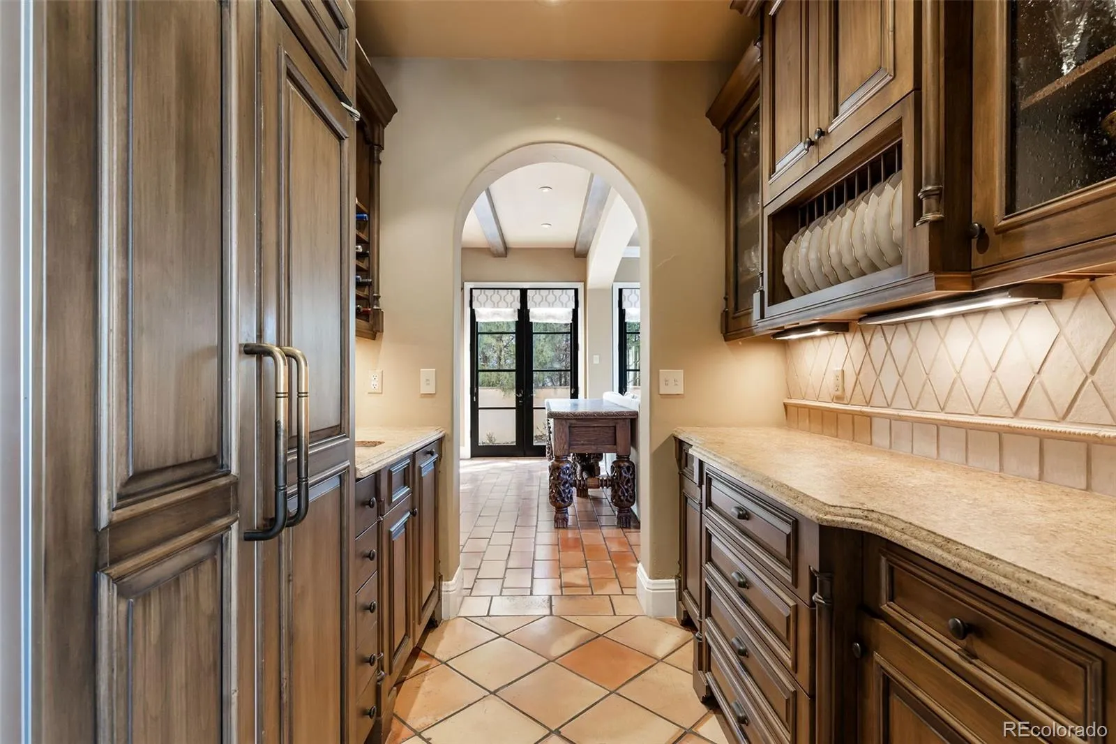 Distinctive architectural elements, including timeless Saltillo tile and rich walnut flooring, infuse the interiors with warmth and character. The second level is anchored by a luxurious primary sanctuary featuring a private office, an intimate fireside sitting room, and a south-facing balcony overlooking the picturesque fountain of the neighboring 106 S. University enclave. The spa-inspired primary bath offers dual, generously proportioned walk-in closets and is complemented by the convenience of an upstairs laundry room.