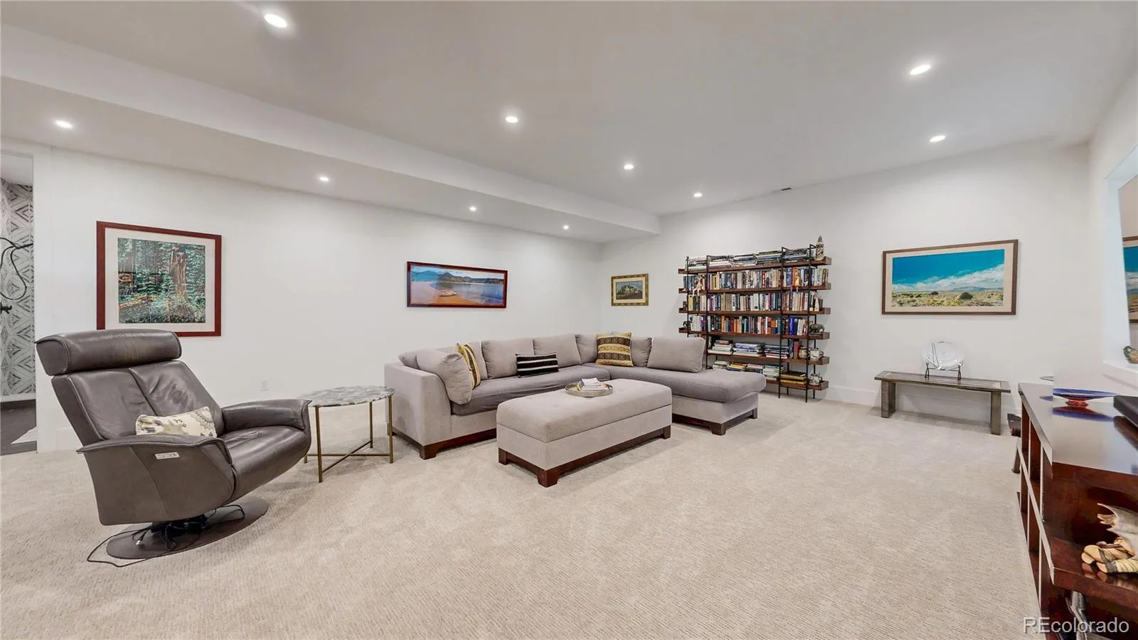 living room has large accordion glass doors flowing out to the covered patio. Basement 1 bedroom and 1 3/4 bath and large rec room. Tall ceilings all floors.