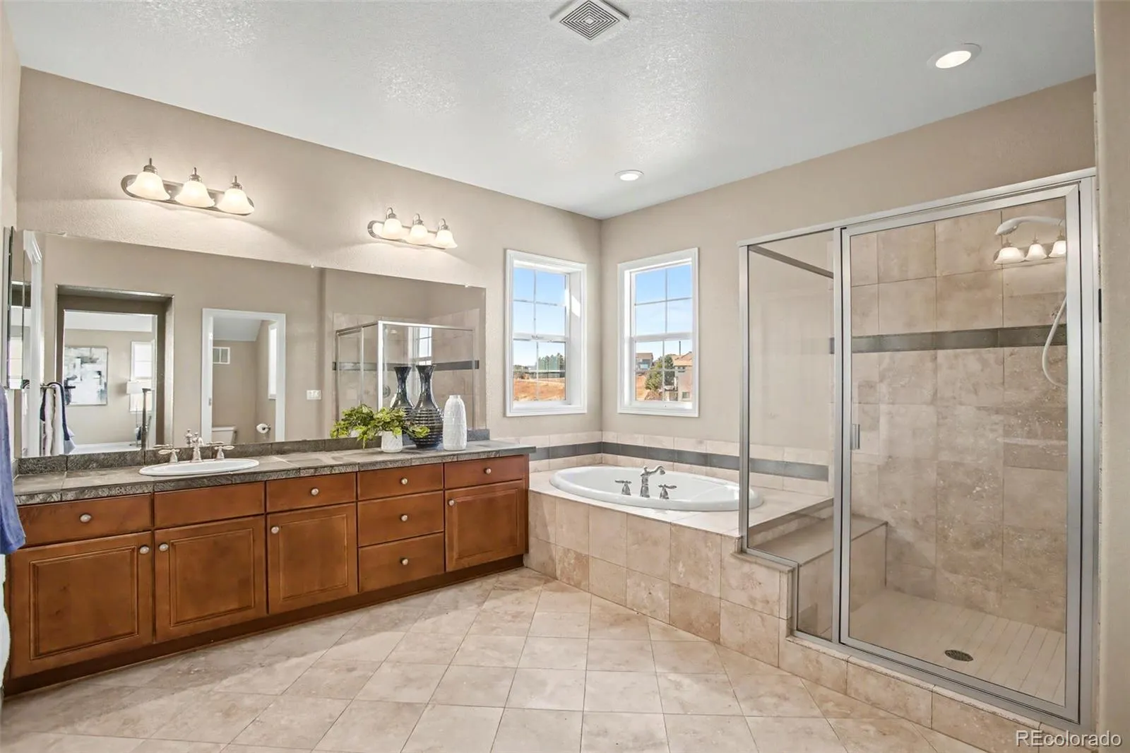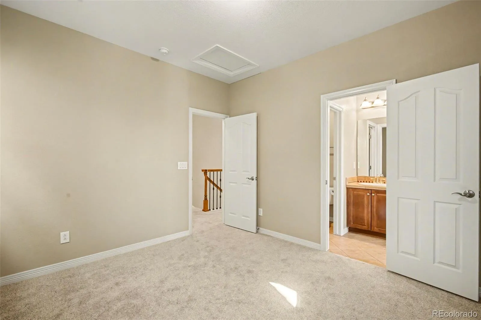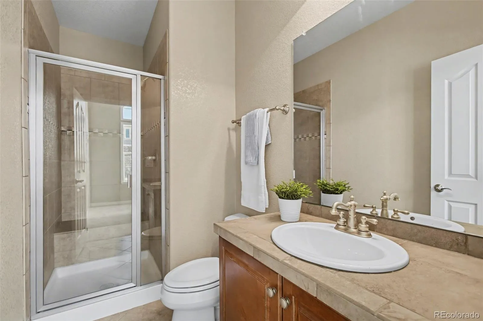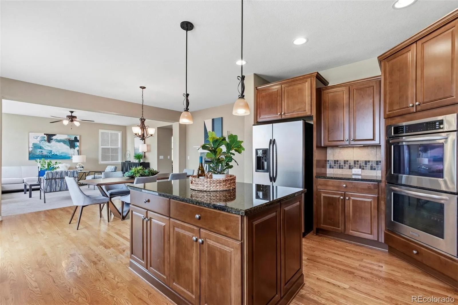 This thoughtfully designed Shea home in the highly desirable neighborhood of The Hearth offers a functional, inviting floor plan with room to grow. The main floor features hardwood floors, a spacious kitchen with granite countertops, a large island, and stainless steel appliances, including a double oven and gas range. Just off the kitchen is a dining area with a cozy fireplace, while the formal dining room sits only a few steps away, making the layout ideal for both everyday living and entertaining. The main-floor living room provides a comfortable gathering space and flows seamlessly with the kitchen and dining areas. A main-level bedroom with a walk-in closet and attached ¾ bathroom provides excellent flexibility for guests or a home office. A convenient half bath completes the first level. Upstairs, the primary bedroom is a true retreat, featuring a coffee bar, a full ensuite bathroom with a large soaking tub, a walk-in shower, dual vanities, and a large walk-in closet. A private set of stairs in the primary bedroom leads to a loft, creating a unique and versatile space ideal for a home office, reading nook, or private sitting area. Two additional bedrooms share a Jack-and-Jill bathroom. A laundry room with a utility sink completes the second floor. Bring your imagination to the unfinished walkout basement. Step outside onto the expansive Trex deck and enjoy views of the open space, walking and biking paths directly behind the home. These trails are part of the extensive Highlands Ranch trail system, offering miles of interconnected paths for walking, running, biking, and enjoying the outdoors, all while providing a sense of privacy and a beautiful backdrop just beyond the backyard.