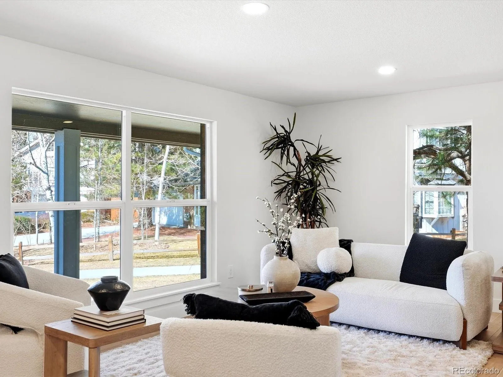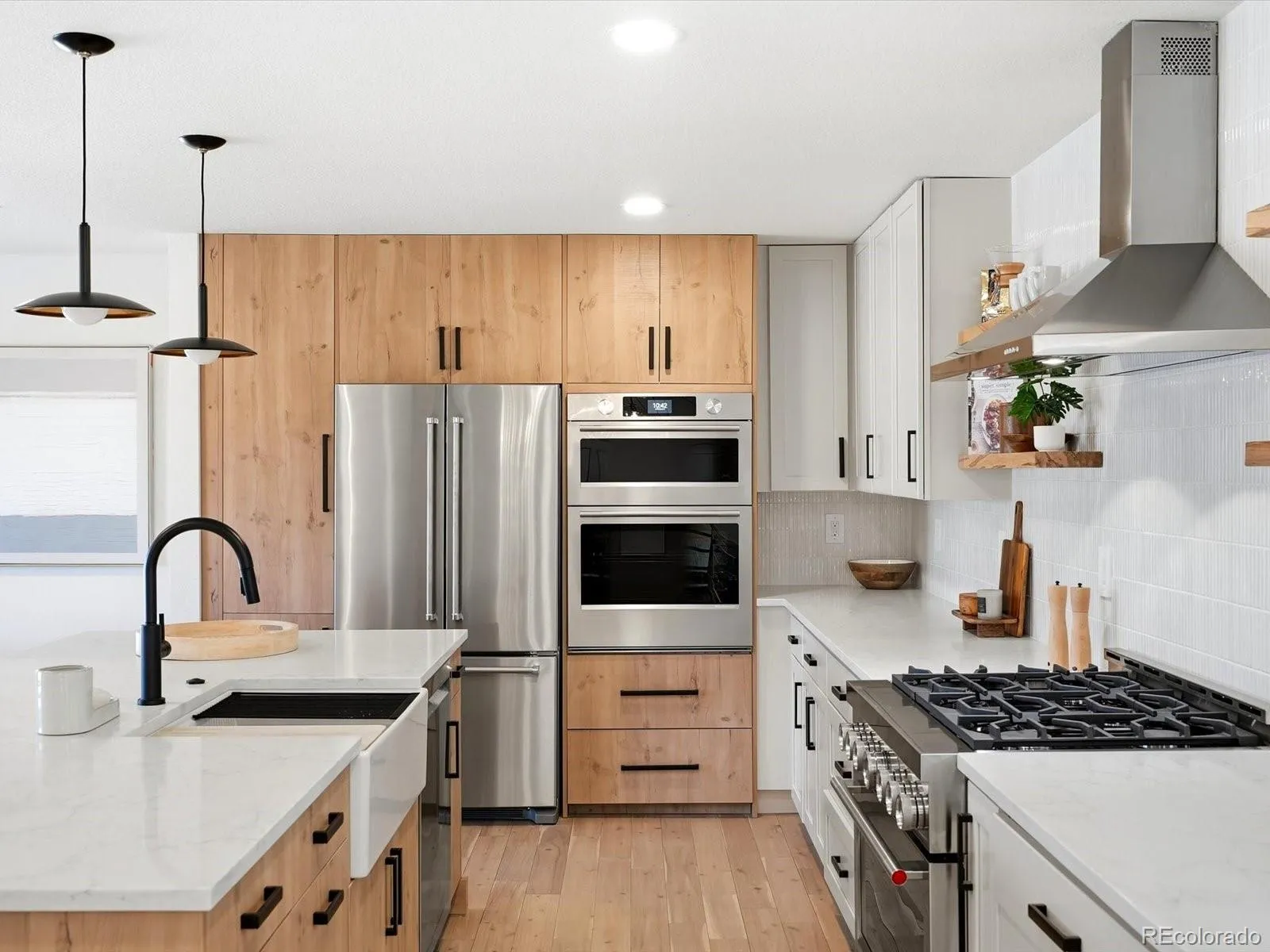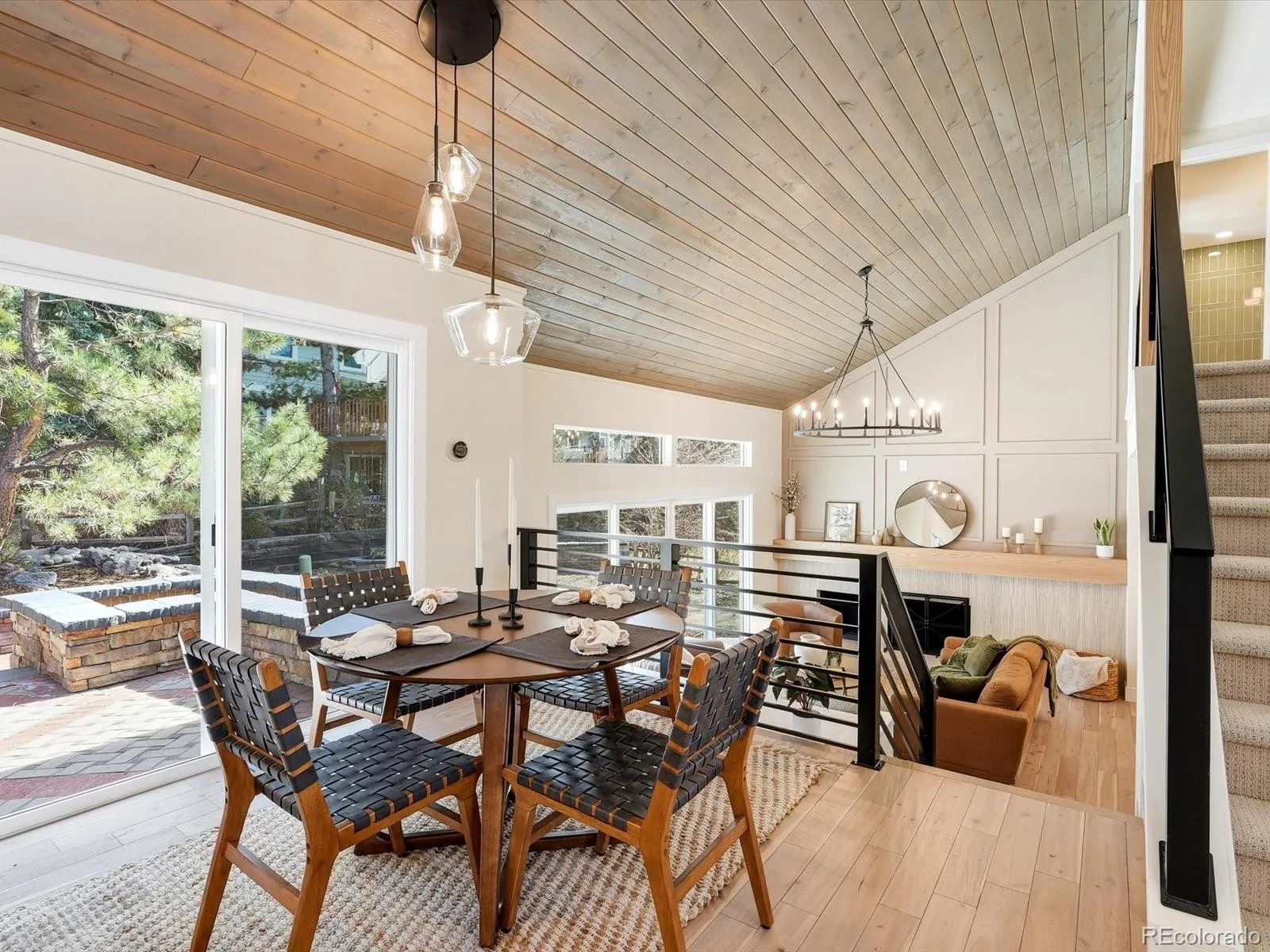 The stunning chef’s kitchen is the heart of the home, featuring premium KitchenAid appliances, including double ovens, gas range, stainless steel refrigerator, dishwasher, and microwave. An abundance of counter space, open shelving, and seamless flow into the dining area make this space ideal for entertaining. The adjacent eating space opens directly to the expansive patio for effortless indoor-outdoor living.