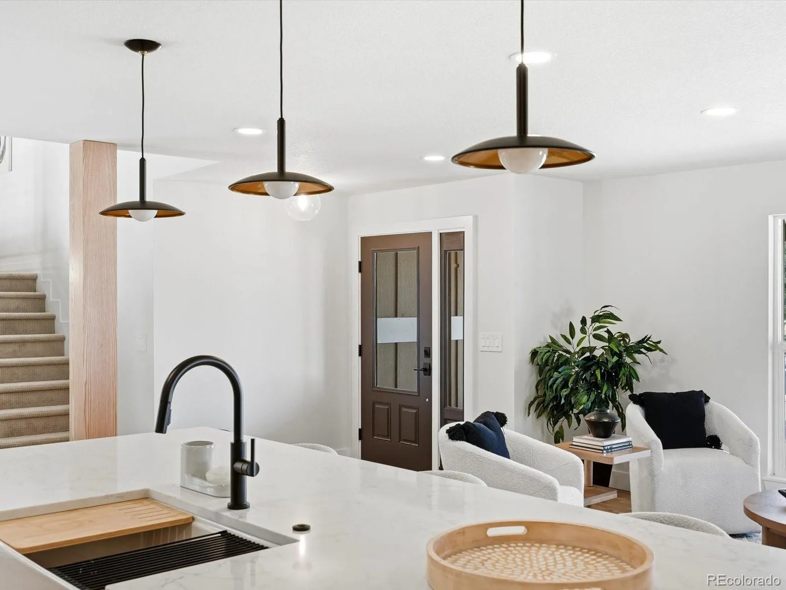 Just beyond, the inviting family room showcases rich wood floors, a cozy wood-burning fireplace, and an impressive 12-foot door leading to the backyard oasis. A built-in wet bar with beverage refrigerator adds an elevated touch for gatherings. The main floor also offers a private office or optional third bedroom, providing flexibility for today’s lifestyle.