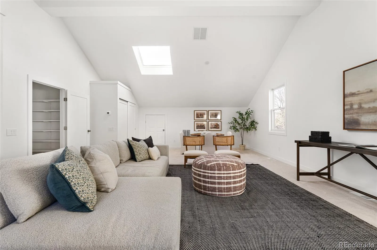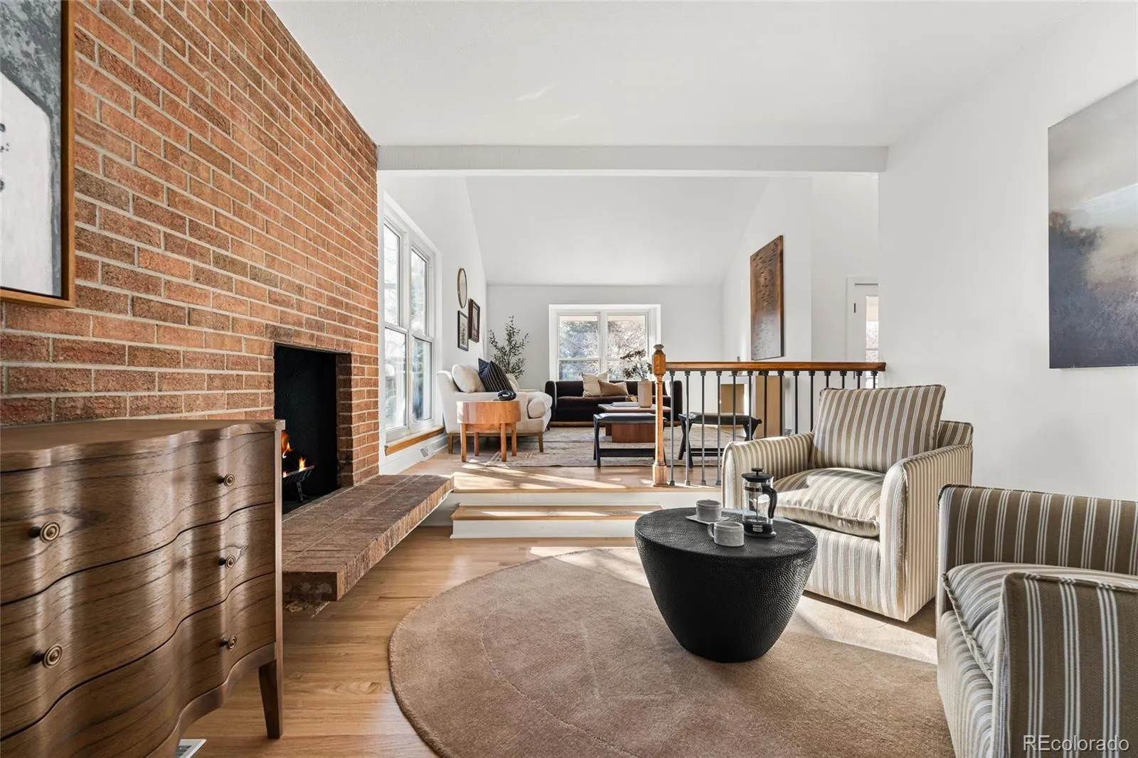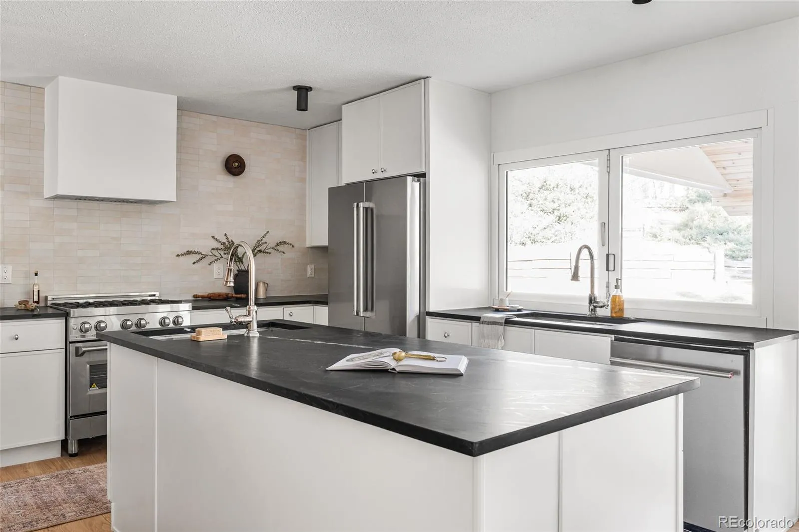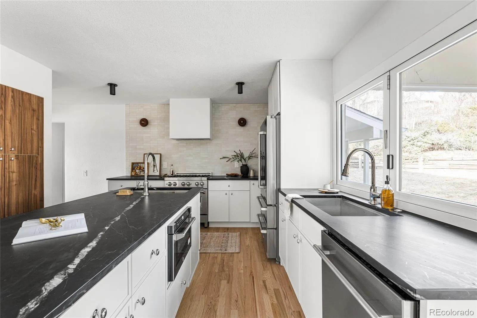 Enter through glass front doors to a sun-drenched living room with vaulted ceilings, cozy fireplace reading nook, and separate formal dining room. The chef’s kitchen features a massive fully openable folding window that folds completely away for unobstructed fresh Colorado air and views, huge island, and dual sinks—perfect for cooking and entertaining.