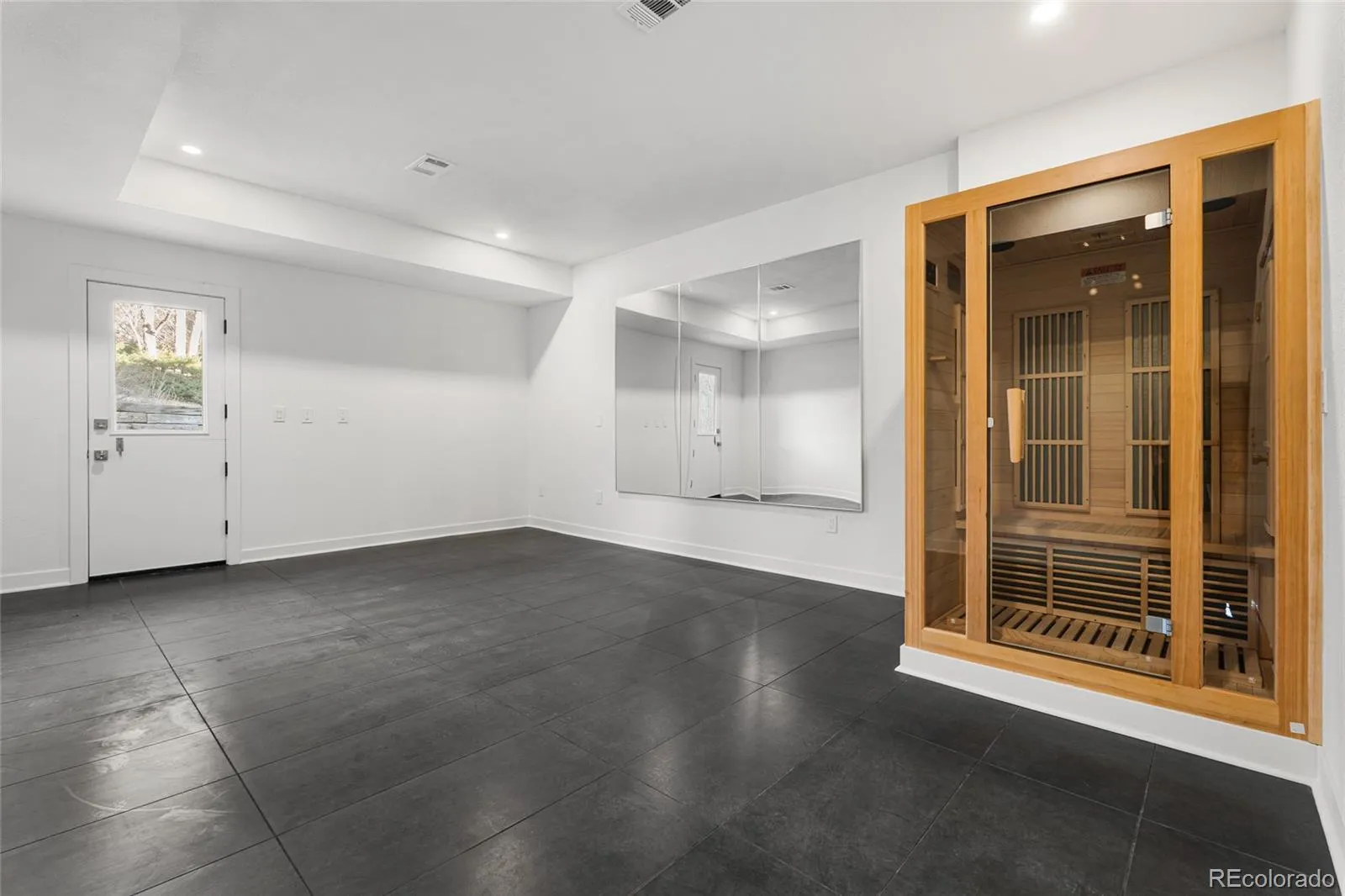 The laundry/mudroom buffers the garage from living areas. The separate workout room off the garage features a built-in sauna and direct backyard access.