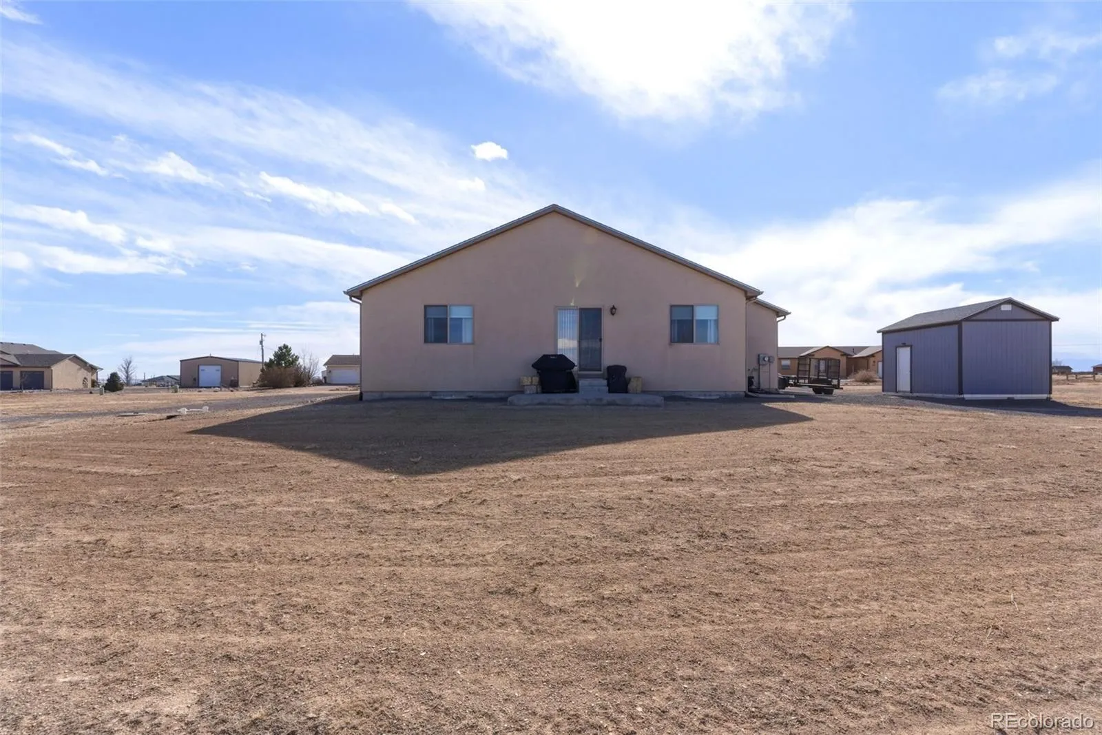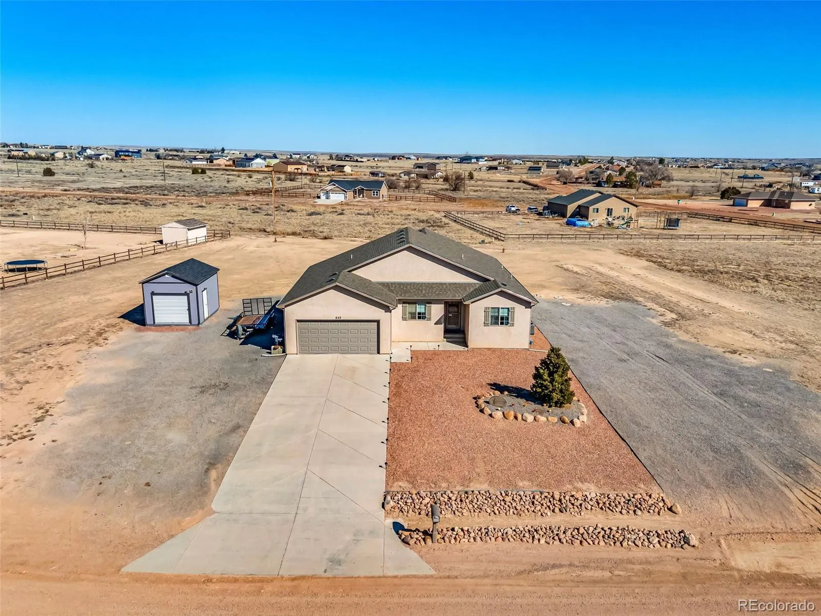 Set on 1.09 acres in Pueblo West, this 3 bedroom, 2 bath home offers space, flexibility, and a layout built for everyday living. Constructed in 2018, the main level provides 1,743 square feet with an additional 1,743 square foot unfinished basement ready for storage, a home gym, recreation area, or future expansion. The open concept design connects the living room, dining area, and kitchen under vaulted ceilings, creating a bright, functional gathering space. The kitchen features stainless steel appliances, solid surface counters, ample cabinetry, a pantry, and a large island with seating. Wood flooring flows through the main living areas, with carpet in the bedrooms and tile in the baths. The primary suite includes a walk in closet and a private bath with double vanities, tiled shower, and soaking tub. Two additional bedrooms and a full bath provide room for guests, office space, or hobbies. Outside, the concrete patio is ideal for grilling and outdoor dining. With over an acre, there is room for animals, additional landscaping, or future outbuildings. The oversized two car garage includes extra space for a workshop or third car. Glorified shed included. Quick access to schools, shopping, and nearby outdoor recreation while enjoying the privacy and flexibility Pueblo West is known for.