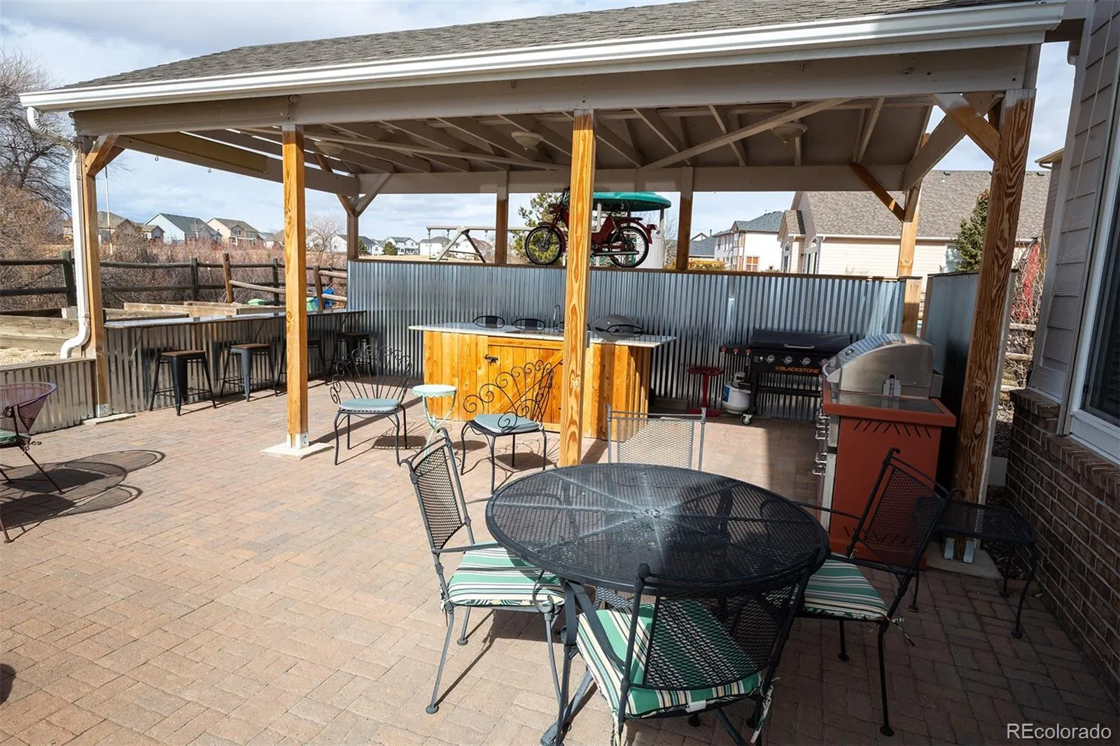 Finally a home with everything you want! Views, main-level living, low maintenance and Location! Big, beautiful rancher in Woodmen Hills. Backs to golf course, super Pikes Peak view. Extensive renovations by current owner over past 5 years. All new kitchen including cabinets, stone, huge island, appliances, fixtures. Primary bath all new with big walk in shower. Quality luxury vinyl plank flooring throughout. Super outdoor living space. Stone patio, covered BBQ and sitting areas with privacy walls, corn hole course, fenced. Thicket between yard and golf course adds to privacy. Turf lawn area and zero-scaping, no maintenance! Drip system for trees. Spacious and bright basement is unfinished but offers amenities. Divider curtains separate spaces for guests, school, storage etc. Dog wash and workshop areas, even custom axe throwing range. Woodmen Hills community has lots to offer. Rec centers with pools, parks and open spaces, hiking and biking trails and much more! Shopping, dining, schools all close by. Spacious main level living with minimal steps could accommodate mobility challenged. Home is in Woodmen Hills metro district and monthly fees are approximately $230. Included; rec/fitness centers, pools, water, sewer, parks and playground maintenance, street lights etc. Check this one out ASAP!