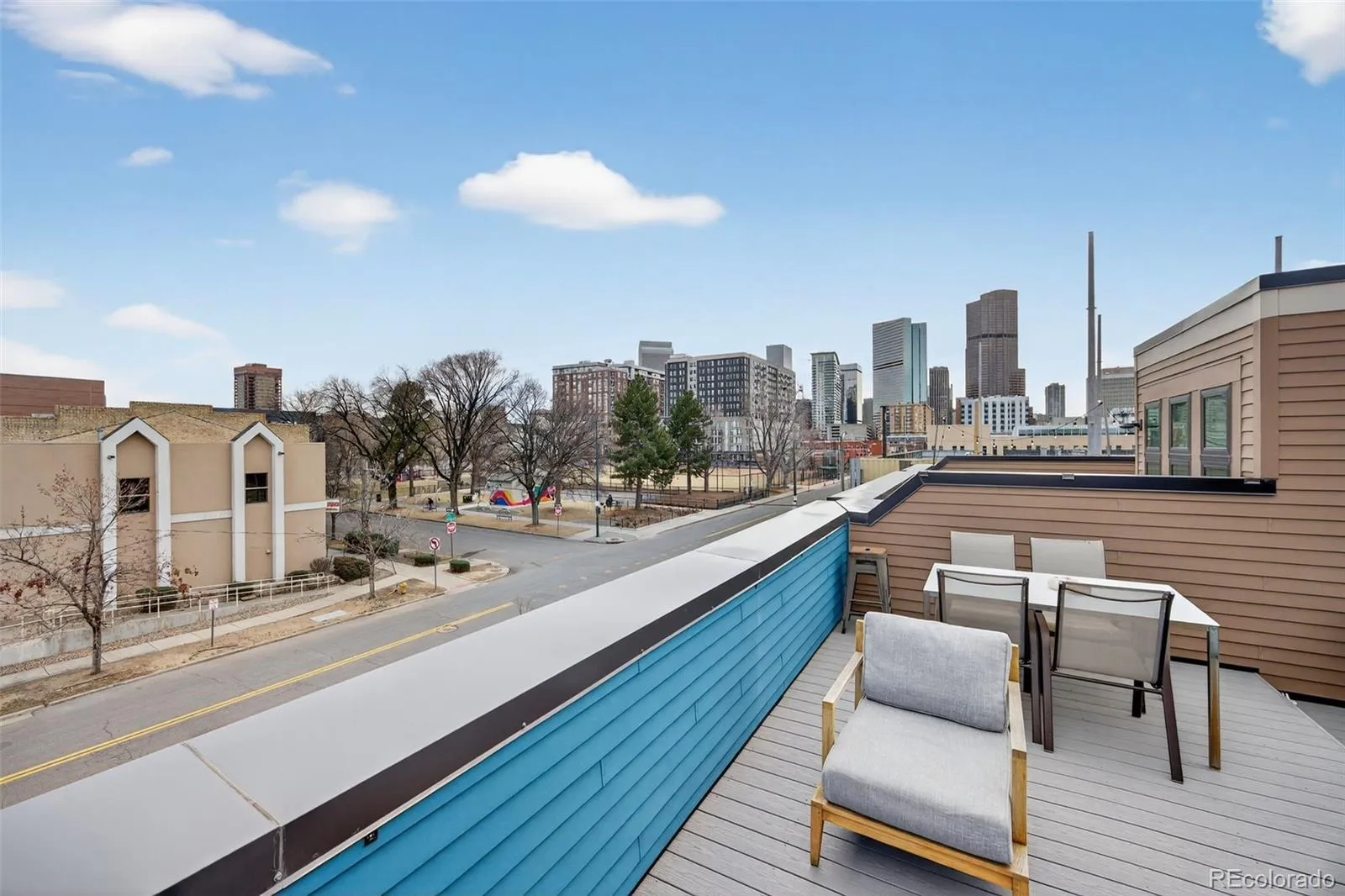 Outdoor spaces truly set this home apart. A large, fully fenced front yard and covered porch create a welcoming entry, while the expansive rooftop deck delivers an exceptional outdoor experience featuring a grill island, hot tub, outdoor TV, motorized retractable sun shades, and sweeping views of Downtown Denver and the Rocky Mountains.