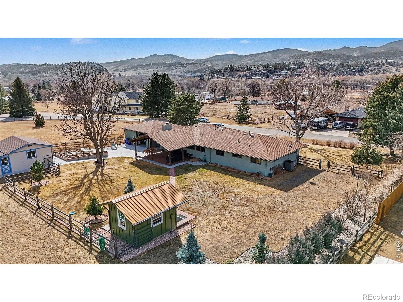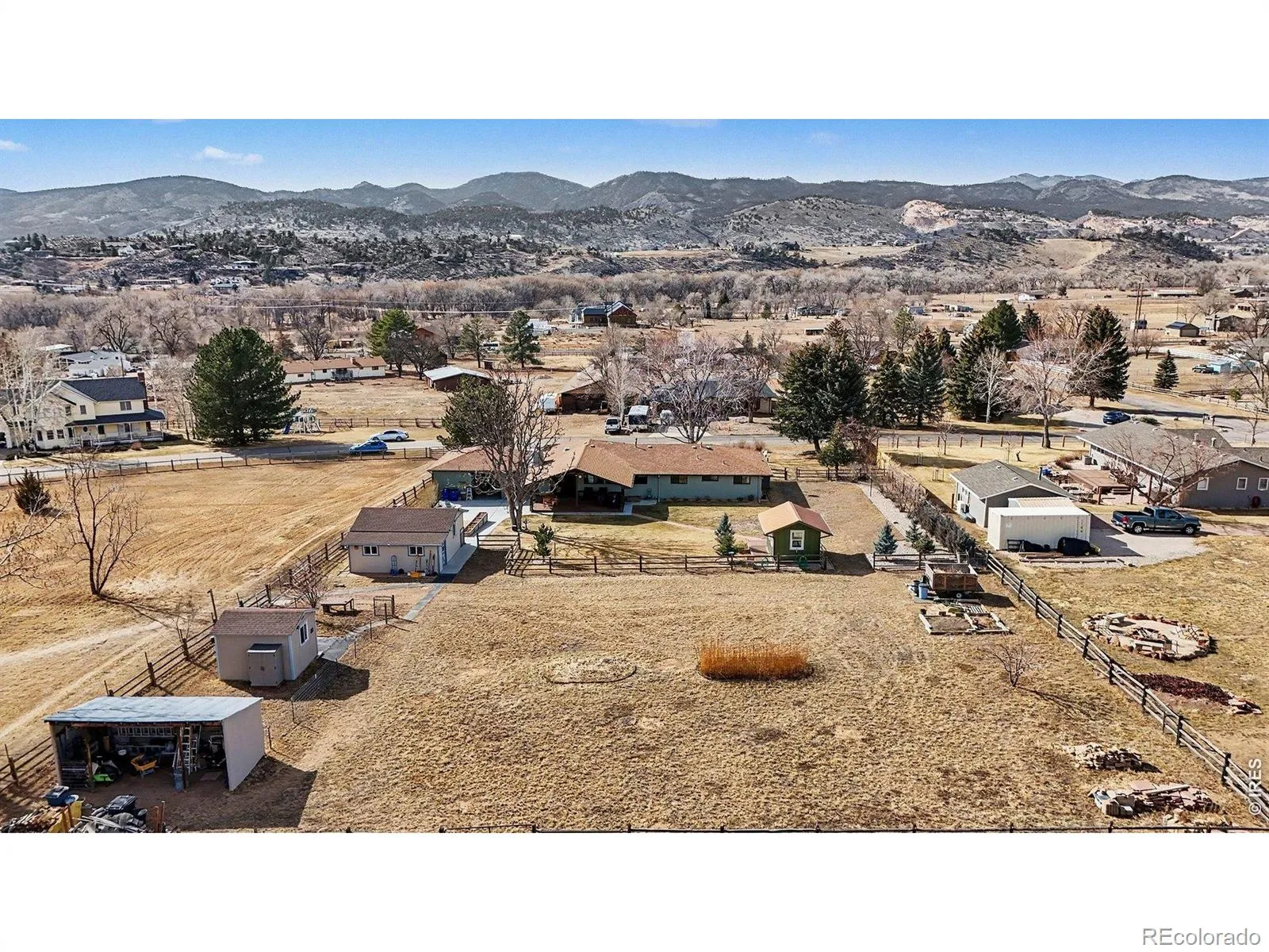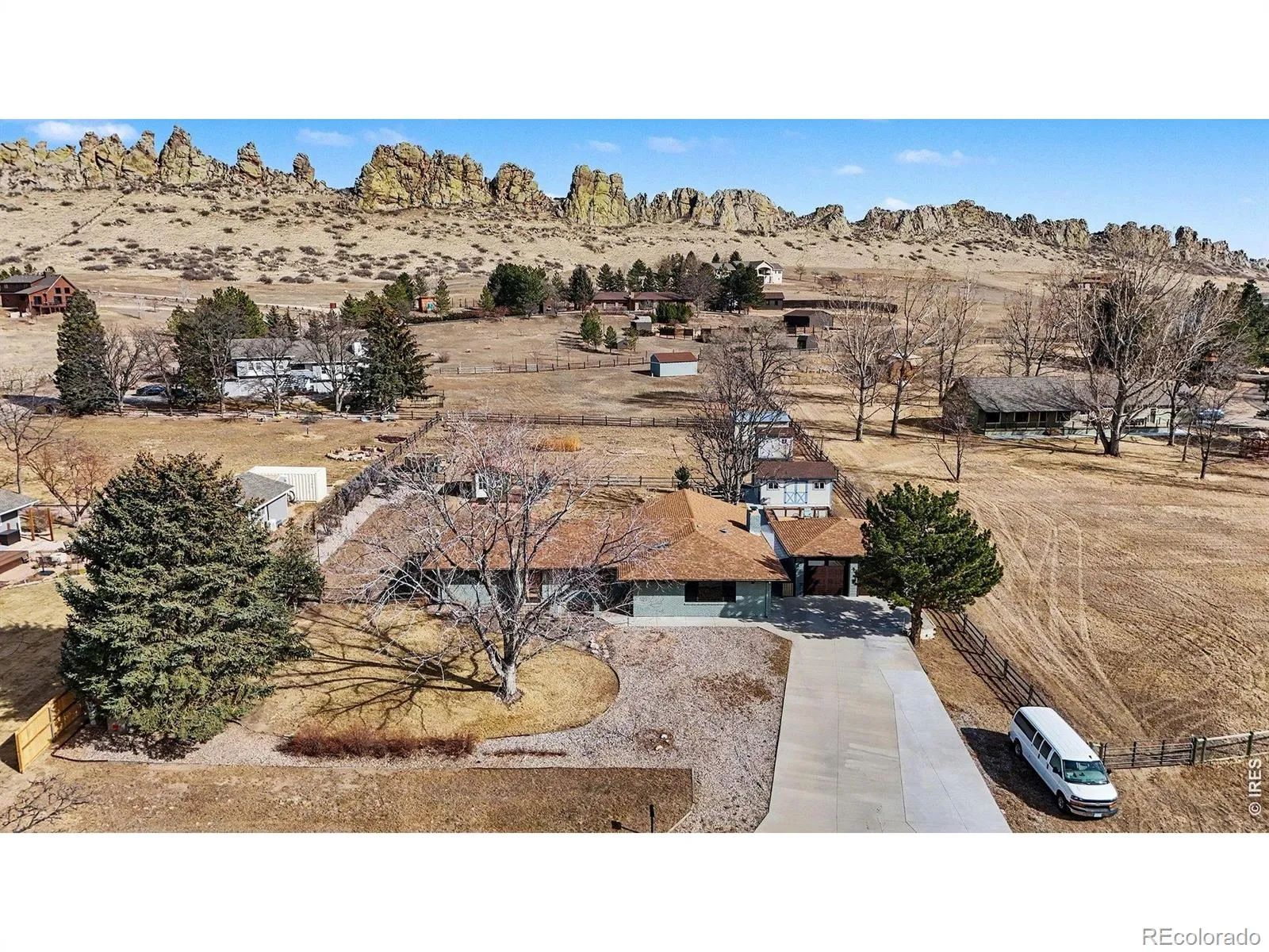 Mountain views from the front porch and unobstructed views of Devil’s Backbone from the backyard – this is the Colorado dream.Perfectly positioned to capture both sunrise mountain views and dramatic evening sunsets over open space, this fully renovated property blends lifestyle, quality craftsmanship, and functionality.Bring your horses – county allows up to two – with a fenced pasture, loafing shed, and tack room already in place.Inside, the home has been thoughtfully upgraded throughout. The kitchen features custom Tharpe cabinetry, quartz and soapstone countertops, and updated lighting. All walls and ceilings have a Level 5 smooth finish, complemented by high-grade LVP flooring and stained knotty alder interior doors.Major system improvements include all new windows, a new HVAC system with heat pump (less than one year old), tankless water heater, new recessed lighting, and fully remodeled bathrooms with updated electrical and plumbing.Natural light fills the home through two sun tunnels and a skylight.Outdoor living shines with a 450 sq ft covered deck, new concrete work, and a detached 10×12 office. Multiple storage structures provide flexibility, including an insulated 10×12 Tuff Shed and additional outbuildings equipped with solar lighting.The oversized garage is fully insulated and features triple-insulated doors and windows, LED lighting, a heater, and air lines for a compressor.This is not just a renovated home – it’s a turnkey Colorado lifestyle property with mountain views in front, Devil’s Backbone views behind, and infrastructure already in place.