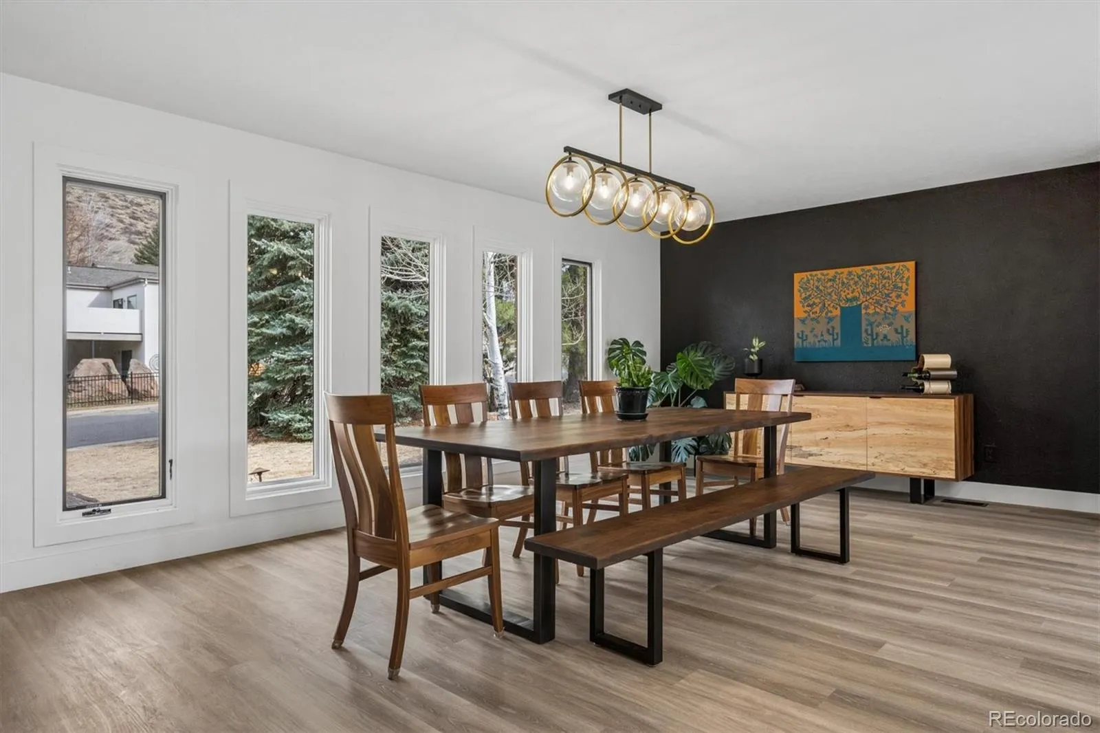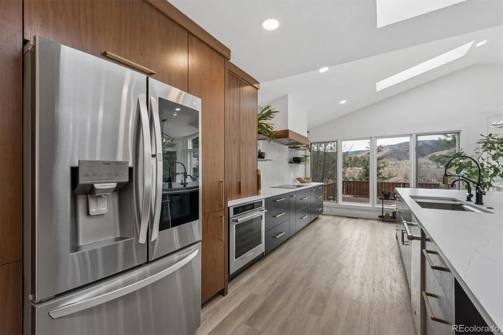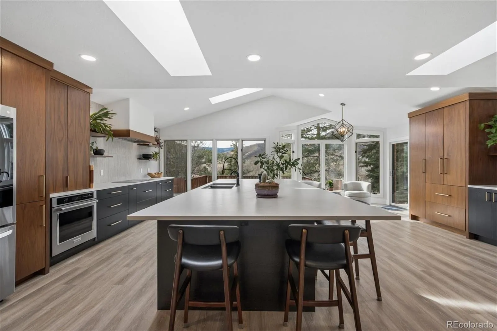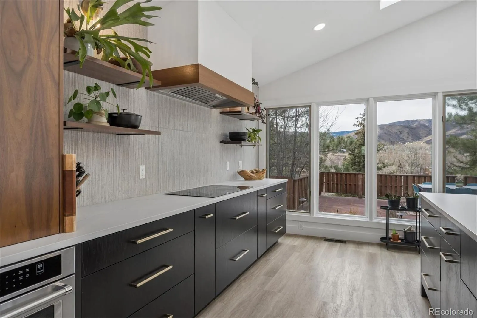 Nestled at the base of North Table Mountain, this newly renovated single-family home delivers front-row mountain views and elevated modern living in Golden. With 3 bedrooms, 3 bathrooms, and a thoughtful open-concept design, every detail has been curated for comfort, style, and connection to Colorado’s natural beauty. As you enter the home, you are greeted by a spacious, light-filled space with stunning views. The impressive chef’s kitchen features a generous island with seating, sleek finishes, warm wood cabinetry, and abundant natural light. It flows seamlessly into the living and dining space—perfect for entertaining and everyday living. Each bathroom feels like a private retreat, with a glass-enclosed shower, refined finishes, and a serene soaking tub that brings spa-level comfort into your daily routine. Expansive windows and vaulted ceilings flood the home with natural light while perfectly framing the surrounding foothills. Whether you’re hosting friends or enjoying a quiet morning coffee, the ever-changing mountain scenery becomes part of your everyday experience.