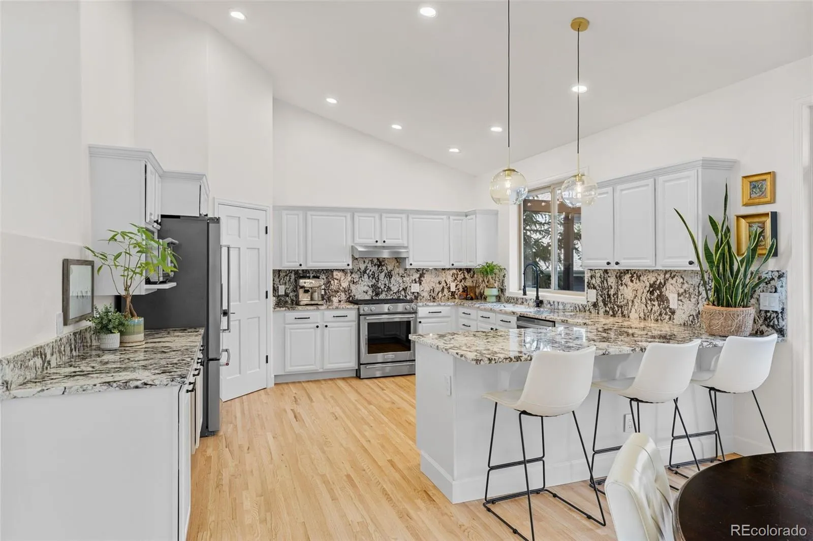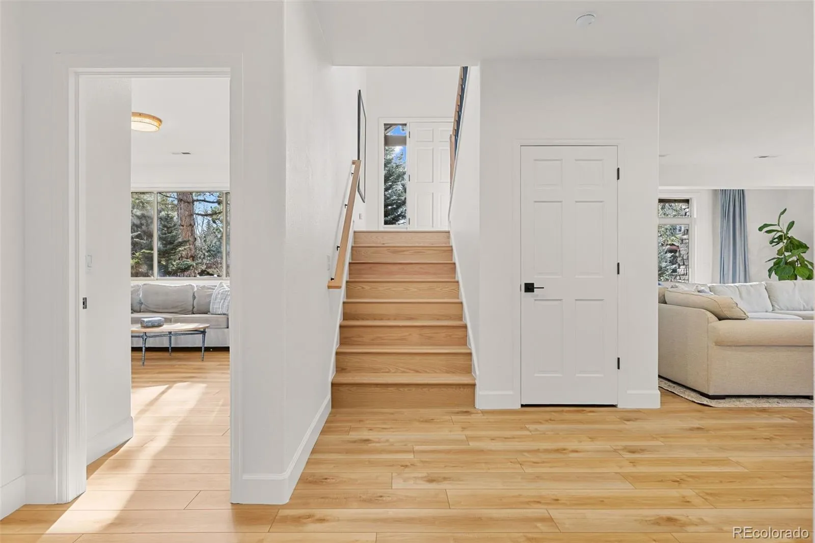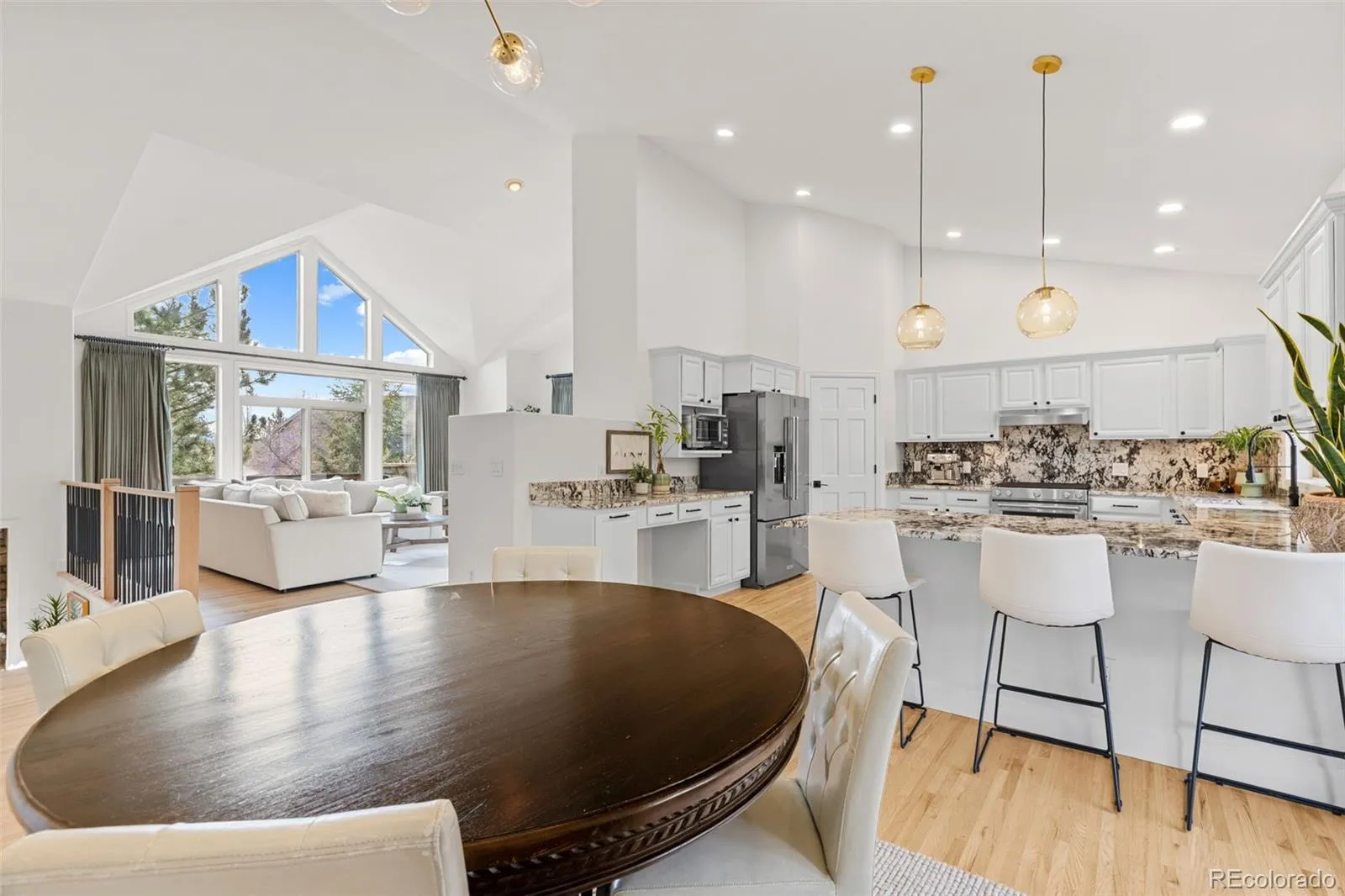 Situated on a quiet corner lot w/ mature trees, a spacious fenced yard, and a 3-car garage, this completely remodeled 5-bedroom, 3-bath thoughtfully designed home is in Evergreen’s most coveted North Evergreen neighborhoods, in The Trails at Hiwan. The craftsmanship is obvious: a custom staircase w/ new red oak treads and iron balusters, new and refinished solid wood floors, fresh paint, updated doors + trim, custom baseboards, and updated light fixtures. The vaulted great room is anchored by a stone gas fireplace, refinished hardwood floors, and oversized lightly tinted windows that capture the mountain views, light, and pines The updated kitchen features new granite countertops and backsplash, sink and modern faucet, KitchenAid refrigerator and range with a new gas line installed, under sink water filter, freshly painted cabinetry, new hardware and spacious dining room. The main level includes a tranquil primary suite, walk-in closet, new Mohawk SmartStrand carpet and updated lighting, and an updated 5-piece bath w/ (in-floor radiant heated) separate tub and shower, plus two secondary bedrooms and a full hall bath w/ inflow radiant heat. The walkout lower level includes a large family room, another gas fireplace, and brand new Lifeproof luxury vinyl plank flooring. Two additional bedrooms, an updated guest bathroom, and a dedicated laundry area with new Samsung washer and dryer, ideal for guests, teens, or multigenerational living. New Bosch HVAC system including furnace, heat pump, air conditioning, and whole-home humidifier. Schlage smart locks + MyQ-enabled garage doors. A fully fenced yard w/ irrigation, fresh Colorado Kentucky Bluegrass sod, mature native perennials, a flagstone firepit area, + multiple decks and patios. Neighborhood lakes and approximately 47 acres of dedicated neighborhood open space, with internal trails that weave through the community for daily walks. Access to Elk Meadow Open Space, Buchanan Recreation Center, Bergen Park shopping area.