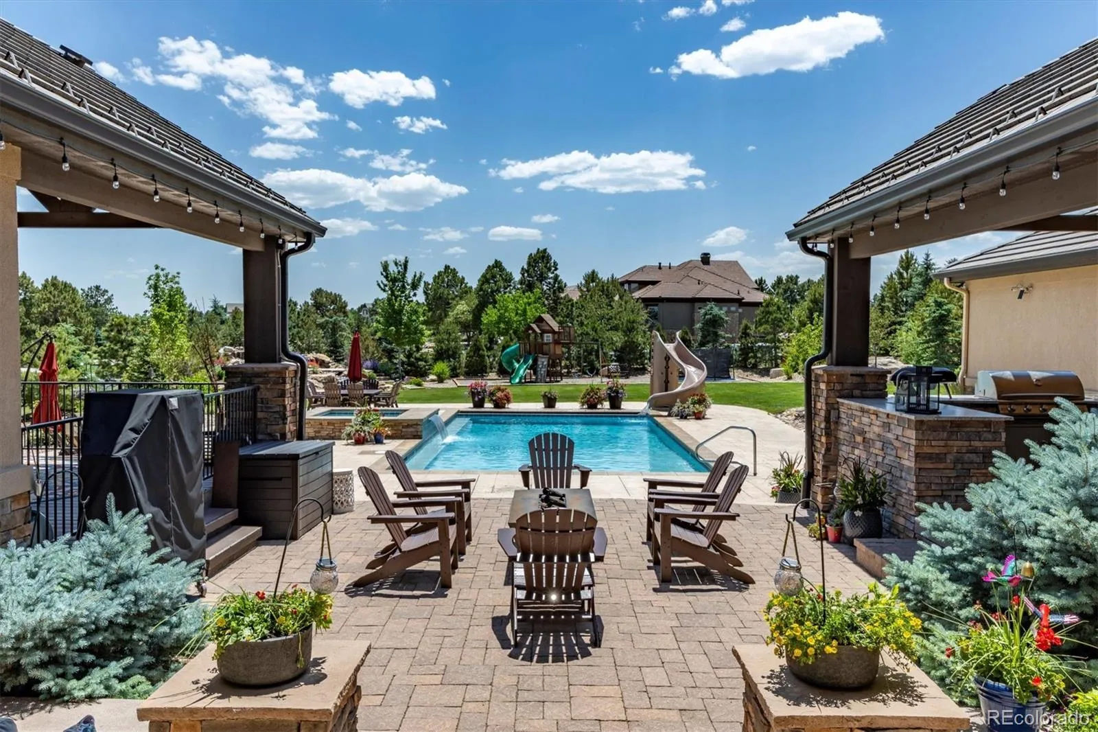 Step outside to discover your personal backyard oasis, complete with an in-ground pool, a hot tub and a waterslide, a waterfall feature, an in-ground trampoline, and a play gym. The outdoor kitchen is equipped with heaters and ambient lighting, and mounted TV, perfect for entertaining year-round. The property is further enhanced by 103 trees, providing privacy and tranquility, it is also a smart house, where all lights can be controlled by one simple pad.