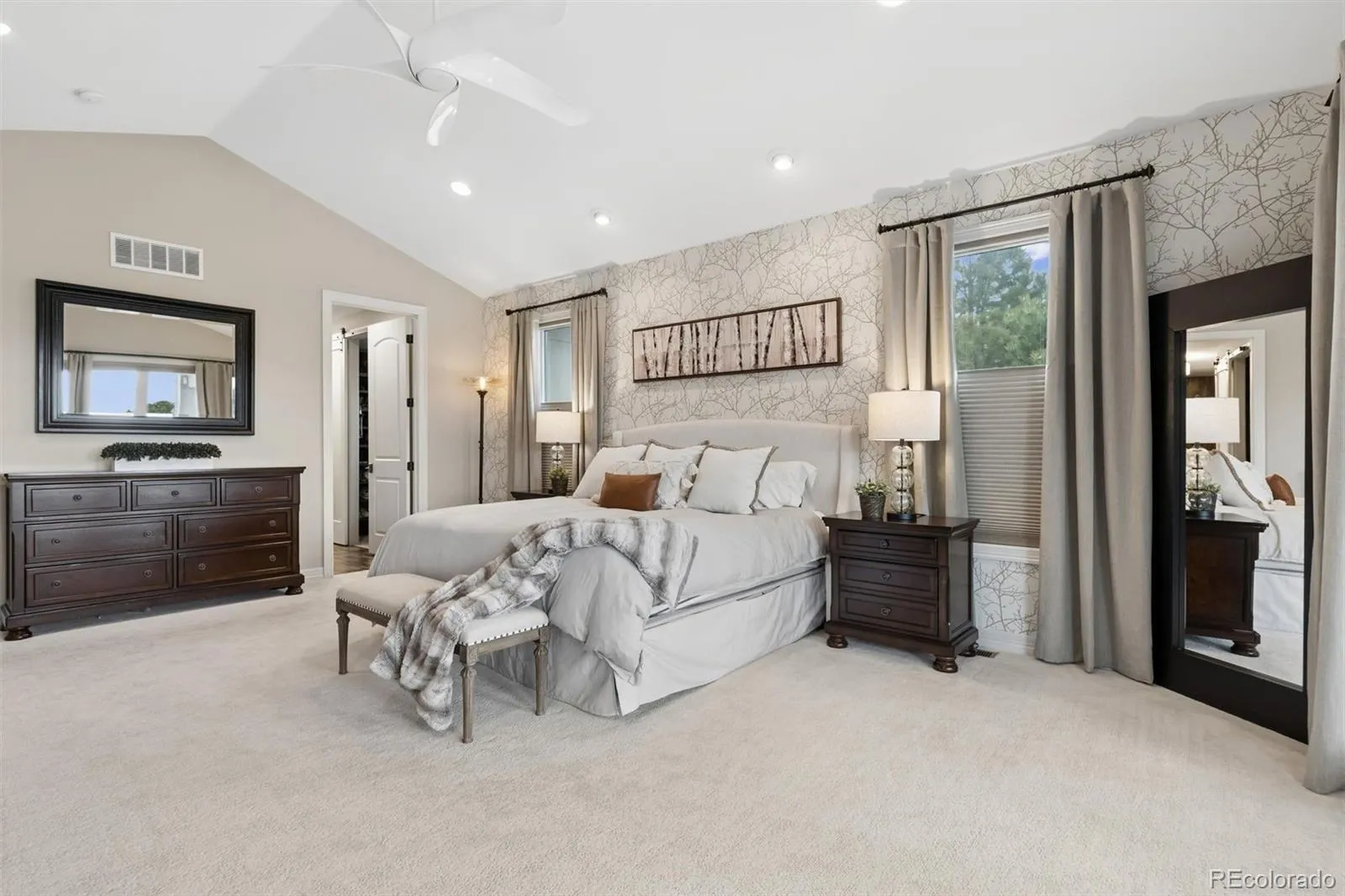 While the main floor master suite offers a private patio, gas fireplace, dual custom closets, and a luxurious bathroom complete with two vanity sink areas, a walk-in shower, standalone tub, and remote controlled custom blackout blinds, ascend to the upper level, where three additional bedrooms each boast their own en suite bathrooms. Relax and watch a movie, or grab a book in the cozy loft area, which also serves as a fantastic homework space.
