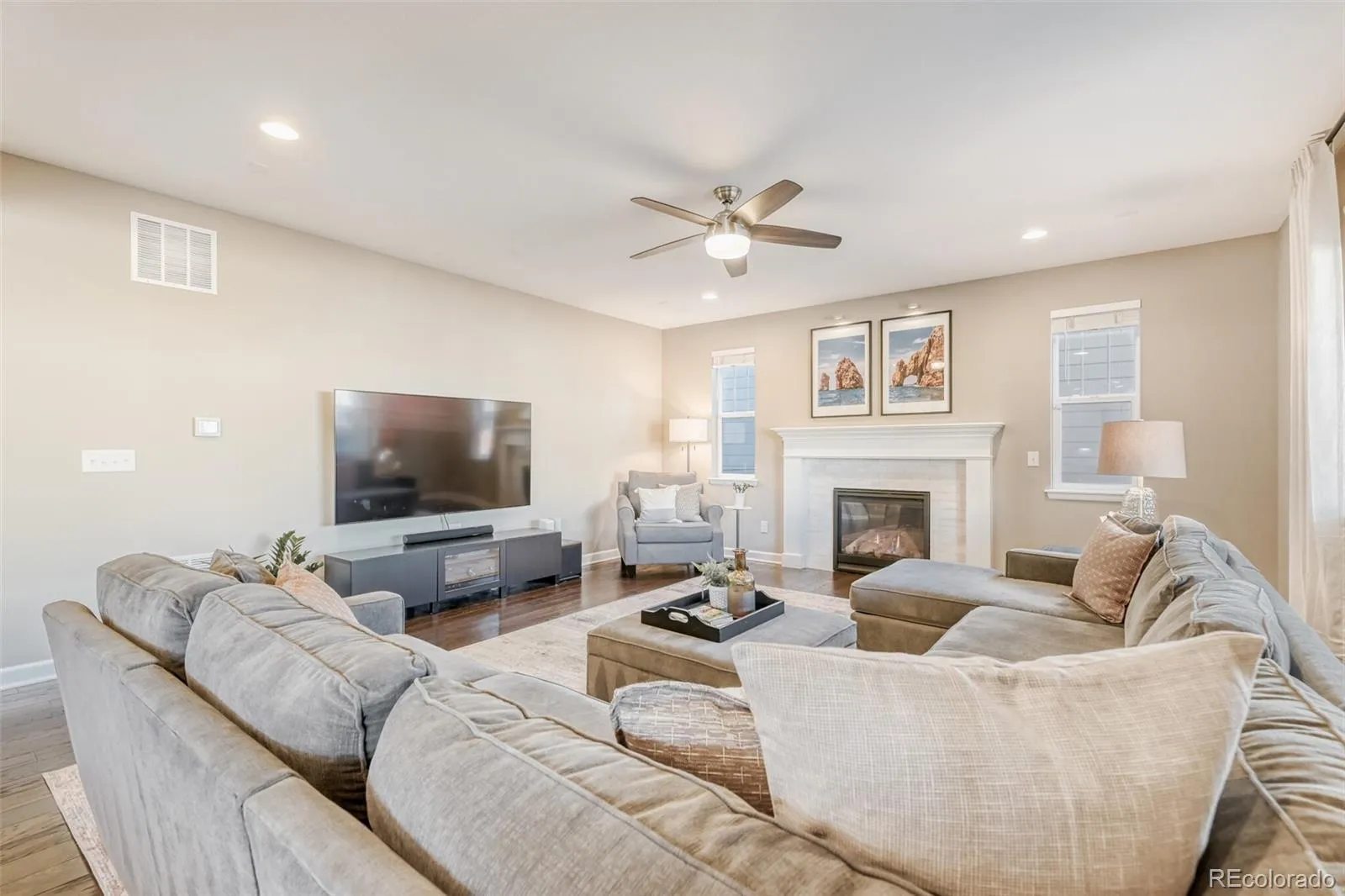 Welcome home to 14368 Double Dutch Cir, an exceptional south-facing Craftsman-style home in the highly desirable Stepping Stone community in Parker, CO. A charming front porch welcomes you into a warm and inviting entry, where a formal dining room with tray ceiling and bay window creates an elegant first impression. Gorgeous hardwood floors lead into the heart of the home—a bright, open-concept kitchen that truly stands out as an entertainer’s dream, featuring white cabinetry, an oversized statement island, granite countertops, a five-burner gas cooktop, stainless steel appliances including double ovens, and a walk-in pantry. The kitchen opens seamlessly to the great room w/ gas fireplace, perfect for cozy nights in and the breakfast nook/sunroom, which flows to a covered patio, ideal for indoor–outdoor living. The main floor also includes a private office w/walk-in closet, and adjacent half bath, plus a functional mudroom/closet and access to the three-car garage. Upstairs, the oversized primary suite features tray ceilings, backyard views, and a five-piece en-suite bath with soaking tub, walk-in shower, and dual walk-in closets. A charming light-filled loft provides flexible living space. Additional 3 bedrooms share a full bath w/double vanity near upstairs laundry. The professionally finished basement offers high ceilings, two bedrooms, a full bath with walk-in shower, expansive flexible living/game room space, ample storage, and plumbing for a future wet bar. Enjoy neighborhood trails, community amenities, and a short walk to the private pool. This home is a must-see!