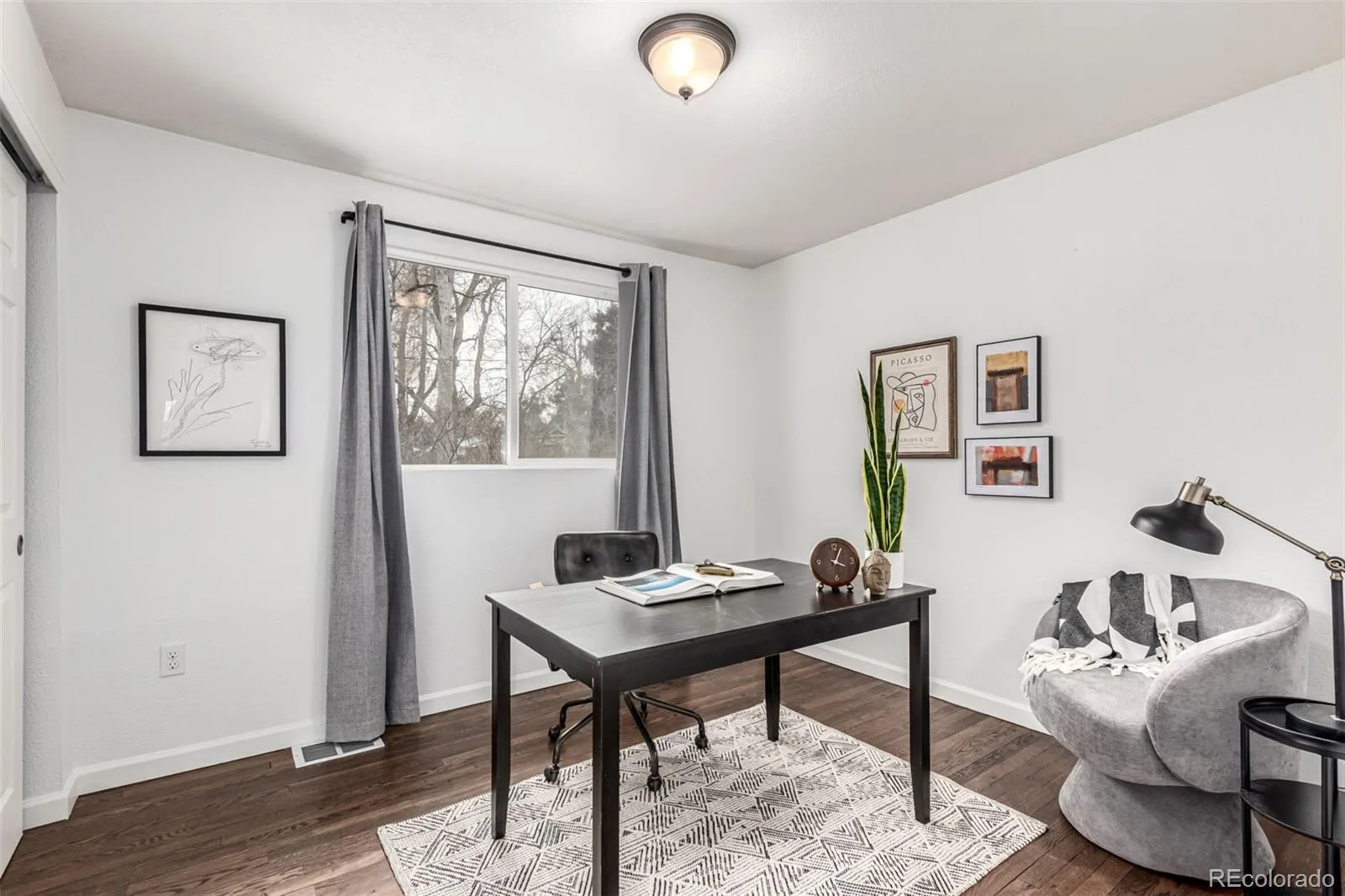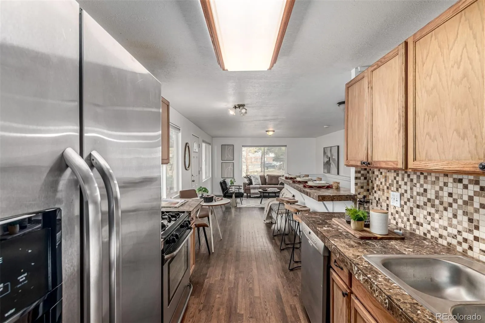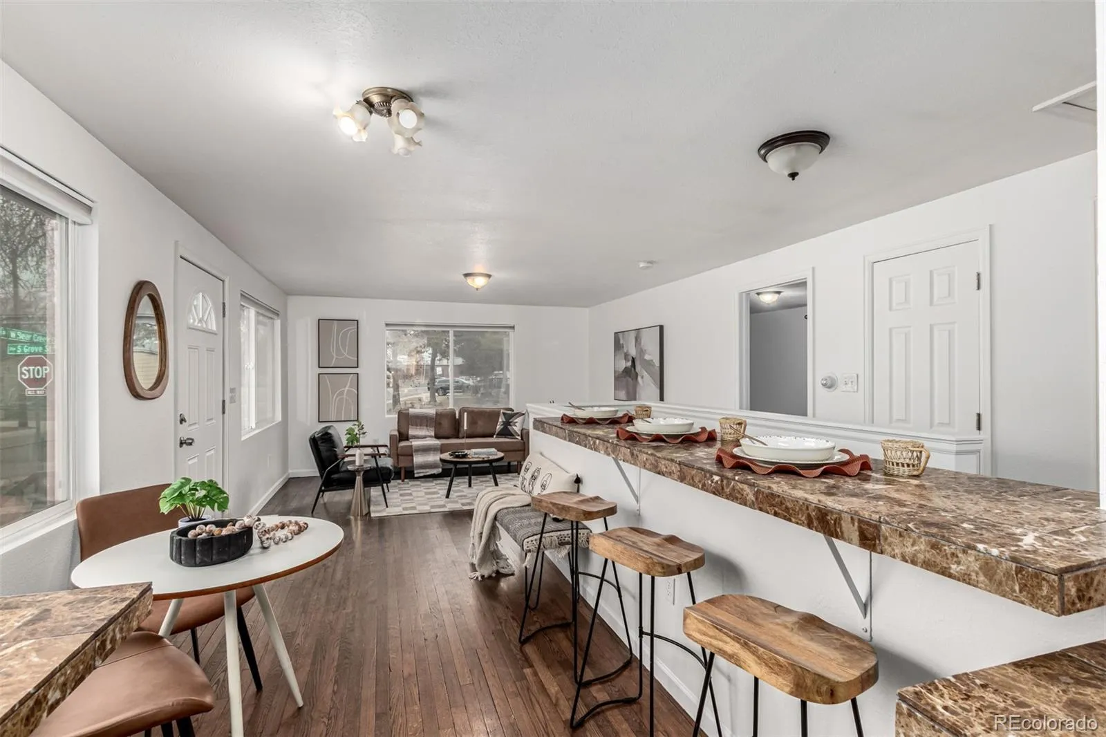 Fall in love with this delightful home on a highly desired corner lot! Featuring a convenient garage + extended driveway for your vehicles. The welcoming living room sets the tone for relaxed evenings, while the dining area is ready to host everything from casual breakfasts to festive dinners. Galley kitchen shines with wood cabinetry, generous counter space, mosaic backsplash, fluorescent lighting, and SS appliances. You’ll find two sizable bedrooms and a full bathroom on the main level! Downstairs, the spacious primary suite has a barn sliding door opening to a private bath with dual sinks and a tiled shower. The basement also includes a family area perfect for entertaining! Enjoy the CO weather all year round in the fantastic sun room boasting wood ceiling and walls. The peaceful yard offers a fence throughout the perimeter, a convenient storage shed, green grass, and so much play space. Ideally located near popular dining spots, everyday conveniences, and freeway access for effortless commuting, this home delivers charm, comfort, and connection all in one. Welcome home!