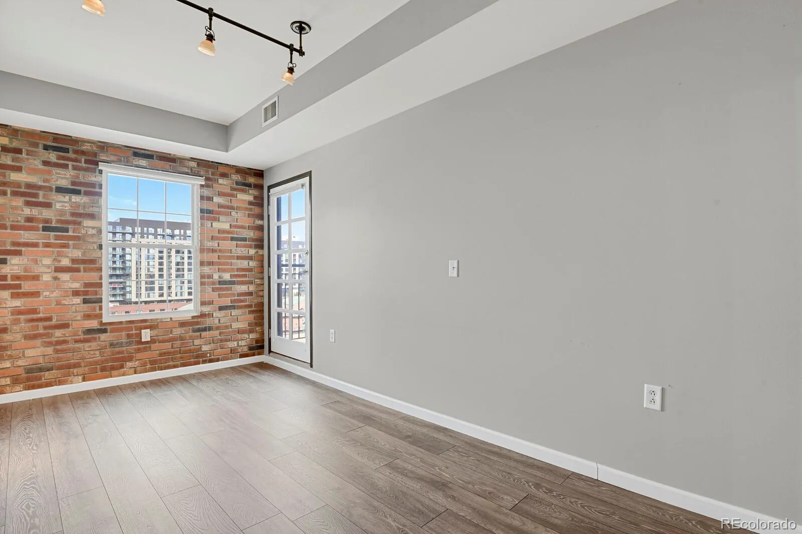 Stylish finishes include dark cabinetry, slab granite countertops, and brick veneer accent walls for a chic, urban feel. Recent updates feature Evoke Surge waterproof wood composition flooring in “Walker” (12/2020), fresh Benjamin Moore Revere Pewter walls, Benjamin Moore Steam trim, doors and baseboards, and Sherwin Williams Aspen White ceilings.