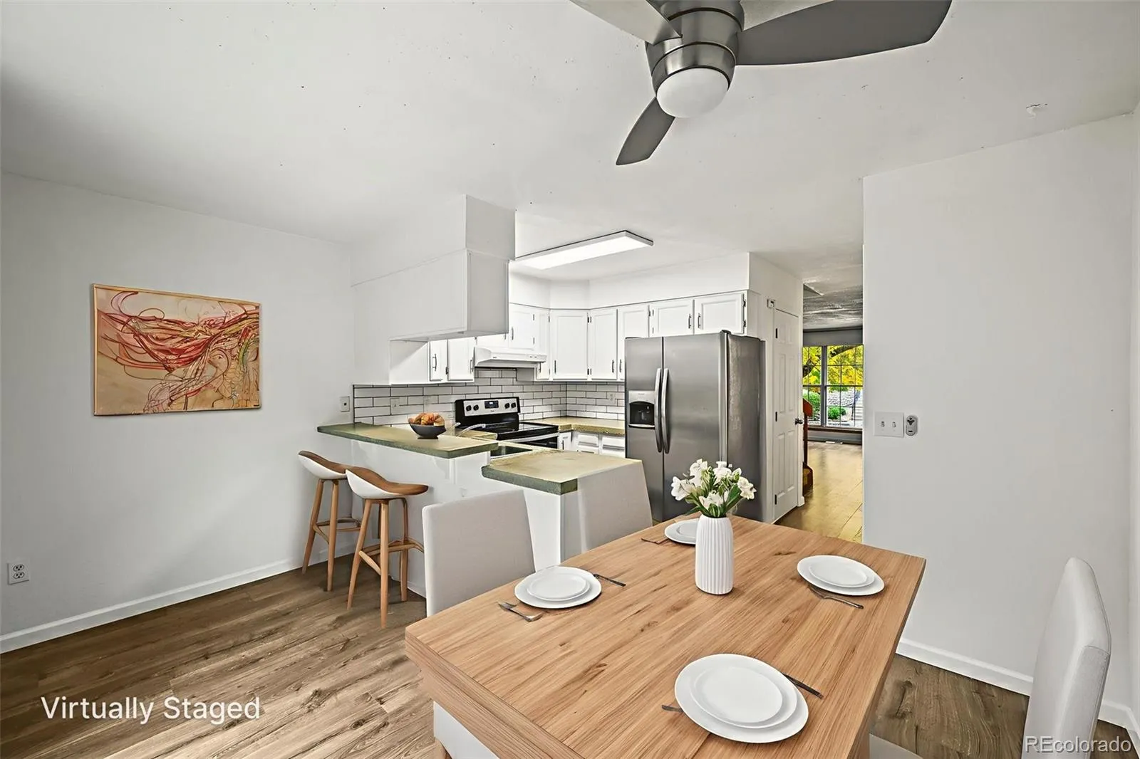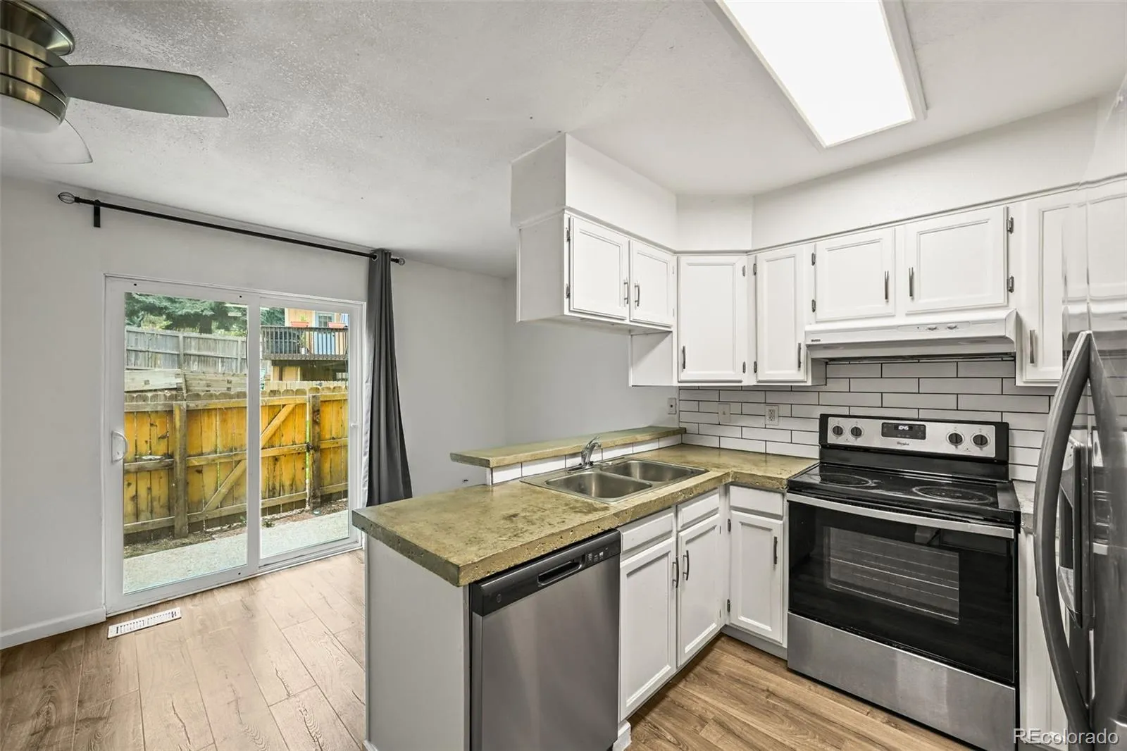 Welcome home to zero-maintenance living in this renovated, turnkey townhouse in Centennial, offering over 1,400 square feet of functional living space in an ideal location. Beautiful laminate hardwood floors, fresh interior paint (2026), and an open floor plan greet you upon entry. The wood-burning fireplace with a stacked-stone surround brings both warmth and texture to the sizeable living area. Enjoy preparing meals in the updated kitchen, which includes a stainless steel appliance package, white-painted cabinetry, concrete counters, and an inviting breakfast bar. The main level features a power bathroom that is updated with a new (2026) vanity. Step outside to a private patio for al fresco summer dining. The bonus shed offers space for seasonal storage or for tools and toys. Upstairs, new carpet (2026) extends into a generously sized second bedroom and the primary suite, each complete with updated ensuite bathrooms and new (2025) vanities. The finished lower level also has brand new carpet (2026) and is an ideal den or non-conforming 3rd bedroom with dual closets and an updated bathroom. The large laundry/utility room offer ample storage space. Highland View Townhomes just replaced the roof (2022) and includes an outdoor community pool, along with ample parking for guests. Ideally located within minutes of shopping, dining, and the Streets of Southglenn, with easy access to C-470 and major roadways. This home is ready for its next chapter; all it needs is you! Schedule your showing today!