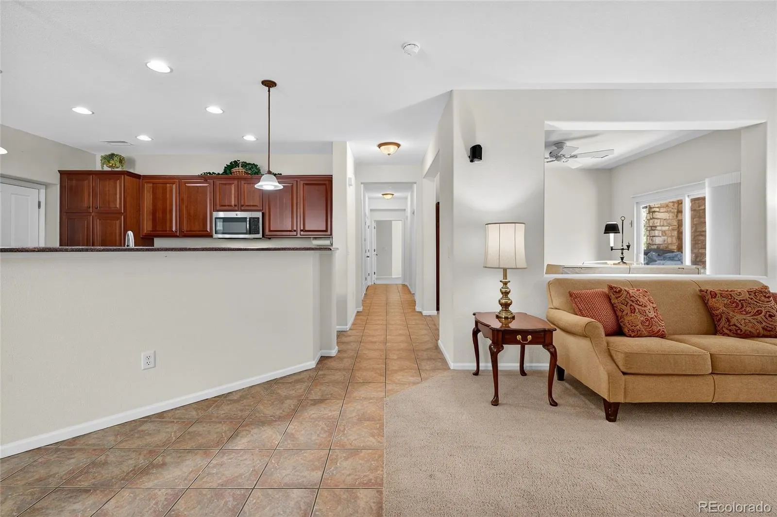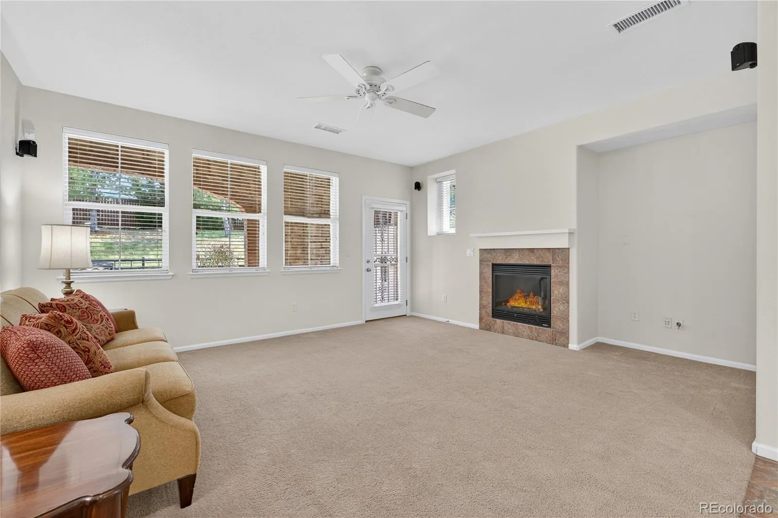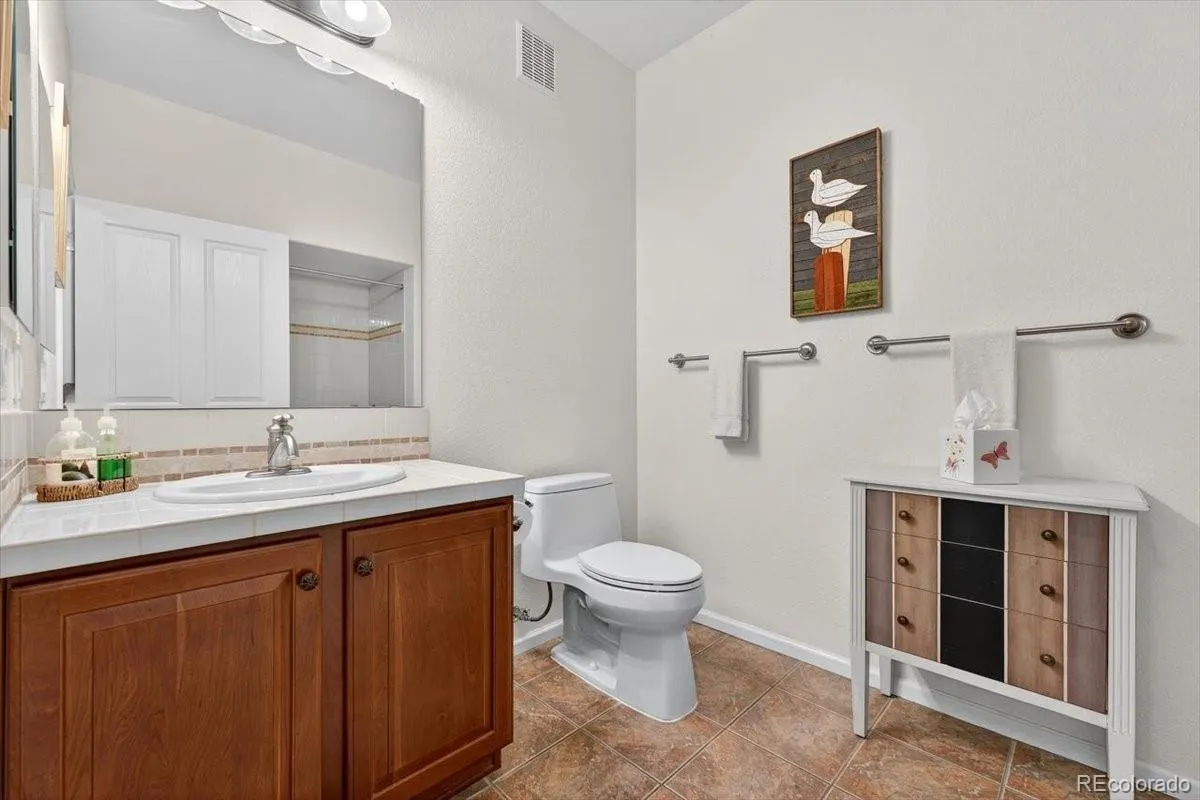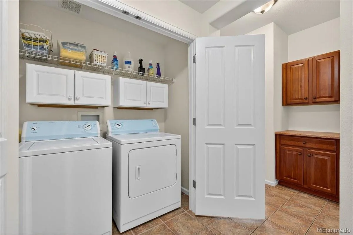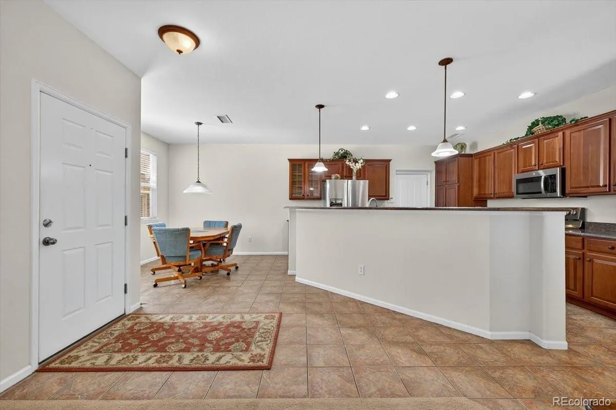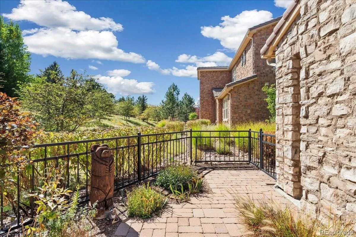Luxurious one-level living at its finest awaits in this townhome with mountain views in the community, perfectly situated in a prime Highlands Ranch location. This highly desirable main floor end unit offers privacy, tranquility, and convenience all in one. A secluded fenced patio with a garden area and an electric retractable awning creates the perfect outdoor retreat, while the quiet neighborhood is enhanced by neighbors who look out for one another. Inside, the open layout welcomes you with a cozy gas fireplace, a den plus a living room, and direct access to the expansive brick patio from both spaces. The chef’s kitchen is beautifully designed with warm wood cherry cabinetry, upgraded stainless steel appliances, a pantry with sliding drawers, and a convenient door leading directly to the garage. Two spacious bedrooms provide comfort, with the primary suite featuring plush carpeting, a large walk-in closet, and a fantastic 5-piece en-suite bath. Additional highlights include newer furnace and hot water heater, custom kitchen cabinets and drawers, epoxy garage floor with abundant built-in storage, and surround sound system with mounted speakers in the family room. Minutes from King Soopers, shops, dining, and major roads, this move-in-ready gem offers the perfect blend of comfort and location.