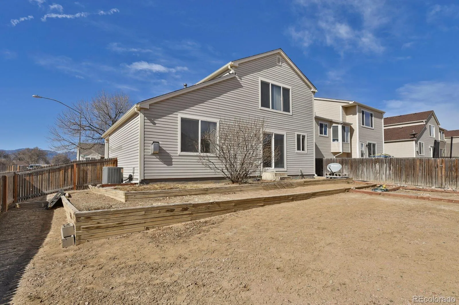 New Roof 2025! This 3-bedroom, 2 ½ bathroom, 2 car garage home is ideally located only a mile from Mesa Ridge Parkway amenities and perfectly situated for convenience and community! Corner lot with fenced backyard, rocked landscape at front and clean slate at the backyard to design your own outdoor space. Covered front porch entry. Vinyl siding. Neutral interior throughout, high ceiling & gas fireplace at the living area. The kitchen has a pantry & dining combo with slider to the backyard. Laundry room between the garage and the kitchen. All bedrooms up, primary bedroom with a private ensuite bath. Central AC to keep you cool. While it needs some updating, this presents an excellent opportunity for customization and personalization to transform this property into a comfortable home in a great location that’s near schools, parks, shopping and several military bases!