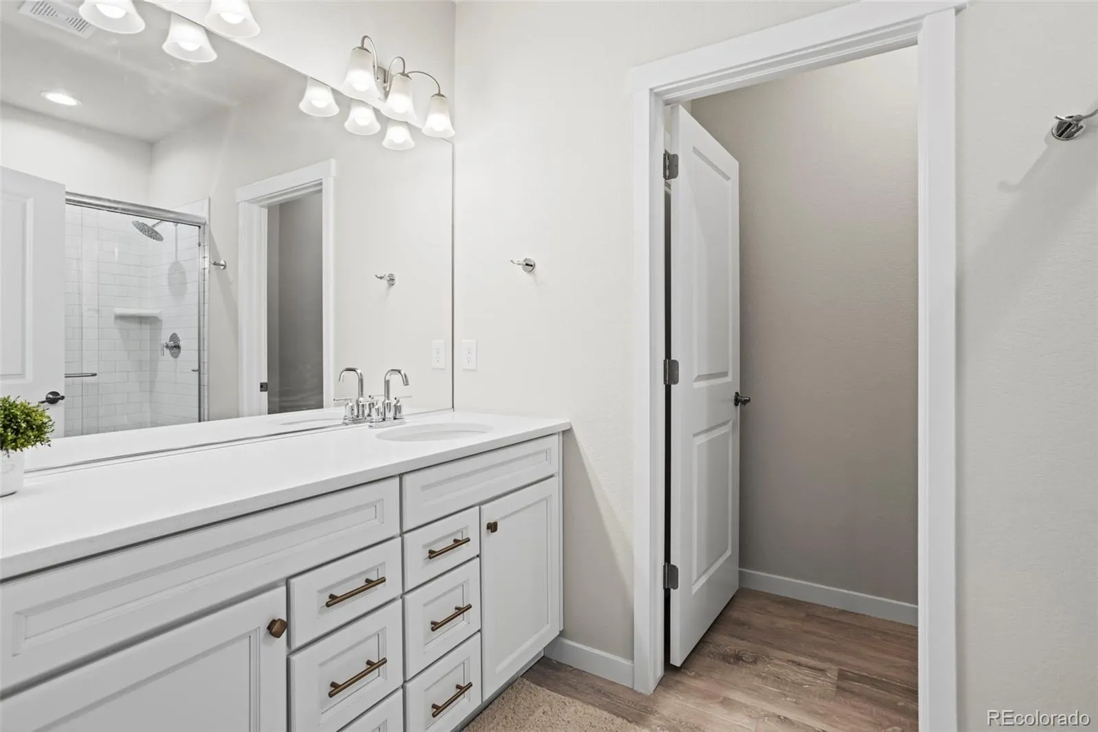 The main-level primary suite is a serene retreat. The primary bathroom features a large shower with dual shower heads, a built-in bench, dual vanities, and a spacious walk-in closet with organizers.