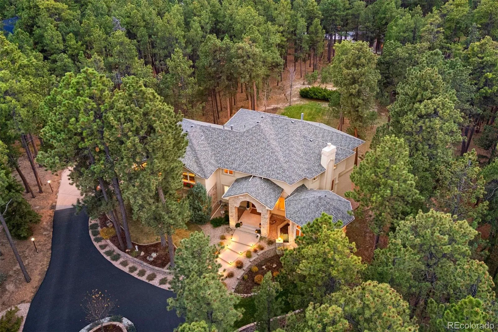 Elegant and stately 7,000+ sq ft custom home with striking curb appeal positioned on a stunning 2.6 acre parcel, majestic Pikes Peak Views, towering ponderosa pines, manicured landscaping w/ lighting, abundance of flowers, aspens and mature blue spruce. Located in sought after Higby Estates of Monument w/ exceptional D38 Schools and quick access to the best amenities, I-25 and Colorado Springs or Denver. A grand foyer w/ towering 24 foot vaulted ceilings, curved staircase. Expansive great room w/ a wall of windows, 2-story vaulted ceilings, views, automatic window coverings, juliet balcony, gas fireplace and custom built-ins. Main level turret library w/ limestone fireplace, large bay window frames the exterior wall flooded w/ natural light and serene views of the forest, cherry built-ins. Five ensuite bedrooms (4 on the upper level) and 6 baths. Sitting room w/ Broadmoor inspired wood fireplace w/ spectacular limestone surround, hardwood floors, crown molding – open to a spacious dining room w/ floor to ceiling windows. Gourmet kitchen w/ high quality cherry cabinetry, granite counters, island w/ seating, Wolf gas cook-top, French door oven, wine fridge and commercial refrigerator. Stamped concrete deck off w/ metal railing and stone pillars and awning. Primary suite w/ sweeping Pikes Peak and forest views, sitting area, automatic blinds, double sided fireplace, dual walk-in closets, bonus attached wellness room and luxurious 5 piece bath w/ marble counters, heated floors, whirlpool tub and over-sized shower. Walk-out lower level perfect for entertaining w/ ensuite bedroom, family room, game room, stunning wood bar, wine cellar and theater room w/ new ultra HD projector and seating. Lower level patio w/ stone gas firepit and hot tub. Architectural series Pella windows, class 4 impact resistant roof, Lennox high eff furnace and AC units, paved asphalt circular driveway, new Quartz counters in most baths, whole house audio system, hardwood floors on main level.