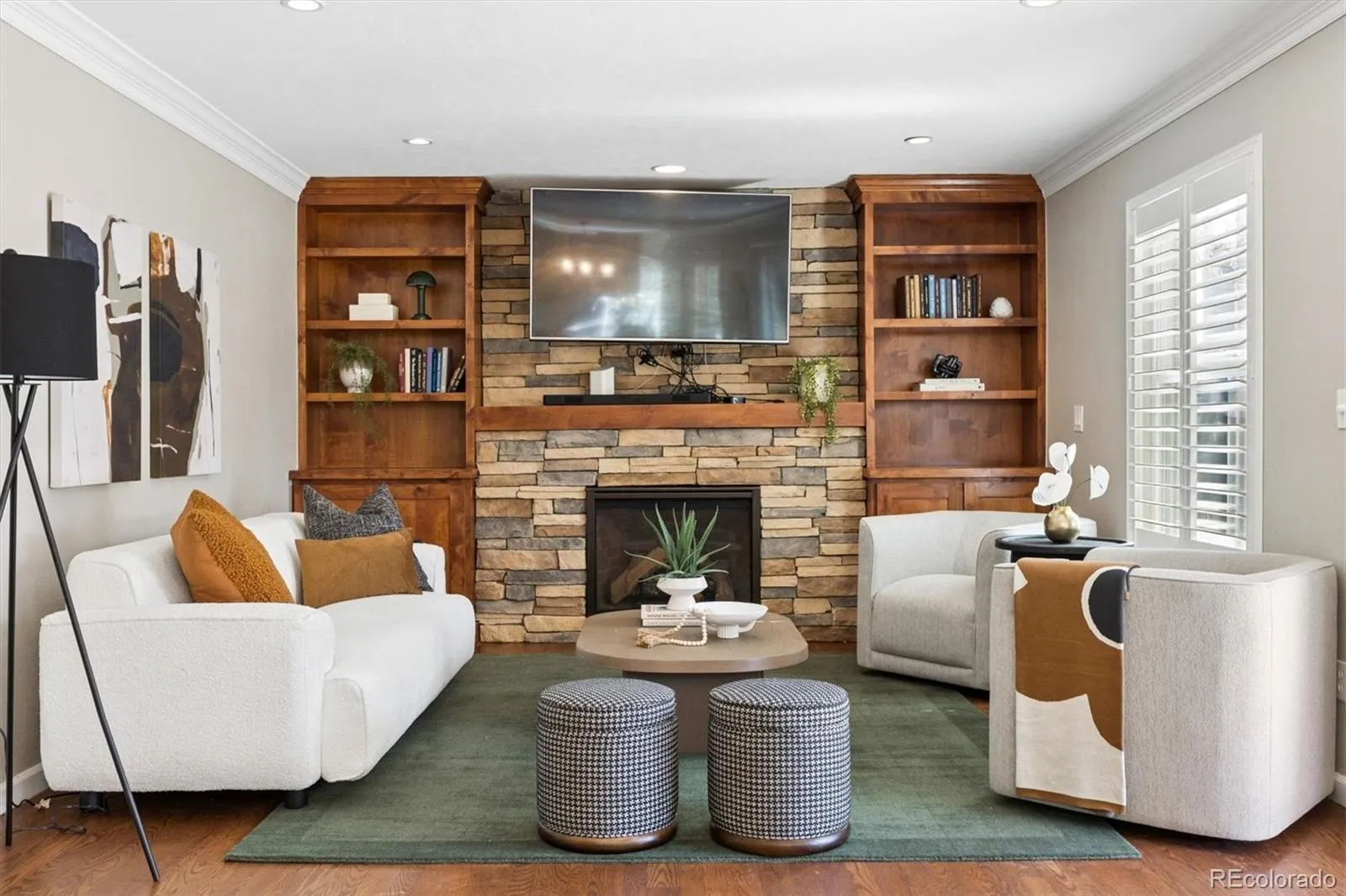 Sunlight fills the interior, highlighting warm hardwood floors and classic plantation shutters. The remodeled open-concept kitchen serves as the heart of the home, featuring granite countertops, custom shaker cabinetry, stainless steel appliances, a gas cooktop with hood, convection microwave, and wall oven. The kitchen flows seamlessly into the dining and living areas, where a gas fireplace with stone surround and built-ins creates an inviting gathering space. A formal dining room or flexible living space and powder bath complete the main level.