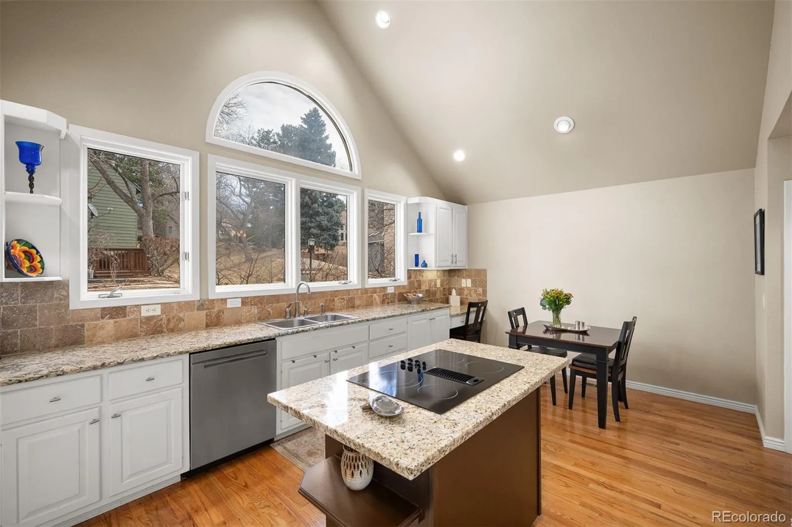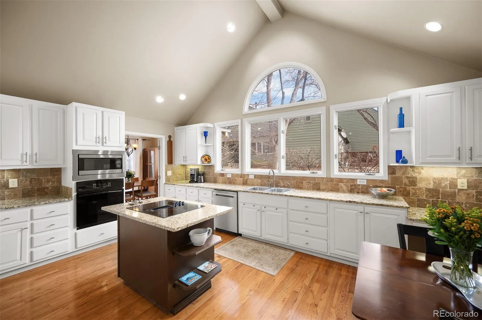 The extra-large eat-in kitchen features expansive windows looking out on one of Stoney Brook’s many lovely greenbelts. It also features vaulted ceilings, an island with cooktop and more-then-enough counter space, cabinets and pantries. With stainless steel appliances, granite countertops and hardwood floors, this kitchen is built to perform.