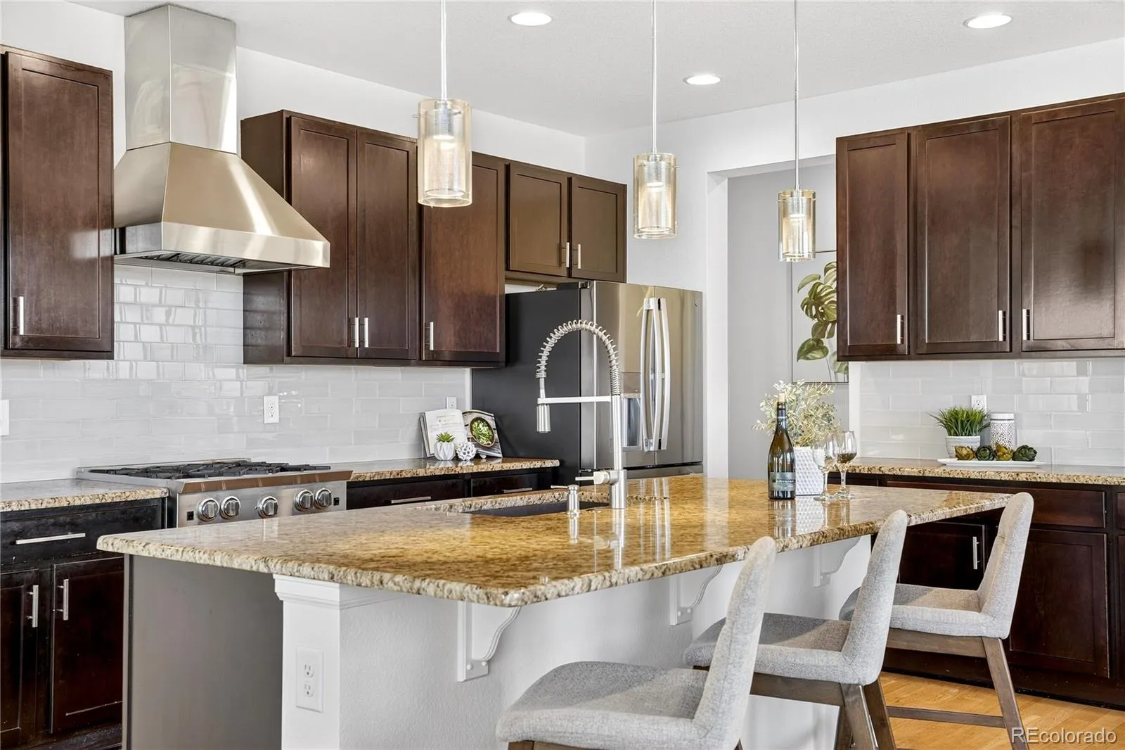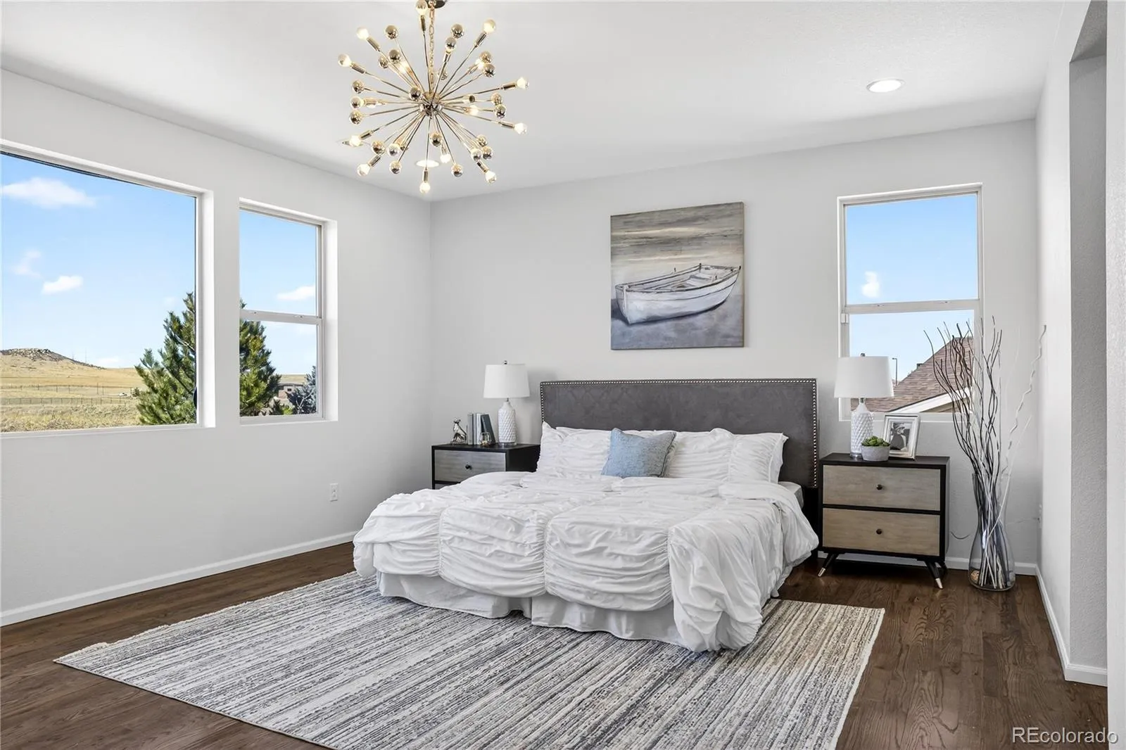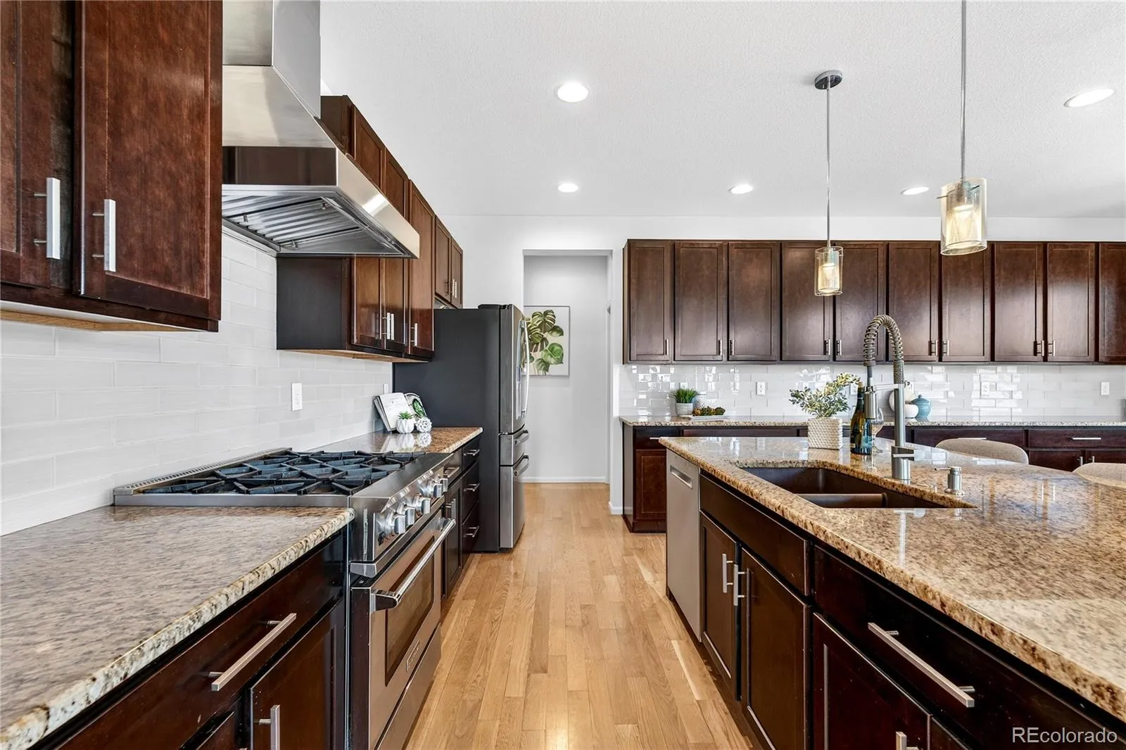 Backing to greenbelt open space in Heirloom, this thoughtfully designed residence balances privacy, scale, and long-term flexibility. The main level features open-concept living with real oak floors, a double-sided fireplace, and a well-appointed kitchen anchored by an oversized island, professional-grade Bluestar gas range with high-performance hood, walk-in pantry, and spacious eat-in area. Fresh interior paint enhances the home’s clean, updated presentation. A true main-floor bedroom includes a fully updated ensuite bath. Upstairs, a loft provides additional living space while secondary bedrooms are positioned for privacy. The finished basement includes a full bath, storage, and a fifth bedroom currently configured as a dedicated home theater adaptable for guests, media, or flex living. Custom-designed and purpose-built, the theater features a premium Focal 11-speaker surround sound system, enhanced soundproof insulation for superior acoustics and sound containment, and elevated finishes that create an immersive, cinema-quality experience. The fully fenced backyard offers sunset exposure, visual buffer, and a notably quiet setting. Located within an amenity-rich community with clubhouse, pool, parks, and trails, plus convenient access to I-25, downtown Parker, and the Rueter-Hess Incline.